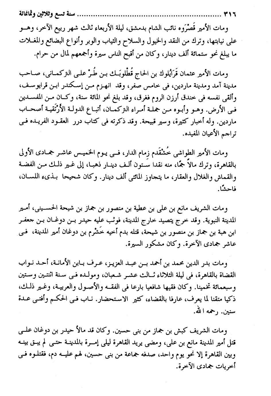 وَمَات الْأَمِير قَصرَوه نَائِب الشَّام بِدِمَشْق لَيْلَة الْأَرْبَعَاء ثَالِث شهر ربيع الآخر وَهُوَ على نيابتها وَترك من النَّقْد والخيول وَالسِّلَاح وَالثيَاب والوبر وأنواع البضائع والمغلات مَا يبلغ نَحْو سِتّمائَة ألف دِينَار وَكَانَ من أقبح النَّاس سيرة وأجمعهم لمَال من حرَام. وَمَات الْأَمِير عُثْمَان قَرَا يلوك بن الْحَاج قُطْلوبَك بن طُرْ على التركماني صَاحب مَدِينَة آمد ومدينة ماردين فِي خَامِس صفر وَقد انهزم من اسكندر ابْن قرا يُوسُف وَألقى نَفسه فِي خَنْدَق أرزن الرّوم فغرق وَقد بلغ نَحْو الْمِائَة سنة وَكَانَ من المفسدين فِي الأرضْ. وَهُوَ وَأَبوهُ من جملَة أُمَرَاء التركمان أَتبَاع الدولة الأرْتَقية أَصْحَاب ماردين. وَله أَخْبَار كَثِيرَة وسير قبيحة. وَقد ذكرته فِي كتاب دُرَر الْعُقُود الفريده فِي تراجم الْأَعْيَان المفيدة. وَمَات الْأَمِير الطواشي خُشْقَدم زِمَام الدَّار فِي يَوْم الْخَمِيس عَاشر جُمَادَى الأولى بِالْقَاهِرَةِ وَترك مَالا جماً مِنْهُ نَقْدا سِتُّونَ ألف دِينَار ذَهَبا إِلَى غير ذَلِك من الْفضة والقماش والغلال وَالْعَقار مَا يتَجَاوَز المائتي ألف دِينَار. وَكَانَ شحيحاً بذيء اللِّسَان فَاحِشا. وَمَات الشريف مَانع بن عَليّ بن عَطِيَّة بن مَنْصُور بن جماز بن شيحة الْحُسَيْنِي أَمِير الْمَدِينَة النَّبَوِيَّة. وَقد خرج يتصيد خَارج الْمَدِينَة فَوَثَبَ عَلَيْهِ حيدر بن دوغان بن جَعْفَر ابْن هبة بن جماز بن مَنْصُور بن شيحة قَتله بِدَم أَخِيه خَشْرم بن دوغان أَمِير الْمَدِينَة فِي عَاشر جُمَادَى وَمَات بدر الدّين مُحَمَّد بن أَحْمد بن عبد الْعَزِيز عرف بِابْن الْأَمَانَة أحد نواب الْقُضَاة بِالْقَاهِرَةِ فِي لَيْلَة الثُّلَاثَاء ثَالِث عشر شعْبَان ومولده فِي سنة اثْنَتَيْنِ وَسِتِّينَ وَسَبْعمائة تخميناً. وَكَانَ فَقِيها شافعياً بارعاً فِي الْفِقْه وَالْأُصُول والعربية وَغير ذَلِك ذكياً متقناً لما يعرف عَارِفًا بِالْقضَاءِ كثير الاستحضار. نَاب فِي الحكم وأفنى عدَّة سِنِين. رَحمَه الله. وَمَات الشريف كَبْش بن جماز من بني حُسَيْن. وَكَانَ قد مالأ حيدر بن دوغان على قتل أَمِير الْمَدِينَة مَانع بن عَليّ وَمضى يُرِيد الْقَاهِرَة لَيْلَة إمرة بِالْمَدِينَةِ حَتَّى لم يبْق بَينه وَبَين الْقَاهِرَة إِلَّا نَحْو يَوْم وَاحِد صدفه جمَاعَة من بني حُسَيْن لَهُم عَلَيْهِ دم فَقَتَلُوهُ فِي أخريات جُمَادَى الْآخِرَة.