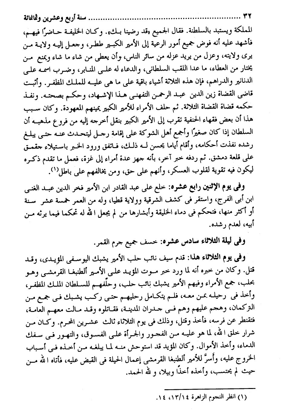 المملكة ويستبد بالسلطنة. فَقَالَ الْجَمِيع قد رَضِينَا بك. وَكَانَ الْخَلِيفَة حَاضرا فيهم فَأشْهد عَلَيْهِ أَنه فوض جَمِيع أُمُور الرّعية إِلَى الْأَمِير الْكَبِير ططر وَجعل إِلَيْهِ ولَايَة من يرى ولَايَته وعزل من يُرِيد عَزله من سَائِر النَّاس وَأَن يُعْطي من شَاءَ مَا شَاءَ وَيمْنَع من يخْتَار من الْعَطاء مَا عدا اللقب السلطاني وَالدُّعَاء لَهُ على المنابر وَضرب اسْمه على الدَّنَانِير وَالدَّرَاهِم فَإِن هَذِه الثَّلَاثَة أَشْيَاء بَاقِيَة على مَا هِيَ عَلَيْهِ للْملك المظفر. وَأثبت قَاضِي الْقُضَاة زين الدّين عبد الرَّحْمَن التفهني هَذَا الْإِشْهَاد وَحكم بِصِحَّتِهِ. وَنفذ حكمه قُضَاة الْقُضَاة الثَّلَاثَة. ثمَّ حلف الْأُمَرَاء للأمير الْكَبِير يمينهم الْمَعْهُودَة. وَكَانَ سَبَب هَذَا أَن بعض فُقَهَاء الْحَنَفِيَّة تقرب إِلَى الْأَمِير الْكَبِير بِنَقْل أخرجه إِلَيْهِ من فروع مذْهبه أَن السُّلْطَان إِذا كَانَ صَغِيرا وَأجْمع أهل الشَّوْكَة على إِقَامَة رجل ليتحدث عَنهُ حَتَّى يبلغ رشده نفذت أَحْكَامه وَأقَام أَيَّامًا يحسن لَهُ ذَلِك فاتفق وُرُود الْخَيْر باستيلاء جقمق على قلعة دمشق. ثمَّ ردفه خبر آخر بِأَنَّهُ جهز عدَّة أُمَرَاء إِلَى غَزَّة فَعمل مَا تقدم ذكره ليَكُون فِيهِ تَقْوِيَة لقلوب الْعَسْكَر وَأَنَّهُمْ على حق وَمن يخالفهم على بَاطِل. وَفِي يَوْم الِاثْنَيْنِ رَابِع عشره: خلع عَليّ عبد الْقَادِر ابْن الْأَمِير فَخر الدّين عبد الْغَنِيّ ابْن أبي الْفرج وَاسْتقر فِي كشف الشرقية وَولَايَة قطيا وَله من الْعُمر خَمْسَة عشر سنة أَو أَكثر مِنْهَا فتحكم فِي وَفِي لَيْلَة الثُّلَاثَاء سادس عشره: خسف جَمِيع جرم الْقَمَر. وَفِي يَوْم الثُّلَاثَاء هَذَا: قدم سيف نَائِب حلب الْأَمِير يشبك اليوسفي المؤيدي وَقد قتل. وَكَانَ من خَبره أَنه لما ورد خبر موت الْمُؤَيد عَليّ الْأَمِير ألطنبغا القرمشي وَهُوَ بحلب جمع الْأُمَرَاء وَفِيهِمْ الْأَمِير يشبك نَائِب حلب وحلفهم للسُّلْطَان الْملك المظفر وَأخذ فِي رحيله بِمن مَعَه فَلم يتكامل رحليهم حَتَّى ركب يشبك فِي جمع من التركمان وهجم عَلَيْهِم وهم فِي جدران الْمَدِينَة فقاتلوه وَقد مَالَتْ مَعَهم الْعَامَّة فتقنطر عَن فرسه فَأخذ وَقتل وَذَلِكَ فِي يَوْم الثُّلَاثَاء ثَالِث عشْرين الْمحرم. وَكَانَ من شرار خلق الله لما هُوَ عَلَيْهِ من الْفُجُور والجرأة على الفسوق والتهور فِي سفك الدِّمَاء وَأخذ الْأَمْوَال. وَكَانَ الْمُؤَيد قد استوحش مِنْهُ لما يبلغهُ من أَخذه فِي أَسبَاب الْخُرُوج عَلَيْهِ وَأسر للأمير ألطنبغا القرمشي إِعْمَال الْحِيلَة فِي الْقَبْض عَلَيْهِ فَأَتَاهُ الله من حَيْثُ لم يحْتَسب وَأَخذه أخذا وبيلاً وَللَّه الْحَمد.
