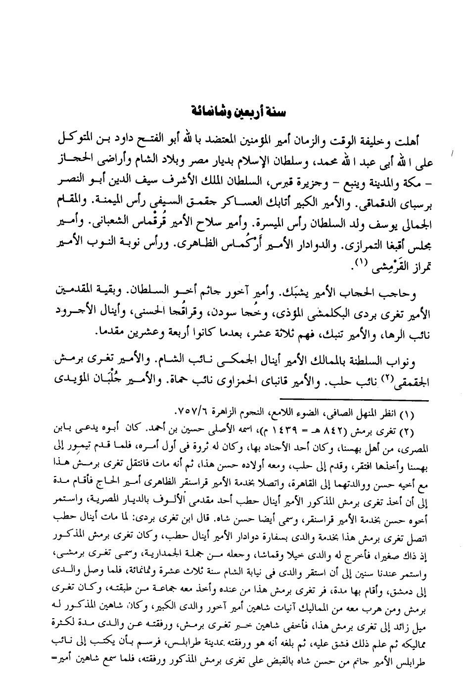 أهلت وَخَلِيفَة الْوَقْت وَالزَّمَان أَمِير الْمُؤمنِينَ المعتضد بِاللَّه أَبُو الْفَتْح دَاوُد بن المتَوَكل على الله أَبى عبد الله مُحَمَّد وسلطان الْإِسْلَام بديار مصر وبلاد الشَّام وأراضى الْحجاز مَكَّة وَالْمَدينَة وينبع وجزيرة قبرس السُّلْطَان الْملك الْأَشْرَف سيف الدّين أَبُو النَّصْر برسباى الدقماقى. والأمير الْكَبِير أتابك العساكر جقمق السيفى رَأس الميمنة. وَالْمقَام الجمالى يُوسُف ولد السُّلْطَان رَأس الميسرة. وأمير سلَاح الْأَمِير قرقْماس الشعبانى. وأمير مجْلِس أقبغا التمرازى. والدوادار الْأَمِير أَرْكُماس الظاهرى. وَرَأس نوبَة النوب الْأَمِير تمراز القَرْمِشى. وحاجب الْحجاب الْأَمِير يشبَك. وأمير آخور جاثم أَخُو السُّلْطَان. وَبَقِيَّة المقدمين الْأَمِير تغرى بردى البكلمشى المؤذْى وخُجا سودن وقراقُجا الْحسنى وأينال الأجرود نَائِب الرها والأمير تنبك فهم ثَلَاثَة عشر بَعْدَمَا كَانُوا أَرْبَعَة وَعشْرين مقدما. ونواب السلطنة بالممالك الْأَمِير أينال الجمكى نَائِب الشَّام. والأمير تغرى برمش الجقمقى نَائِب حلب والأمير قانباى الحمزاوى نَائِب حماة. والأمير جلبَان المؤيدى