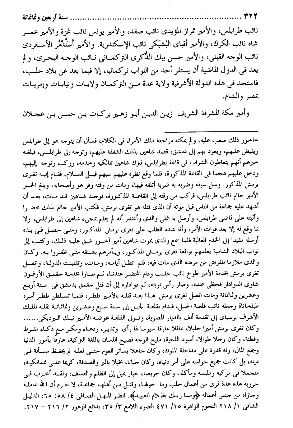 نَائِب طرابلس والأمير تمراز المؤيدى نَائِب صفد والأمير يونسْ نَائِب غَزَّة والأمير عمر شاه نَائِب الكرك والأمير أقباى البْشبَكى نَائِب الْإسْكَنْدَريَّة. والأمير أَسَنْدمر الأسعردى نَائِب الْوَجْه القبلى والأمير حسن بيك الدكرى التركمانى نَائِب الْوَجْه البحرى وَلم يعد فِي الدول الْمَاضِيَة أَن يسْتَقرّ أحد من النواب تركمانيا إِلَّا فِيمَا بعد عَن بِلَاد حلب فاستجد فِي هَذِه الدولة الأشرفية ولَايَة عدَّة من التركمان ولايات ونيابات وإمريات. بِمصْر وَالشَّام. وأمير مَكَّة المشرفة الشريف زين الدّين أَبُو زُهَيْر بَرَكَات بن حسن بن عجلَان