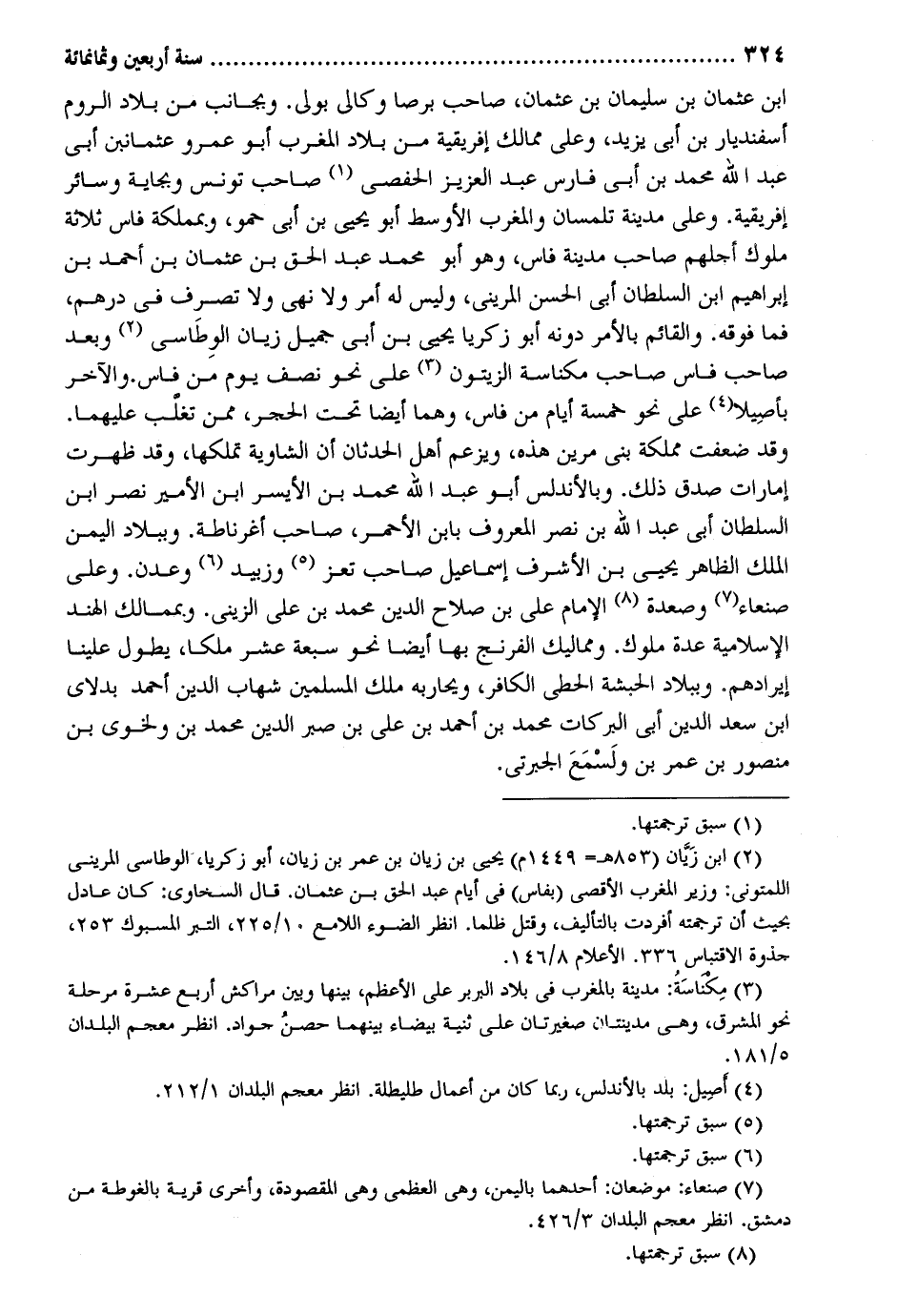 ابْن عُثْمَان بن سُلَيْمَان بن عُثْمَان صَاحب برصا وكالى بولى. وبجانب من بِلَاد الرّوم أسفنديار بن أَبى يزِيد وعَلى ممالك إفريقية من بِلَاد الْمغرب أَبُو عَمْرو عثمانين أَبى عبد الله مُحَمَّد بن أَبى فَارس عبد الْعَزِيز الحفصى صَاحب تونس وبجاية وَسَائِر إفريقية. وعَلى مدينْة تلمسادْ وَالْمغْرب الْأَوْسَط أَبُو يحيى بن أَبى حمو وبمملكة فاس ثَلَاثَة مُلُوك أَجلهم صَاحب مَدِينَة فاس وَهُوَ أَبُو مُحَمَّد عبد الْحق بن عُثْمَان بن أَحْمد بن إِبْرَاهِيم ابْن السُّلْطَان أَبى الْحسن المرينى وَلَيْسَ لَهُ أَمر وَلَا نهى وَلَا تصرف فِي دِرْهَم فَمَا فَوْقه. والقائم بِالْأَمر دونه أَبُو زَكَرِيَّا يحيى بن أَبى جميل زيان الوِطَاسى وَبعد صَاحب فاس صَاحب مكناسة الزَّيْتُون على نَحْو نصف يَوْم من فاس. وَالْآخر بأصِيلا على نَحْو خَمْسَة أَيَّام من فاس وهما أَيْضا تَحت الْحجر مِمَّن تغلب عَلَيْهِمَا. وَقد ضْعفت مملكة بنى مرين هَذِه وَيَزْعُم أهل الْحدثَان أَن الشاوية تَملكهَا وَقد ظَهرت إمارات صدق ذَلِك. وبالأندلس أَبُو عبد الله مُحَمَّد بن الْأَيْسَر ابْن الْأَمِير نصر ابْن السُّلْطَان أَبى عبد الله بن نصر الْمَعْرُوف بِابْن الْأَحْمَر صَاحب أغرناطة. وببلاد الْيمن الْملك الظَّاهِر يحيى بن الْأَشْرَف إِسْمَاعِيل صَاحب تعز وزبيد وعدن. وعَلى صنعاء وصعدة الإِمَام على بن صَلَاح الدّين مُحَمَّد بن على الزينى. وبممالك الْهِنْد الإسلامية عدَّة مُلُوك. ومماليك الفرنج بهَا أَيْضا نَحْو سَبْعَة عشر ملكا يطول علينا إيرادهم. وببلاد الْحَبَشَة الحطى الْكَافِر ويحاربه ملك الْمُسلمين شهَاب الدّين أَحْمد بدلاى ابْن سعد الدّين أَبى البركات مُحَمَّد بن أَحْمد بن على بن صَبر الدّين مُحَمَّد بن ولخوى بن مَنْصُور بن عمر بن ولَسْمَع الجبرتى.
