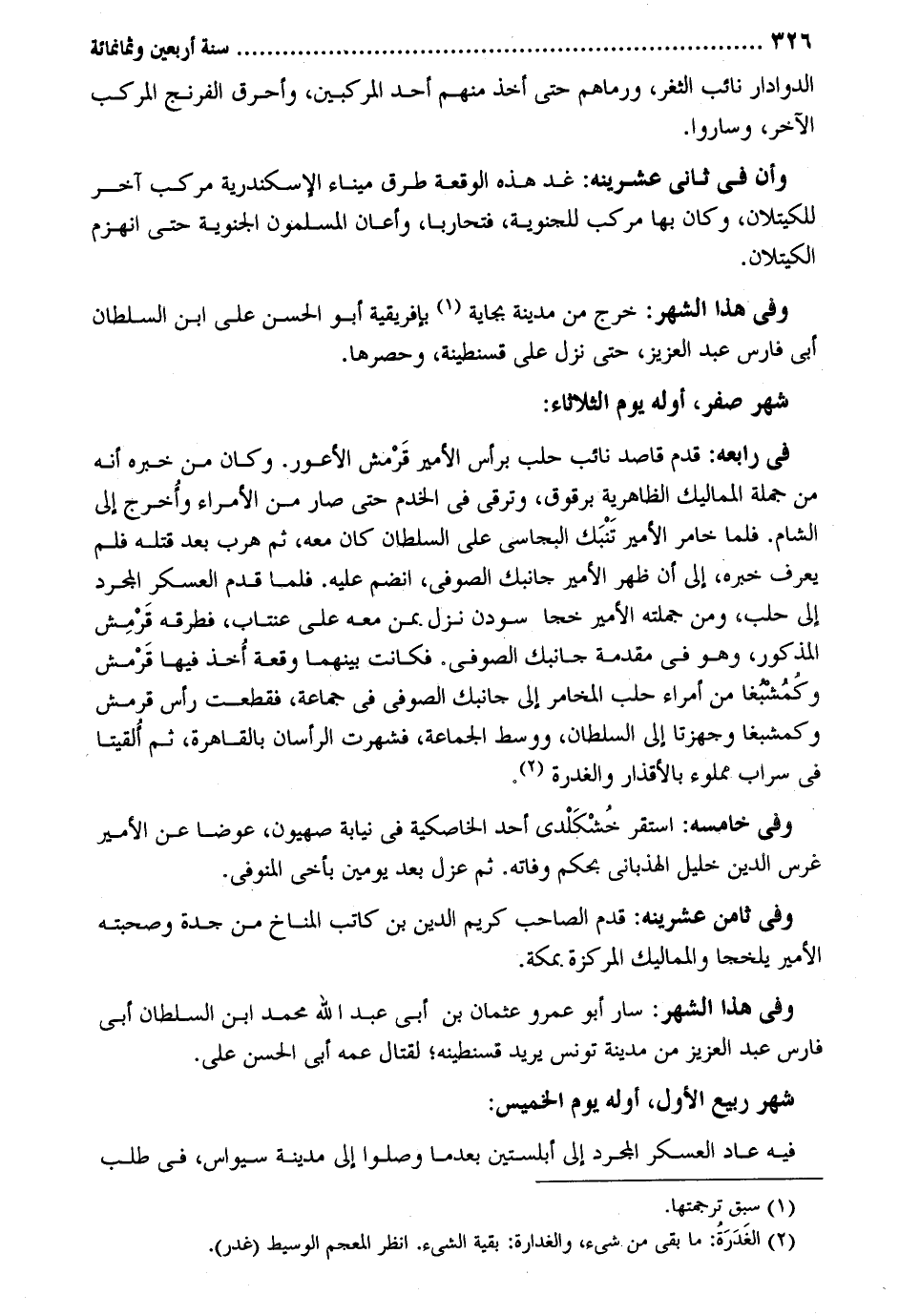 الدوادار نَائِب الثغر وَرَمَاهُمْ حَتَّى أَخذ مِنْهُم أحد المركبنِ وأحرق الفرنج الْمركب الآخر وَسَارُوا. وَأَن فِي ثَانِي عشرينه: غَد هَذِه الْوَقْعَة طرق ميناء الْإسْكَنْدَريَّة مركب آخر للكيتلان وَكَانَ بهَا مركب للجنوية فتَحاربا وأعان الْمُسلمُونَ الجنوية حَتَّى إنهزم الكيتلان. وَفِي هَذَا الشَّهْر: خرج من مَدِينَة بجاية بإفريقية أَبُو الْحسن على ابْن السُّلْطَان أَبى فَارس عبد الْعَزِيز حَتَّى نزل على قسنطينة وحصرها. شهرصفر أَوله يَوْم الثُّلَاثَاء: فِي رابعه: قدم قَاصد نَائِب حلب بِرَأْس الْأَمِير قَرْمش الْأَعْوَر. وَكَانَ من خَبره أَنه من جملَة المماليك الظَّاهِرِيَّة برقوق وترقى فى الخدم حَتَّى صَار من الْأُمَرَاء وأُخرج إِلَى الشَّام. فَلَمَّا خامر الْأَمِير تَنْبَك البجاسى على السُّلْطَان كَانَ مَعَه ثمَّ هرب بعد قَتله فَلم يعرف خَبره إِلَى أَن ظهر الْأَمِير جَانِبك الصوفى إنضم عَلَيْهِ. فَلَمَّا قدم الْعَسْكَر الْمُجَرّد إِلَى حلب وَمن جملَته الْأَمِير خجا سودن نزل. مِمَّن مَعَه على عنتاب فطرقه قَرْمش الْمَذْكُور وَهُوَ فِي مُقَدّمَة جَانِبك الصوفى فَكَانَت بَينهمَا وقعهْ أُخذ فِيهَا قَرْمش وكمُشبغا من أُمَرَاء حلب المخامر إِلَى جَانِبك الصوفى فى جمَاعَة فَقطعت رَأس قرمش وكمشبغا وجهزتا إِلَى السُّلْطَان ووسط الْجَمَاعَة فشهرت الرأسان بِالْقَاهِرَةِ ثمَّ أُلقيتا فى سراب مَمْلُوء بالأقذار والغدرة. وَفِي خامسه: اسْتَقر خُشكَلْدى أحد الخاصكية فى نِيَابَة صهيون عوضا عَن الْأَمِير غرس الدّين خَلِيل الهذْبانى بِحكم وَفَاته. ثمَّ عزل بعد يَوْمَيْنِ بأخى المنوفى. وَفِي ثامن عشرينه: قدم الصاحب كريم الدّين بن كَاتب المناخ من جدة وصحبته الْأَمِير يلخجا والمماليك المركزة بِمَكَّة. وَفِي هَذَا الشَّهْر: سَار أَبُو عَمْرو عُثْمَان بن أَبى عبد الله مُحَمَّد ابْن السُّلْطَان أَبى فَارس عبد الْعَزِيز من مَدِينَة تونس يُرِيد قسنطينه لقِتَال عَمه أَبى الْحسن على. شهر ربيع الأول أَوله يَوْم الْخَمِيس: فِيهِ عَاد الْعَسْكَر الْمُجَرّد إِلَى أبلستين بَعْدَمَا وصلوا إِلَى مَدِينَة سيواس فى طلب