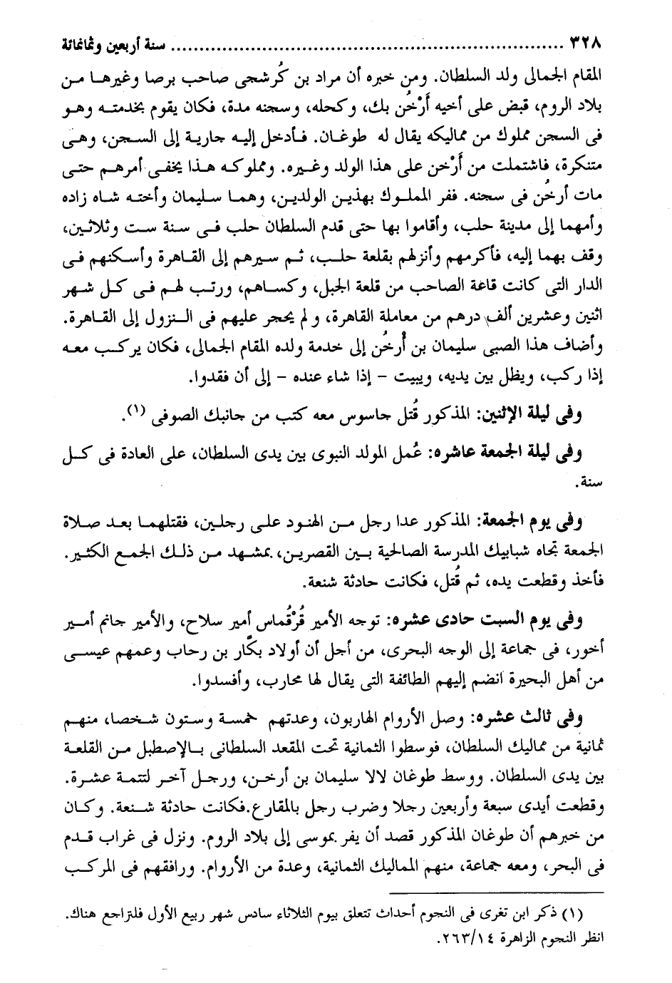 الْمقَام الجمالى ولد السُّلْطَان. وَمن خَبره أَن مُرَاد بن كُرشحى صَاحب برصا ويخرها من بِلَاد الرّوم قبض على أَخِيه أَرْخُن بك وكحله وسجنه مُدَّة فَكَانَ يقوم بخدمته وَهُوَ فى السجْن مَمْلُوك من مماليكه يُقَال لَهُ طوغان. فَأدْخل إِلَيْهِ جَارِيَة إِلَى السجْن وهى مُتَنَكِّرَة فاشتملت من أَرْخن على هَذَا الْوَلَد وَغَيره. ومملوكه هَذَا يخفى أَمرهم حَتَّى مَاتَ أرخُن فى سجنه. ففر الْمَمْلُوك بِهَذَيْنِ الْوَلَدَيْنِ وهما سُلَيْمَان وَأُخْته شاه زَاده وأمهما إِلَى مَدِينَة حلب وَأَقَامُوا بهَا حَتَّى قدم السُّلْطَان حلب فى سنة سِتّ وَثَلَاثِينَ وقف بهما إِلَيْهِ فاً كرمهم وأنزلهم بقلعة حلب ثمَّ سيرهم إِلَى الْقَاهِرَة وأسكنهم فى الدَّار الَّتِى كَانَت قلعة الصاحب من قلعة الْجَبَل وكساهم ورتب لَهُم فى كل شهر إثنين وَعشْرين ألف دِرْهَم من مُعَاملَة الْقَاهِرَة وَلم يحْجر عَلَيْهِم فى النُّزُول إِلَى الْقَاهِرَة. وأضاف هَذَا الصبى سُلَيْمَان بن أرخُن إِلَى خدمَة وَلَده الْمقَام الجمالى فَكَانَ يركب مَعَه إِذا ركب ويظل بَين يَدَيْهِ ويبيت إِذا شَاءَ عِنْده إِلَى أَن فقدوا. وَفِي لَيْلَة الْإِثْنَيْنِ: الْمَذْكُور قُتل جاسوس مَعَه كتب من جَانِبك الصوفى. وَفِي اليلة الْجُمُعَة عاشره: عُمل المولد النبوى بَين يدى السُّلْطَان على الْعَادة فى كل سنة. وَفِي يَوْم الْجُمُعَة: الْمَذْكُور عدا رجل من الهنود على رجلَيْنِ فَقَتَلَهُمَا بعد صَلَاة الْجُمُعَة تجاه شبابيك الْمدرسَة الصالحية بَين القصرين. بمشهد من ذَلِك الْجمع الْكثير. فَأخذ وَقطعت يَده ثمَّ قُتل فَكَانَت حَادِثَة شنعة. وَفِي يَوْم السبت حادى عشرَة: توجه الْأَمِير قُرْقماس أَمِير سلَاح والأمير جانم أَمِير أخور فِي جمَاعَة إِلَى الْوَجْه البحرى من أجل أَن أَوْلَاد بكار بن رحاب وعمهم عِيسَى من أهل الْبحيرَة وَفِي ثَالِث عشرَة: وصل الأروام الهاربون وعدتهم خَمْسَة وَسِتُّونَ شخصا مِنْهُم ثمانيهْ من مماليك السُّلْطَان فوسطوا الثَّمَانِية تَحت المقعد السلطانى بالإصطبل من القلعة بَين يدى السُّلْطَان. ووسط طوغان لالا سُلَيْمَان بن أرخن وَرجل آحْر لتتمة عشرَة. وَقطعت أيدى سَبْعَة وَأَرْبَعين رجلا وَضرب رجل بالمقارع. فَكَانَت حَادِثَة شنعة. وَكَانَ من خبرهم أَن طوغان الْمَذْكُور قصد أَن يفر. بمُوسَى إِلَى بِلَاد الرّوم. وَنزل فى غراب قدم فى الْبَحْر وَمَعَهُ جمَاعَة مِنْهُم المماليك الثَّمَانِية وعدة من الأروام. ورافقهم فى الْمركب
