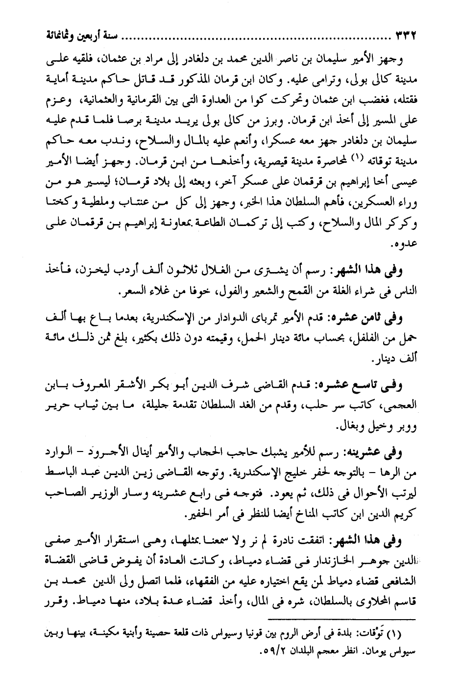 وجهز الْأَمِير سُلَيْمَان بن نَاصِر الدّين مُحَمَّد بن دلغادر إِلَى مُرَاد بن عُثْمَان فَلَقِيَهُ على مَدِينَة كالى بولى وترامى عَلَيْهِ. وَكَانَ ابْن قرمان الْمَذْكُور قد قَاتل حَاكم مَدِينَة أماية فَقتله فَغَضب ابْن عُثْمَان وتحركت كوا من الْعَدَاوَة الَّتِى بَين القرمانية والعثمانية وعزم على الْمسير إِلَى أَخذ ابْن قرمان. وبرز من كالى بولى يُرِيد مَدِينَة برصا فَلَمَّا قدم عَلَيْهِ سُلَيْمَان بن دلغادر جهز مَعَه عسكراً وأنعم عَلَيْهِ بِالْمَالِ وَالسِّلَاح وَندب مَعَه حَاكم مَدِينَة توقاته لمحاصرة مَدِينَة قيصرية وَأَخذهَا من ابْن قرمان. وجهز أَيْضا الْأَمِير عِيسَى أَخا إِبْرَاهِيم بن قرقمان على عَسْكَر آخر وَبَعثه إِلَى بِلَاد قرمان ليسير هُوَ من وَرَاء العسكرين فأهم السُّلْطَان هَذَا الْخَبَر وجهز إِلَى كل من عنتاب وملطية وكختا وكركر المَال وَالسِّلَاح وَكتب إِلَى تركمان الطَّاعَة. بمعاونة إِبْرَاهِيم بن قرقمان على عدوه. وَفِي هَذَا الشَّهْر: رسم أَن يشترى من الغلال ثَلَاثُونَ ألف أردب ليخزن فَأخذ النَّاس فِي شِرَاء الْغلَّة من الْقَمْح وَالشعِير والفول خوفًا من غلاء السّعر. وَفِي ثامن عشرَة: قدم الْأَمِير تمرباى الدوادار من الْإسْكَنْدَريَّة بَعْدَمَا بَاعَ بهَا ألف حمل من وَفِي تَاسِع عشرَة: قدم القاضى شرف الدّين أَبُو بكر الْأَشْقَر الْمَعْرُوف بِابْن العجمى كَاتب سر حلب وَقدم من الْغَد السُّلْطَان تقدمة جليلة مَا بَين ثِيَاب حَرِير ووبر وخيل وبغال. وَفِي عشرينيه: رسم للأًمير يشبك حَاجِب الْحجاب والأمير أينال الأجرود الْوَارِد من الرها بالتوجه لحفر خليج الْإسْكَنْدَريَّة. وَتوجه القاضى زين الدّين عبد الباسط ليرتب الْأَحْوَال فِي ذَلِك ثمَّ يعود. فَتوجه فِي رَابِع عشرينه وَسَار الْوَزير الصاحب كريم الدّين ابْن كَاتب المناخ أَيْضا للنَّظَر فِي أَمر الحفير. وَفِي هَذَا الشَّهْر: اتّفقت نادرة لم نر وَلَا سمعنَا بِمِثْلِهَا وهى إستقرار الْأَمِير صفى الدّين جَوْهَر الخازندار فى قَضَاء دمياط وَكَانَت الْعَادة أَن يُفَوض قاضى الْقُضَاة الشافعى قَضَاء دمياط لمن يَقع اخْتِيَاره عَلَيْهِ من الْفُقَهَاء فَلَمَّا إتصل ولى الدّين مُحَمَّد بن قَاسم المحلاوى بالسلطان شَره فِي المَال وَأخذ قَضَاء عدَّة بِلَاد مِنْهَا دمياط. وَقرر