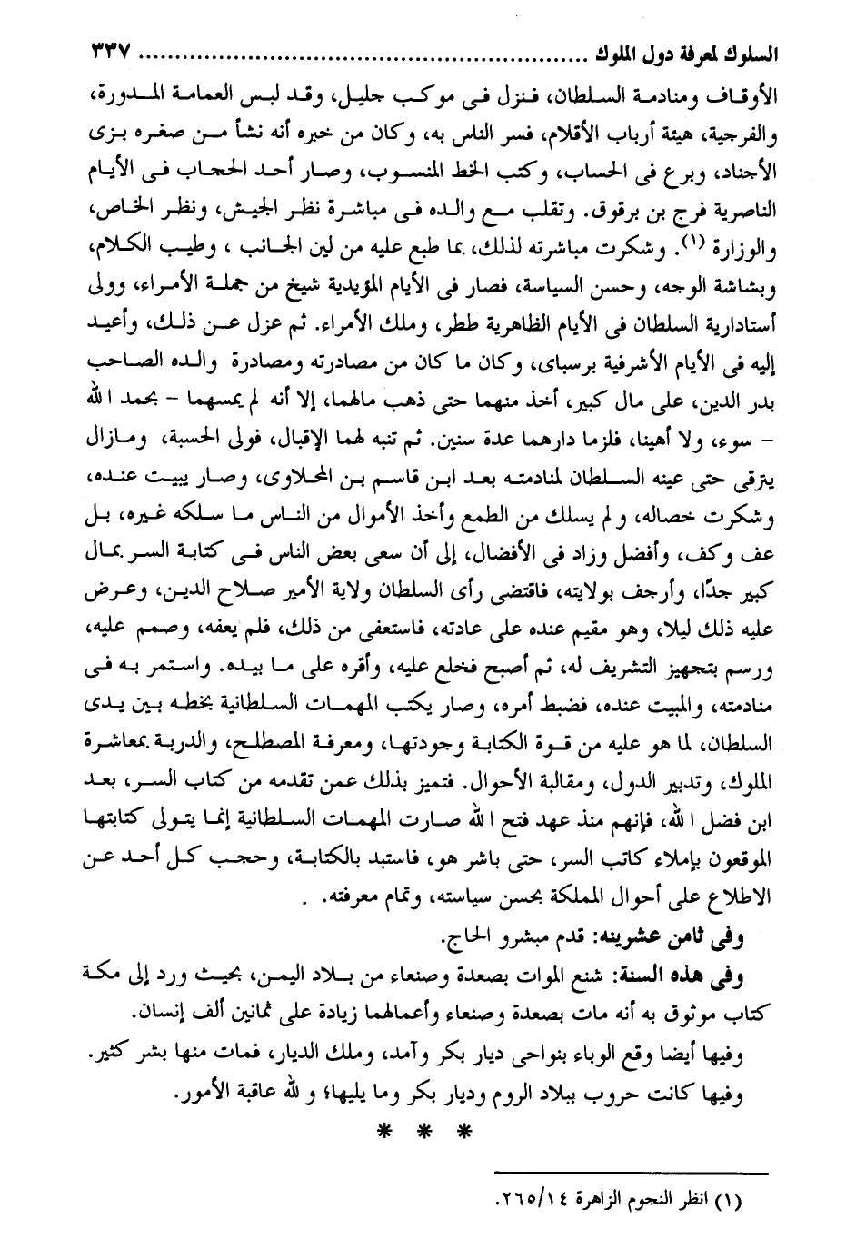الْأَوْقَاف ومنادمة السُّلْطَان فَنزل فِي موكب حليل وَقد لبس الْعِمَامَة المدورة والفرجية هَيْئَة أَرْبَاب الأقلام فسر النَّاس بِهِ وَكَانَ من خَبره أَنه نشاً من صغره بزى الأجناد وبرع فِي الْحساب وَكتب الْخط الْمَنْسُوب وَصَارَ أحد الْحجاب فِي الْأَيَّام الناصرية فرج بن برقوق. وتقلب مَعَ وَالِده فِي مُبَاشرَة نظر الْجَيْش وَنظر الْخَاص والوزارة. وشكرت مُبَاشَرَته لذَلِك. مِمَّا طبع عَلَيْهِ من لين الْجَانِب وَطيب الْكَلَام وبشاشة الْوَجْه وَحسن السياسة فَصَارَ فِي الْأَيَّام المؤيدية شيخ من جلة الْأُمَرَاء وَولى أستادارية السُّلْطَان فى الْأَيَّام الظَّاهِرِيَّة ططر وَملك الْأُمَرَاء. ثمَّ عزل عَن ذَلِك وأعيد إِلَيْهِ فِي الْأَيَّام الأشرفية برسباى وَكَانَ مَا كَانَ من مصادرته ومصادرة وَالِده الصاحب بدر الدّين على مَال كَبِير أَخذ مِنْهُمَا حَتَّى ذهب مَالهمَا إِلَّا أَنه لم يمسهما بِحَمْد الله سوء وَلَا أهينا فلزما دارهما عدَّة سِنِين. ثمَّ شَبه لَهما الإقبال فولى الْحِسْبَة ومازال يترقى حَتَّى عينه السُّلْطَان لمنادمته بعد ابْن قَاسم بن المحلاوى وَصَارَ يبيت عِنْده وشكرت خصاله وَلم يسْلك من الطمع وَأخذ الْأَمْوَال من النَّاس مَا سلكه غَيره بل عف وكف وَأفضل وَزَاد فِي الأفضال إِلَى أَن سعى بعض النَّاس فِي كِتَابَة السِّرّ بِمَال كَبِير جدا وأرجف بولايته فَاقْتضى رأى السُّلْطَان ولَايَة الْأَمِير صَلَاح الدّين وَعرض عَلَيْهِ ذَلِك لَيْلًا وَهُوَ مُقيم عِنْده على عَادَته فاستعفى من ذَلِك فَلم يعفه وصمم عَلَيْهِ ورسم بتجهيز التشريف لَهُ ثمَّ أصبح فَخلع عَلَيْهِ وَأقرهُ على مَا بِيَدِهِ. وإستمر بِهِ فِي منادمته وَالْمَبِيت عِنْده فضبط أمره وَصَارَ يكْتب الْمُهِمَّات السُّلْطَانِيَّة بِخَطِّهِ بَين يدى السُّلْطَان لما هُوَ عَلَيْهِ من قُوَّة الْكِتَابَة وجودتها وَمَعْرِفَة المصطلح والدربة بمعاشرة الْمُلُوك وتدبير الدول ومقالبة الْأَحْوَال. فتميز بذلك عَمَّن تقدمه من كتاب السِّرّ بعد ابْن فضل الله فَإِنَّهُم مُنْذُ عهد فتح الله صَارَت الْمُهِمَّات السُّلْطَانِيَّة إِنَّمَا يتَوَلَّى كتَابَتهَا الموقعونْ بإملاء كَاتب السِّرّ حَتَّى بَاشر هُوَ فاستبد بِالْكِتَابَةِ وحجب كل أحد عَن الِاطِّلَاع على أَحْوَال المملكة بِحسن سياسته وَتَمام مَعْرفَته. . وَفِي ثامن عشرينه: قدم مبشرو الْحَاج. وَفِي هَذِه السّنة: شنع الْموَات بصعدة وَصَنْعَاء من بِلَاد الْيمن بِحَيْثُ ورد إِلَى مَكَّة كتاب موثوق بِهِ أَنه مَاتَ بصعدة وَصَنْعَاء وأعمالهما زِيَادَة على ثَمَانِينَ ألف إِنْسَان. وفيهَا أَيْضا وَقع الوباء بنواحى ديار بكر وآمد وَملك الديار فَمَاتَ مِنْهَا بشر كثير. وفيهَا كَانَت حروب بِبِلَاد الرّوم وديار بكر وَمَا يَليهَا وَللَّه عَاقِبَة الْأُمُور.