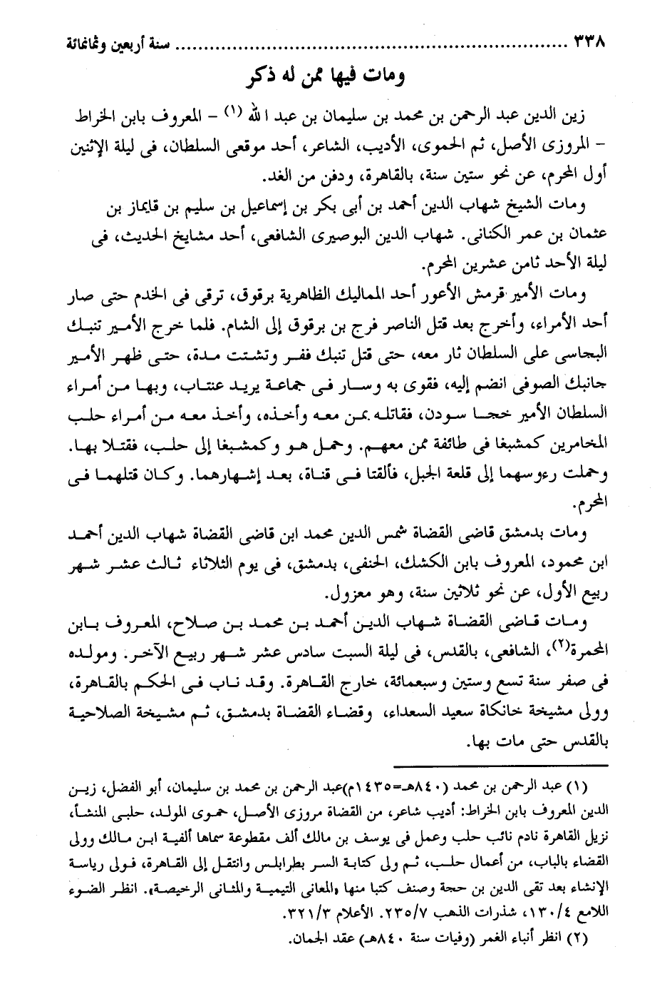 وَمَات فِيهَا مِمَّن لَهُ ذكر زين الدّين عبد الرَّحْمَن بن مُحَمَّد بن سُلَيْمَان بن عبد الله الْمَعْرُوف بِابْن الْخَرَّاط المروزى الأَصْل ثمَّ الحموى الأديب الشَّاعِر أحد موقعى السُّلْطَان فِي لَيْلَة الْإِثْنَيْنِ أول الْمحرم عَن نَحْو سِتِّينَ سنة بِالْقَاهِرَةِ وَدفن من الْغَد. وَمَات الشَّيْخ شهَاب الدّين أَحْمد بن أَبى بكر بن إِسْمَاعِيل بن سليم بن قايماز بن عُثْمَان بن عمر الكنانى. شهَاب الدّين البوصيرى الشافعى أحد مَشَايِخ الحَدِيث فِي لَيْلَة الْأَحَد ثامن عشْرين الْمحرم. وَمَات الْأَمِير قرمش الْأَعْوَر أحد المماليك الظَّاهِرِيَّة برقوق ترقى فِي الخدم حَتَّى صَار أحد الْأُمَرَاء وَأخرج بعد قتل النَّاصِر فرج بن برقوق إِلَى الشَّام. فَلَمَّا خرج الْأَمِير تنبك البجاسى على السُّلْطَان ثار مَعَه حَتَّى قتل تنبك ففر وتشتت مُدَّة حَتَّى ظهر الْأَمِير جَانِبك الصوفى إنضم إِلَيْهِ فقوى بِهِ وَسَار فِي جمَاعَة يُرِيد عنتاب وَبهَا من أُمَرَاء السُّلْطَان الْأَمِير خجا سودن فقاتله بِمن مَعَه وَأَخذه وَأخذ مَعَه من أُمَرَاء حلب المخامرين كمشبغا فِي طَائِفَة مِمَّن مَعَهم. وَحمل هُوَ وكمشبغا إِلَى حلب فقتلا بهَا. وحملت رؤوسهما إِلَى قلعة الْجَبَل فألقتا فِي قناة بعد إشهارهما. وَكَانَ قَتلهمَا فِي الْمحرم. وَمَات بِدِمَشْق قاضى الْقُضَاة شمس الدّين مُحَمَّد ابْن قاضى الْقُضَاة شهَاب الدّين أَحْمد ابْن مَحْمُود الْمَعْرُوف بِابْن الكشك الحنفى بِدِمَشْق فِي يَوْم الثُّلَاثَاء ثَالِث عشر شهر ربيع الأول عَن وَمَات قاضى الْقُضَاة شهَاب الدّين أَحْمد بن مُحَمَّد بن صَلَاح الْمَعْرُوف بِابْن المحمرة الشافعى بالقدس فِي لَيْلَة السبت سادس عشر شهر ربيع الآخر. ومولده فِي صفر سنة تسع وَسِتِّينَ وَسَبْعمائة خَارج الْقَاهِرَة. وَقد نَاب فِي الحكم بِالْقَاهِرَةِ وَولى مشيخة خانكاة سعيد السُّعَدَاء وَقَضَاء الْقُضَاة بِدِمَشْق ثمَّ مشيخة الصلاحية بالقدس حَتَّى مَاتَ بهَا.