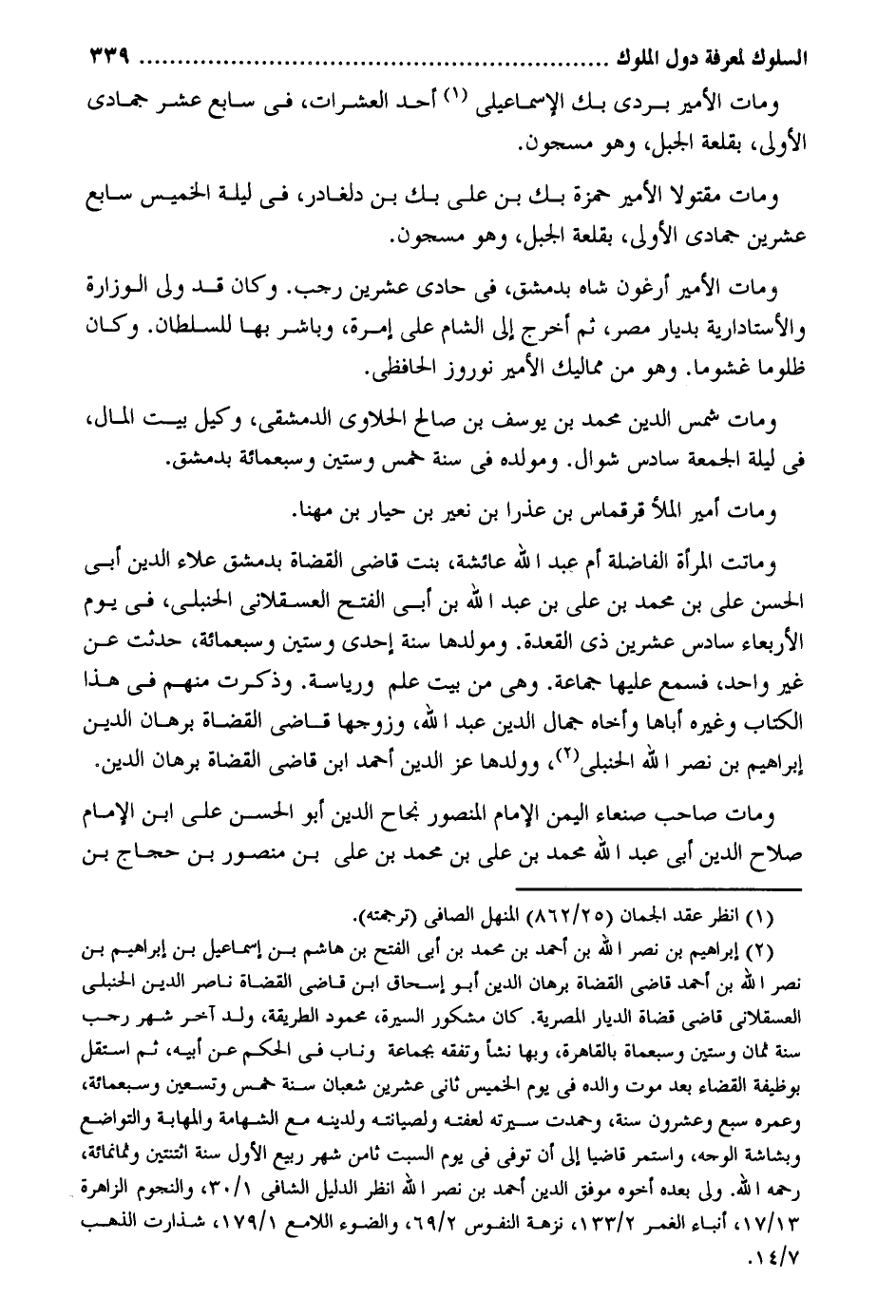 وَمَات الْأَمِير بردى بك الإسماعيلى أحد العشرات فِي سَابِع عشر جُمَادَى الأولى بقلعة الْجَبَل وَهُوَ مسجون. وَمَات مقتولًا الْأَمِير حَمْزَة بك بن على بك بن دلغادر فِي لَيْلَة الْخَمِيس سَابِع عشْرين جُمَادَى الأولى بقلعة الْجَبَل وَهُوَ مسجون. وَمَات الْأَمِير أرغون شاه بِدِمَشْق فِي حادى عشْرين رَجَب. وَكَانَ قد ولى الوزارة والأستادارية بديار مصر ثمَّ أخرج إِلَى الشَّام على إمرة وباشر بهَا للسُّلْطَان. وَكَانَ ظلوما غشوما. وَهُوَ من مماليك الْأَمِير نوروز الحافظي. وَمَات شمس الدّين مُحَمَّد بن يُوسُف بن صَالح الحلاوى الدمشقى وَكيل بَيت المَال فِي لَيْلَة الْجُمُعَة سادس شَوَّال. ومولده فِي سنة خمس وَسِتِّينَ وَسَبْعمائة بِدِمَشْق. وَمَات أَمِير الْمَلأ قرقماس بن عذرا بن نعير بن حيار بن مهنا. وَمَاتَتْ الْمَرْأَة الفاضلة أم عبد الله عَائِشَة بنت قاضى الْقُضَاة بِدِمَشْق عَلَاء الدّين أَبى الْحسن على بن مُحَمَّد بن على بن عبد الله بن أَبى الْفَتْح العسقلانى الحنبلى فِي يَوْم الْأَرْبَعَاء سادس عشْرين ذى الْقعدَة. ومولدها سنة إِحْدَى وَسِتِّينَ وَسَبْعمائة حدثت عَن غير وَاحِد فَسمع عَلَيْهَا جمَاعَة. وهى من بَيت علم ورياسة. وَذكرت مِنْهُم فِي هَذَا الْكتاب وَغَيره أَبَاهَا وأخاه جمال الدّين عبد الله وزْوجها قاضى الْقُضَاة برهَان الدّين إِبْرَاهِيم بن نصر اللة الحنبلى وَوَلدهَا عز الدّين أَحْمد ابْن قاضى الْقُضَاة برهَان الدّين. وَمَات صَاحب صنعاء الْيمن الإِمَام الْمَنْصُور نجاح الدّين أَبُو الْحسن على ابْن الإِمَام صَلَاح الدّين أَبى عبد الله مُحَمَّد بن على بن مُحَمَّد بن على بن مَنْصُور بن حجاج بن