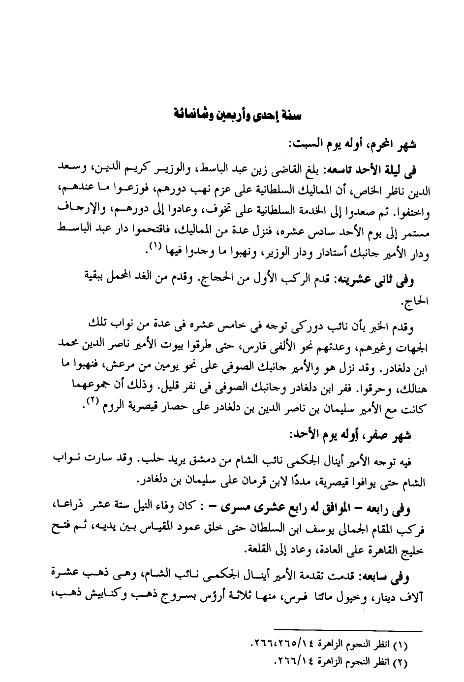 سنة إِحْدَى وَأَرْبع وَثَمَانمِائَة شهر الْمحرم أَوله يَوْم السبت: فِي لَيْلَة الْأَحَد تاسعه: بلغ القاضى زين عبد الباسط والوزير كريم الدّين وَسعد الدّين نَاظر الْخَاص أَن المماليك السُّلْطَانِيَّة على عزم نهب دُورهمْ فوزعوا مَا عِنْدهم واختفوا. ثمَّ صعدوا إِلَى الْخدمَة السُّلْطَانِيَّة على تخوف وعادوا إِلَى دُورهمْ والإرجاف مُسْتَمر إِلَى يَوْم الْأَحَد سادس عشرَة فَنزل عدَّة من المماليك فاقتحموا دَار عبد الباسط وَدَار الْأَمِير جَانِبك أستادار وَدَار الْوَزير ونهبوا مَا وجدوا فِيهَا. وَفِي ثانى عشرينه: قدم الركب الأول من الْحجَّاج. وَقدم من الْغَد الْمحمل بِبَقِيَّة الْحَاج. وَقدم الْخَبَر بِأَن نَائِب دوركى توجه فِي خَامِس عشرَة فِي عدَّة من نواب تِلْكَ الْجِهَات وَغَيرهم وعدتهم نَحْو الألفى فَارس حَتَّى طرقوا بيُوت الْأَمِير نَاصِر الدّين مُحَمَّد ابْن دلغادره وَقد نزل هُوَ والأمير جَانِبك الصوفى على نَحْو يَوْمَيْنِ من مرعش فنهبوا مَا هُنَالك وحرقوا. ففر ابْن دلغادر وجانبك الصوفى فِي نفر قَلِيل. وَذَلِكَ أَن جموعهما كَانَت مَعَ الْأَمِير سُلَيْمَان بن نَاصِر الدّين بن دلغادر على حِصَار قيصرية الرّوم. فِيهِ توجه الْأَمِير أينال الجكمى نَائِب الشَّام من دمشق يُرِيد حلب. وَقد سَارَتْ نواب الشَّام حَتَّى يوافوا قيصرية مدَدا لإبن قرمان على سُلَيْمَان بن دلغادر. وَفِي رَابِعَة الْمُوَافق لَهُ رَابِع عشرى مسرى: كَانَ وَفَاء النّيل سِتَّة عشر ذِرَاعا فَركب الْمقَام الجمالى يُوسُف ابْن السُّلْطَان حَتَّى خلق عَمُود المقياس بَين يَدَيْهِ ثمَّ فتح خليج الْقَاهِرَة على الْعَادة وَعَاد إِلَى القلعة. وَفِي سابعه: قدمت تقدمة الْأَمِير أينال الجكمى نَائِب الشَّام وهى ذهب عشرَة آلَاف دِينَار وخيول مِائَتَا فرس مِنْهَا ثَلَاثَة أرؤس بسروج ذهب وكنابيش ذهب