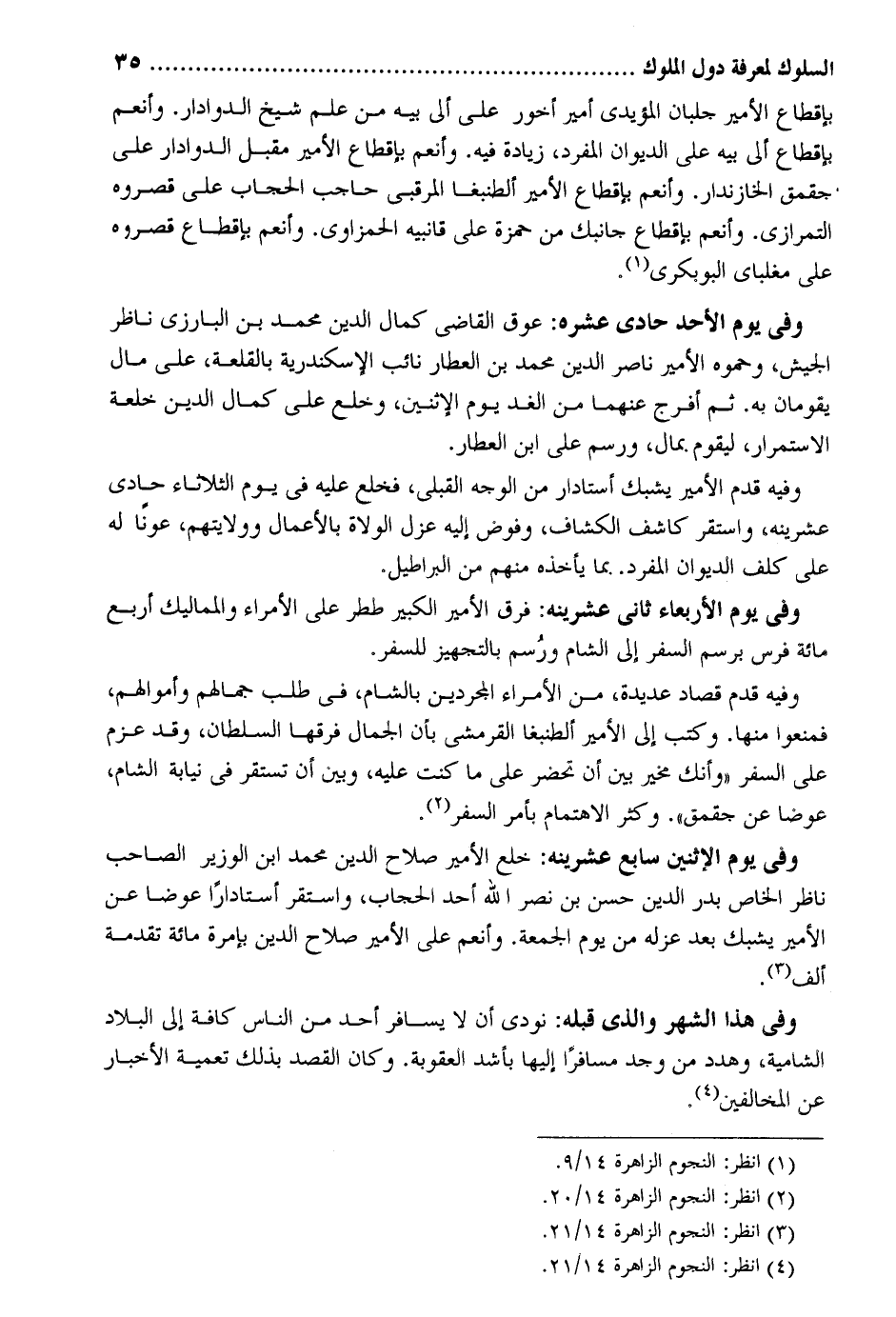بإقطاع الْأَمِير جلبان المؤيدي أَمِير أخور على أَلِي بيه من علم شيخ الدوادار. وأنعم بإقطاع أَلِي بيه على الدِّيوَان الْمُفْرد زِيَادَة فِيهِ. وأنعم بإقطاع الْأَمِير مقبل الدوادار على جقمق الخازندار. وأنعم بإقطاع الْأَمِير ألطنبغا المرقبي حَاجِب الْحجاب على قصروه التمرازي. وأنعم بإقطاع جانجك من حَمْزَة على قانبيه الحمزاوي. وأنعم بإقطاع قصروه على مغلباي البوبكري. وَفِي يَوْم الْأَحَد حادي عشره: عوق القَاضِي كَمَال الدّين مُحَمَّد بن الْبَارِزِيّ نَاظر الجيق وحموه الْأَمِير نَاصِر الدّين مُحَمَّد بن الْعَطَّار نَائِب الْإسْكَنْدَريَّة بالقلعة على مَال يقومان بِهِ. ثمَّ أفرج عَنْهُمَا من الْغَد يَوْم الِاثْنَيْنِ وخلع على كَمَال الدّين خلعة الِاسْتِمْرَار ليقوم بِمَال ورسم على ابْن الْعَطَّار. وَفِيه قدم الْأَمِير يشبك استادار من الْوَجْه القبلي فَخلع عَلَيْهِ فِي يَوْم الثُّلَاثَاء حادي عشرينه وَاسْتقر كاشف الْكَشَّاف وفوض إِلَيْهِ عزل الْوُلَاة بِالْأَعْمَالِ وولايتهم عوناً لَهُ على كلف الدِّيوَان الْمُفْرد. بِمَا يَأْخُذهُ مِنْهُم من البراطيل. مائَة فرس برسم السّفر إِلَى الشَّام ورسم بالتجهيز للسَّفر. وَفِيه قدم قصاد عديدة من الْأُمَرَاء المجردين بِالشَّام فِي طلب جمَالهمْ وَأَمْوَالهمْ فمنعوا مِنْهَا. وَكتب إِلَى الْأَمِير ألطنبغا القرمشي بِأَن الْجمال فرقها السُّلْطَان وَقد عزم على السّفر وَأَنَّك مُخَيّر بَين أَن تحضر على مَا كنت عَلَيْهِ وَبَين أَن تَسْتَقِر فِي نِيَابَة الشَّام عوضا عَن جقمق. وَكثر الاهتمام بِأَمْر السّفر. وَفِي يَوْم الِاثْنَيْنِ سَابِع عشرينه: خلع الْأَمِير صَلَاح الدّين مُحَمَّد ابْن الْوَزير الصاحب نَاظر الْخَاص بدر الدّين حسن بن نصر الله أحد الْحجاب وَاسْتقر أستادارا عوضا عَن الْأَمِير يشبك بعد عَزله من يَوْم الْجُمُعَة. وأنعم على الْأَمِير صَلَاح الدّين بإمرة مائَة تقدمة ألف. وَفِي هَذَا الشَّهْر وَالَّذِي قبله: نُودي أَن لَا يُسَافر أحد من النَّاس كَافَّة إِلَى الْبِلَاد الشامية وهدد من وجد مُسَافِرًا إِلَيْهَا بأشد الْعقُوبَة. وَكَانَ الْقَصْد بذلك تعمية الْأَخْبَار عَن الْمُخَالفين.