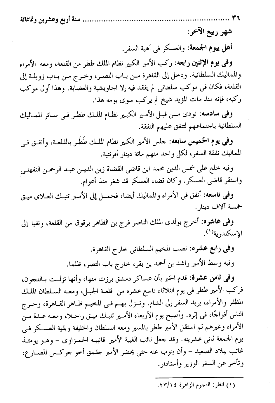 شهر ربيع الآخر: أهل بِيَوْم الْجُمُعَة: والعسكر فِي أهبة السّفر. وَفِي يَوْم الِاثْنَيْنِ رابعه: ركب الْأَمِير الْكَبِير نظام الْملك ططر من القلعة وَمَعَهُ الْأُمَرَاء والمماليك السُّلْطَانِيَّة. وَدخل إِلَى الْقَاهِرَة من بَاب النَّصْر وَخرج من بَاب زويلة إِلَى القلعه فَكَانَ فِي موكب سلطاني لم يفقد فِيهِ إِلَّا الجاويشية والعصابة. وَهَذَا أول موكب رَكبه فَإِنَّهُ مُنْذُ مَاتَ الْمُؤَيد شيخ لم يركب سوى يَوْمه هَذَا. وَفِي سادسه: نُودي من قبل الْأَمِير الْكَبِير نظام الْملك ططر فِي سَائِر المماليك السُّلْطَانِيَّة باجتماعهم لتنفق عَلَيْهِم النَّفَقَة. وَفِي يَوْم الْخَمِيس سابعه. جلس الْأَمِير الْكَبِير نظام الْملك ططر بالقلعة وَأنْفق فِي المماليك نَفَقَة السّفر لكل وَاحِد مِنْهُم مائَة دِينَار أفرنتية. وَفِيه خلع على شمس الدّين مُحَمَّد ابْن قَاضِي الْقُضَاة زين الدّين عبد الرَّحْمَن التفهني وَاسْتقر قَاضِي الْعَسْكَر. وَكَانَ قَضَاء الْعَسْكَر قد شغر مُنْذُ أَعْوَام. وَفِي تاسعه: أنْفق فِي الْأُمَرَاء والمماليك أَيْضا فَحمل إِلَى الْأَمِير تنبك العلاي ميق خَمْسَة آلَاف دِينَار. وَفِي عاشره: أخرج بولدي الْملك النَّاصِر فرج بن الظَّاهِر برقوق من القلعة ونفيا إِلَى الْإسْكَنْدَريَّة. وَفِي رَابِع عشره: نصب المخيم السلطاني خَارج الْقَاهِرَة. وَفِيه وسط الْأَمِير رَاشد بن أَحْمد بن بقر خَارج بَاب النَّصْر ظلما. وَفِي ثامن عشرَة: قدم الْخَبَر بِأَن عَسَاكِر دمشق برزت مِنْهَا وَأَنَّهَا نزلت باللجون فَركب الْأَمِير ططر فِي يَوْم الثُّلَاثَاء تَاسِع عشره من قلعة الْجَبَل ة وَمَعَهُ السُّلْطَان الْملك المظفر والأمراء يُرِيد السّفر إِلَى الشَّام. وَنزل بهم فِي المخيم ظَاهر الْقَاهِرَة وَخرج النَّاس أَفْوَاجًا فِي إثره وَأصْبح يَوْم الْأَرْبَعَاء الْأَمِير تنبك ميق راحلاً وَمَعَهُ عدَّة من الْأُمَرَاء وَغَيرهم ثمَّ اسْتَقل الْأَمِير ططر بِالْمَسِيرِ وَمَعَهُ السُّلْطَان والخليفة وَبَقِيَّة الْعَسْكَر فِي يَوْم الْجُمُعَة ثَانِي عشرينه. وَقد جعل نَائِب الْغَيْبَة الْأَمِير قانبيه الحمزاوي - وَهُوَ يَوْمئِذٍ غَائِب بِبِلَاد الصَّعِيد - وَأَن يَنُوب عَنهُ حَتَّى يحضر الْأَمِير جقمق أَخُو جركس المصارع وَتَأَخر عَن السّفر الْوَزير وأستادار.