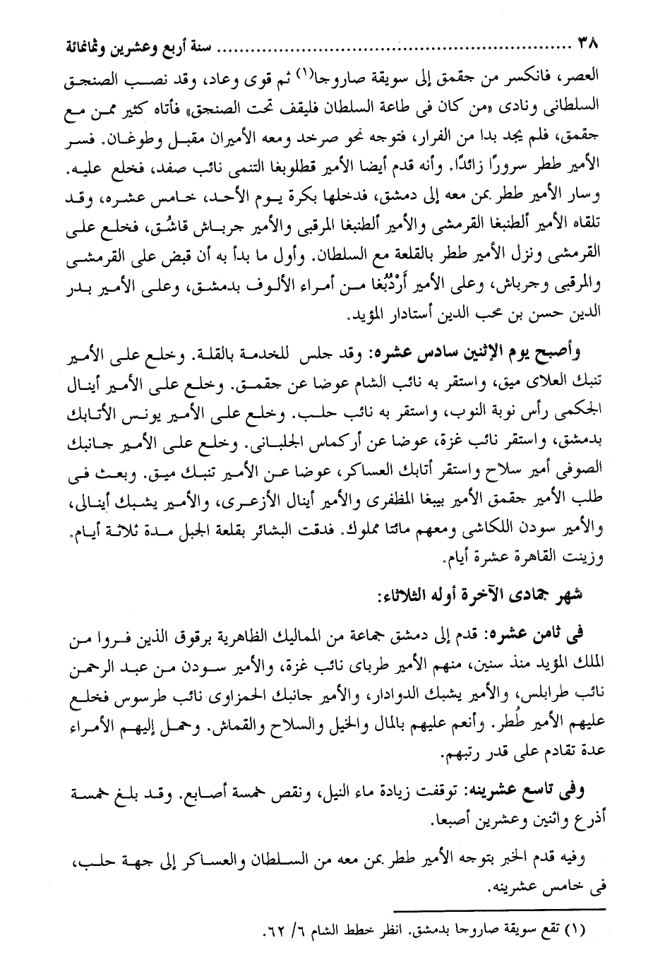 الْعَصْر فانكسر من جقمق إِلَى سويقة صاروجاً ثمَّ قوى وَعَاد وَقد نصب الصنجق السلطاني ونادى من كَانَ فِي طَاعَة السُّلْطَان فليقف تَحت الصنجق فَأَتَاهُ كثير مِمَّن مَعَ جقمق فَلم يجد بدا من الْفِرَار فَتوجه نَحْو صرخد وَمَعَهُ الأميران مقبل وطوغان فسر الْأَمِير ططر سُرُورًا زَائِدا. وَأَنه قدم أَيْضا الْأَمِير قطلوبغا التنمي نَائِب صفد فَخلع عَلَيْهِ. وَسَار الْأَمِير ططر مِمَّن مَعَه إِلَى دمشق فَدَخلَهَا بكرَة يَوْم الْأَحَد خَامِس عشره وَقد تَلقاهُ الْأَمِير ألطنبغا القرمشي والأمير ألطنبغا المرقبي والأمير جرباش قاشق فَخلع على القرمشي وَنزل الْأَمِير ططر بالقلعة مَعَ السُّلْطَان. وَأول مَا بَدَأَ بِهِ أَن قبض على القرمشي والمرقبي وجرباش وعَلى الْأَمِير أردبغا من أُمَرَاء الألوف بِدِمَشْق وعَلى الْأَمِير بدر الدَّيْر حسن بن محب الدّين أستادار الْمُؤَيد. وَأصْبح يَوْم الِاثْنَيْنِ سادس عشره: وَقد جلس للْخدمَة بالقلة. وخلع على الْأَمِير تنبك العلاي ميق وَاسْتقر بِهِ نَائِب الشَّام عوضا عَن جقمق. وخلع على الْأَمِير أينال الجكمي رَأس نوبَة النوب وأستقر بِهِ نَائِب حلب. وخلع على الْأَمِير يُونُس الأتابك بِدِمَشْق وَاسْتقر نَائِب غَزَّة عوضا عَن أركماس الجلباني. وخلع على الْأَمِير جَانِبك الصُّوفِي أَمِير سلَاح وَاسْتقر أتابك العساكر عوضا عَن الْأَمِير تنبك ميق. وَبعث فِي طلب الْأَمِير جقمق الْأَمِير بيبغا المظفري والأمير أينال الأزعري والأمير يشبك أينالي والأمير سودن اللكاشي وَمَعَهُمْ مِائَتَا مَمْلُوك. فدقت البشائر بقلعه الْجَبَل مُدَّة ثَلَاثَة أَيَّام. وزينت الْقَاهِرَة عشرَة أَيَّام. شهر جُمَادَى الْآخِرَة أَوله الثُّلَاثَاء: فِي ثامن عشره: قدم إِلَى دمشق جمَاعَة من المماليك الظَّاهِرِيَّة برقوق الَّذين فروا من الْملك الْمُؤَيد مُنْذُ سِنِين مِنْهُم الْأَمِير طرباي نَائِب غَزَّة والأمير سودن من عبد الرَّحْمَن نَائِب طرابلس والأمير يشبك الدوادار والأمير جَانِبك الحمزاوي نَائِب طرسوس فَخلع عَلَيْهِم الْأَمِير ططر. وأنعم عَلَيْهِم بِالْمَالِ وَالْخَيْل وَالسِّلَاح والقماش. وَحمل إِلَيْهِم الْأُمَرَاء عدَّة تقادم على قدر رتبهم. وَفِي تَاسِع عشرينه: توقفت زِيَادَة مَاء النّيل وَنقص خَمْسَة أَصَابِع. وَقد بلغ خَمْسَة أَذْرع واثنين وَعشْرين إصبعاً. وَفِيه قدم الْخَبَر بتوجه الْأَمِير ططر. مِمَّن مَعَه من السُّلْطَان والعساكر إِلَى جِهَة حلب فِي خَامِس عشرينه.