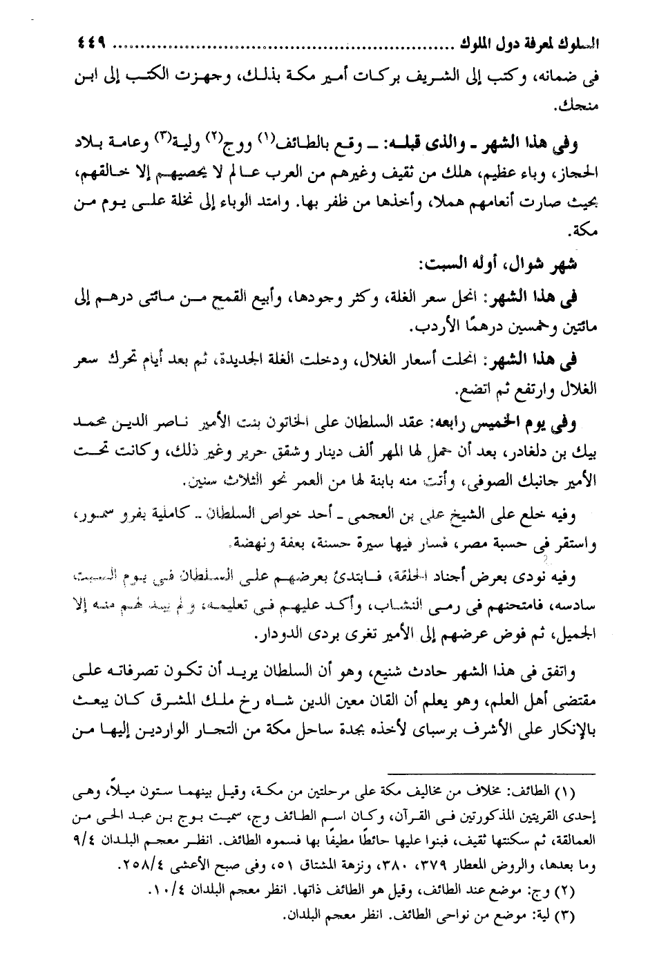 فِي ضَمَانه وَكتب إِلَى الشريف بَرَكَات أَمِير مَكَّة بذلك وجهزت الْكتب إِلَى ابْن منجك. وَفِي هَذَا الشَّهْر وَالَّذِي قبله: وَقع بِالطَّائِف وَوَج ولية وَعَامة بِلَاد الْحجاز وباء عَظِيم هلك من ثَقِيف وَغَيرهم من الْعَرَب عَالم لَا يحصيهم إِلَّا خالقهم بِحَيْثُ صَارَت أنعامهم هملًا وَأَخذهَا من ظفر بهَا. وإمتد الوباء إِلَى نَخْلَة على يَوْم من مَكَّة. شهر شَوَّال أَوله السبت: فِي هَذَا الشَّهْر: انحل سعر الْغلَّة وَكثر وجودهَا وأبيع الْقَمْح من مِائَتي دِرْهَم إِلَى مِائَتَيْنِ وَخمسين درهما الأردب. فِي هَذَا الشَّهْر: إنحلت أسعار الغلال وَدخلت الْغلَّة الجديدة ثمَّ بعد أَيَّام تحرّك سعر الغلال وإرتفع ثمَّ اتضع. وَفِي يَوْم الْخَمِيس رأبعه: عقد السُّلْطَان على الخاتون بنت الْأَمِير نَاصِر الدّين مُحَمَّد بيك بن دلغادر بعد أَن حمل لَهَا الْمهْر ألف دِينَار وشقق حَرِير وَغير ذَلِك وَكَانَت تَحت الْأَمِير جانجك الصُّوفِي وَأَتَتْ مِنْهُ بإبنة لَهَا من الْعُمر نَحْو الثَّلَاث سِنِين. وَفِيه خلع على الشَّيْخ على بن العجمي أحد خَواص السُّلْطَان كاملية بِفَرْوٍ سمور وإستقر فِي حسبَة مصر فَسَار فِيهَا سيرة حَسَنَة بعفة ونهضة. وَفِيه نُودي بِعرْض أجناد الْحلقَة فإبتدىء بعرضهم على السُّلْطَان فِي يَوْم السبت سادسه فإمتحنهم فِي رمي النشاب وأكد عَلَيْهِم فِي تَعْلِيمه وَلم يبد لَهُم مِنْهُ إِلَّا الْجَمِيل ثمَّ وإتفق فِي هَذَا الشَّهْر حَادث شنيع وَهُوَ أَن السُّلْطَان يُرِيد أَن تكون تَصَرُّفَاته على مُقْتَضى أهل الْعلم وَهُوَ يعلم أَن القان معِين الدّين شاه رخ ملك الْمشرق كَانَ يبْعَث بالإنكار على الْأَشْرَف برسباى لأَخذه بجدة سَاحل مَكَّة من التُّجَّار الواردين إِلَيْهَا من