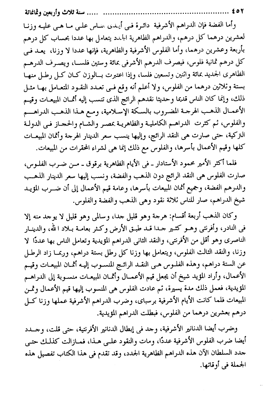 وَأما الْفضة فَإِن الدَّرَاهِم الأشرفية دَائِرَة فِي أَيدي النَّاس على مَا هِيَ عَلَيْهِ وزنا لعشرين درهما كل دِرْهَم وَالدَّرَاهِم الظَّاهِرِيَّة الجدد يتعامل بهَا عددا بِحِسَاب كل دِرْهَم بأَرْبعَة وَعشْرين درهما وَأما الْفُلُوس الأشرفية والظاهرية فَإِنَّهَا عددا لَا وزنا يعد فِي كل دِرْهَم ثَمَانِيَة فلوس فَيصْرف الدِّرْهَم الأشرفي بِمِائَة وَسِتِّينَ فلسًا وَيصرف الدِّرْهَم الظَّاهِرِيّ الْجَدِيد بِمِائَة وإثنين وَتِسْعين فلسًا وَإِذا إعتبرت بِالْوَزْنِ كَانَ كل رَطْل مِنْهَا بِسِتَّة وَثَلَاثِينَ درهما من الْفُلُوس وَلَا أعلم أَنه وَقع فِي تعدد النُّقُود المتعامل بهَا مثل ذَلِك وَإِنَّمَا كَانَ النَّاس قَدِيما وحديثًا نقدهم الرائج الَّذِي تنْسب إِلَيْهِ أَثمَان المبيعات وقيم الْأَعْمَال الذَّهَب الهرجة الْمَضْرُوب بالسكة الإسلامية وَمَعَ هَذَا الذَّهَب الدَّرَاهِم والفلوس ثمَّ كثرت الدَّرَاهِم الكاملية أَو الظَّاهِرِيَّة بِمصْر وَالشَّام والحجاز فِي الدولة التركية حَتَّى صَارَت هِيَ النَّقْد الرائج وإليها ينْسب سعر الدِّينَار الرجة وأثمان المبيعات كلهَا وقيم الْأَعْمَال بأسرها والفلوس مَعَ ذَلِك إِنَّمَا هِيَ لشراء المحقرات من المبيعات. فَلَمَّا أَكثر الْأَمِير مَحْمُود الأستادار فِي الْأَيَّام الظَّاهِرِيَّة برقوق من ضرب الْفُلُوس صَارَت الْفُلُوس هِيَ النَّقْد الرائج دون الذَّهَب وَالْفِضَّة وَنسب إِلَيْهَا سعر الدِّينَار الذَّهَب وَالدِّرْهَم الْفضة وَجَمِيع أَثمَان المبيعات بأسرها وَعَامة قيم الْأَعْمَال إِلَى أَن ضرب الْمُؤَيد شيخ الدَّرَاهِم صَار للنَّاس ثَلَاثَة نقود: وَهِي الذَّهَب وَالْفِضَّة والفلوس. وَكَانَ الذَّهَب أَرْبَعَة أَقسَام. هرجة وَهُوَ قَلِيل جدا وسالمي وَهُوَ قَلِيل لَا يُوجد مِنْهُ إِلَّا فِي النَّادِر وأفرنتي وَهُوَ كثير جدا قد طبق الأَرْض وَكثر بعامة بِلَاد الله وَالدِّينَار الناصري وَهُوَ أقل من الأفرنتي والنقد الثَّانِي الدَّرَاهِم المؤيدية وتعامل النَّاس بهَا عددا لَا وزنا والنقد الثَّالِث الْفُلُوس ويتعامل بهَا وزنا كل رَطْل بِسِتَّة دَرَاهِم وَرُبمَا زَاد الرطل عَن السِّتَّة دَرَاهِم وَهَذِه الْفُلُوس هِيَ النَّقْد الرائج الْمَنْسُوب إِلَيْهِ أَثمَان المبيعات وقيم الْأَعْمَال وَأَرَادَ الْمُؤَيد شيخ أَن يَجْعَل قيم الْأَعْمَال وأثمان المبيعات منسوبة إِلَى الدَّرَاهِم المؤيدية فَعمل ذَلِك مُدَّة يسيره ثمَّ عَادَتْ الْفُلُوس هِيَ الْمَنْسُوب إِلَيْهَا قيم الْأَعْمَال وَثمن المبيعات فَلَمَّا كَانَت الْأَيَّام الأشرفية برسباى وَضرب الدَّرَاهِم الأشرفية عَملهَا وزنا كل دِرْهَم بِعشْرين درهما من الْفُلُوس فبطلت الدَّرَاهِم المؤيدية. وَضرب أَيْضا الدَّنَانِير الأشرفية وجد فِي إبِْطَال الدَّنَانِير الأفرنتية حَتَّى قلت وجدد أَيْضا ضرب الْفُلُوس الأشرفية عددا وَمَات والنقود على هَذَا فمازالت كَذَلِك حَتَّى جدد السُّلْطَان الْآن هَذِه الدَّرَاهِم الظَّاهِرِيَّة الجدد وَقد تقدم فِي هَذَا الْكتاب تَفْصِيل هَذِه الْجُمْلَة فِي أَوْقَاتهَا.