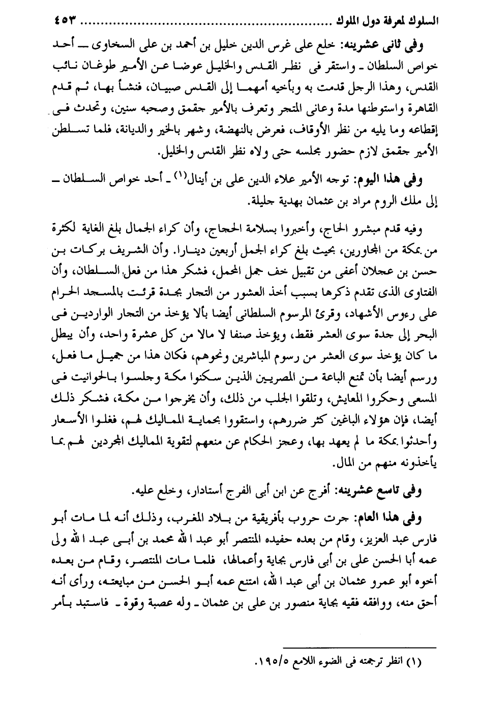 وَفِي ثَانِي عشرينه: خلع على غرس الدّين خَلِيل بن أَحْمد بن على السخاوي أحد خَواص السُّلْطَان وإستقر فِي نظر الْقُدس والخليل عوضا عَن الْأَمِير طوغان نَائِب الْقُدس وَهَذَا الرجل قدمت بِهِ وبأخيه أمهما إِلَى الْقُدس صبيان فَنَشَأَ بهَا ثمَّ قدم الْقَاهِرَة وإستوطنها مُدَّة وعانى المتجر وتعرف بالأمير جقمق وَصَحبه سِنِين وتحدث فِي إقطاعه وَمَا يَلِيهِ من نظر الْأَوْقَاف فَعرض بالنهضة وَشهر بِالْخَيرِ والديانة فَلَمَّا تسلطن الْأَمِير جقمق لَازم حُضُور مَجْلِسه حَتَّى ولاه نظر الْقُدس والخليل. وَفِي هَذَا الْيَوْم: توجه الْأَمِير عَلَاء الدّين على بن أينال أحد خَواص السُّلْطَان إِلَى ملك الرّوم مُرَاد بن عُثْمَان بهدية جليلة. وَفِيه قدم مبشرو الْحَاج وأخبروا بسلامة الْحجَّاج وَأَن كِرَاء الْجمال بلغ الْغَايَة لِكَثْرَة من بِمَكَّة من المجاورين بِحَيْثُ بلغ كِرَاء الْجمل أَرْبَعِينَ دِينَارا. وَأَن الشريف بَرَكَات بن حسن بن عجلَان أعفى من تَقْبِيل خف جمل الْمحمل فَشكر هَذَا من فعل السُّلْطَان وَأَن الفتاوي الَّذِي تقدم ذكرهَا بِسَبَب أَخذ العشور من التُّجَّار بجدة قُرِئت بِالْمَسْجِدِ الْحَرَام على رُؤُوس الأشهاد وقرىء المرسوم السلطاني أَيْضا بألا يُؤْخَذ من التُّجَّار الواردين فِي الْبَحْر إِلَى جدة سوى الْعشْر فَقَط وَيُؤْخَذ صنفا لَا مَالا من كل عشرَة وَاحِد وَأَن يبطل مَا كَانَ يُؤْخَذ سوى الْعشْر من رسوم المباشرين وَنَحْوهم فَكَانَ هَذَا من جميل مَا فعل ورسم أَيْضا بِأَن تمنع الباعة من المصريين الَّذين سكنوا مَكَّة وجلسوا بالحوانيت فِي الْمَسْعَى وحكروا المعايش وتلقوا الجلب من ذَلِك وَأَن يخرجُوا من مَكَّة فَشكر ذَلِك أَيْضا فَإِن هَؤُلَاءِ الباغين كثر ضررهم وإستقووا بحماية المماليك لَهُم فغلوا الأسعار وأحدثوا بِمَكَّة مَا لم يعْهَد بهَا وَعجز الْحُكَّام عَن مَنعهم لتقوية المماليك المجردين لَهُم بِمَا يأخذونه مِنْهُم من المَال. وَفِي تَاسِع عشرينه: أفرج عَن ابْن أبي الْفرج أستادار وخلع عَلَيْهِ. وَفِي هَذَا الْعَام: جرت حروب بأفريقية من بِلَاد الْمغرب وَذَلِكَ أَنه لما مَاتَ أَبُو فَارس عبد الْعَزِيز وَقَامَ من بعده حفيده الْمُنْتَصر أَبُو عبد الله مُحَمَّد بن أَبى عبد الله ولى عَمه أَبَا الْحسن على بن أبي فَارس بجاية وأعمالها فَلَمَّا مَاتَ الْمُنْتَصر وَقَامَ من بعده أَخُوهُ أَبُو عَمْرو عُثْمَان بن أبي عبد الله إمتنع عَمه أَبُو الْحسن من مبايعته وَرَأى أَنه أَحَق مِنْهُ وَوَافَقَهُ فَقِيه بجاية مَنْصُور بن على بن عُثْمَان وَله عصبَة وَقُوَّة فإستبد بِأَمْر