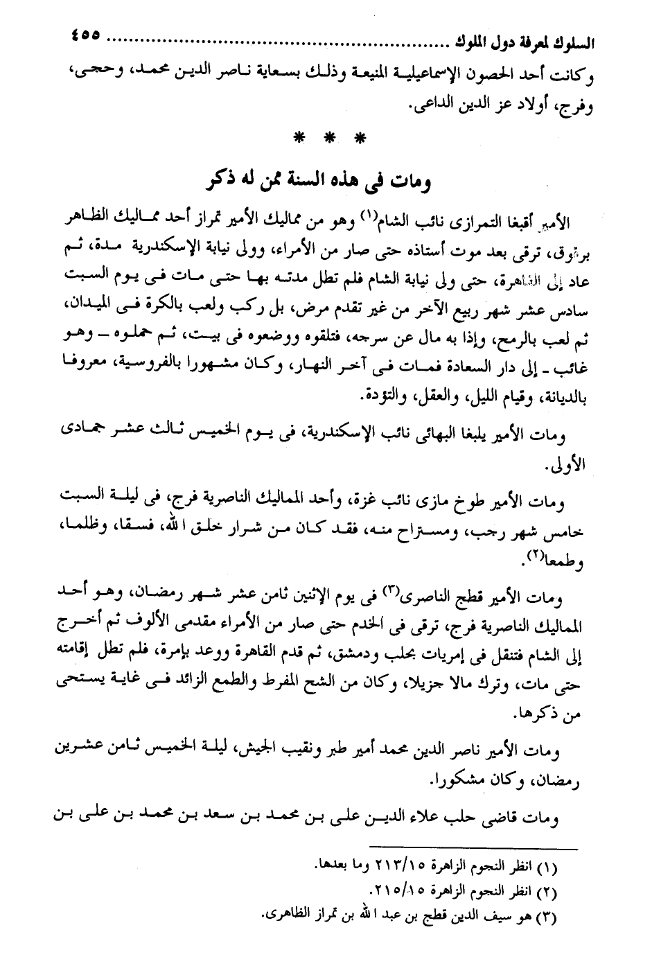 وَكَانَت أحد الْحُصُون الإسماعلية المنيعة وَذَلِكَ بسعاية نَاصِر الدّين مُحَمَّد وحجي وَفرج أَوْلَاد عز الدّين الدَّاعِي. وَمَات فِي هَذِه السّنة مِمَّن لَهُ ذكر الْأَمِير أقبغا التمرازى نَائِب الشَّام وَهُوَ من مماليك الْأَمِير تمراز أحد مماليك الظَّاهِر برقوق تّرقى بعد موت أستاذه حَتَّى صَار من الْأُمَرَاء وَولى نِيَابَة الْإسْكَنْدَريَّة مُدَّة ثمَّ عَاد إِلَى الْقَاهِرَة حَتَّى ولي نِيَابَة الشَّام فَلم تطل مدَّته بهَا حَتَّى مَاتَ فِي يَوْم السبت سادس عشر شهر ربيع الآخر من غير تقدم مرض بل ركب وَلعب بالكرة فِي الميدان ثمَّ لعب بِالرُّمْحِ وَإِذا بِهِ مَال عَن سرحه فتلقوه ووضعوه فِي بَيت ثمَّ حملوه وَهُوَ غَائِب إِلَى دَار السَّعَادَة فَمَاتَ فِي أخر النَّهَار وَكَانَ مَشْهُورا بالفروسية مَعْرُوفا بالديانة وَقيام اللَّيْل وَالْعقل والتؤدة. وَمَات الْأَمِير يلبغا البهائي نَائِب الْإسْكَنْدَريَّة فِي يَوْم الْخَمِيس ثَالِث عشر جمادي الأولي. وَمَات الْأَمِير طوخ مازي نَائِب غَزَّة وَأحد المماليك الناصرية فرج فِي لَيْلَة السبت خَامِس شهر رَجَب ومستراح مِنْهُ فقد كَانَ من شرار خلق الله فسقًا وظلمًا وَطَمَعًا وَمَات الْأَمِير قطج الناصري فِي يَوْم الْإِثْنَيْنِ ثامن عشر شهر رَمَضَان وَهُوَ أحد المماليك الناصرية فرج ترقي فِي الخدم حَتَّى صَار من الْأُمَرَاء مقدمي الألوف ثمَّ أخرج إِلَى الشَّام فتنقل فِي إمريات بحلب ودمشق ثمَّ قدم الْقَاهِرَة ووعد بإمرة فَلم تطل إِقَامَته حَتَّى مَاتَ وَترك مَالا جزيلاً وَكَانَ من الشُّح المفرط والطمع الزَّائِد فِي غَايَة يستحي من ذكرهَا. وَمَات الْأَمِير نَاصِر الدّين مُحَمَّد أَمِير طبر ونقيب الْجَيْش لَيْلَة الْخَمِيس ثامن عشْرين رَمَضَان وَكَانَ مشكوراً. وَمَات قَاضِي حلب عَلَاء الدّين على بن مُحَمَّد بن سعد بن مُحَمَّد بن على بن