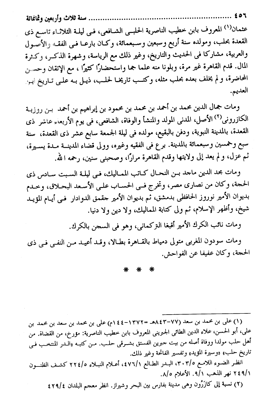 عُثْمَان الْمَعْرُوف بإبن خطيب الناصرية الْحلَبِي الشَّافِعِي فِي لَيْلَة الثُّلَاثَاء تَاسِع ذِي الْقعدَة بحلب ومولده سنة أَربع وَسبعين وَسَبْعمائة وَكَانَ بارعًا فِي الْفِقْه وَالْأُصُول والعربية مشاركًا فِي الحَدِيث والتاريخ وَغير ذَلِك مَعَ الرياسة وشهرة الذّكر وَكَثْرَة المَال. قدم الْقَاهِرَة غير مرّة وبلونا مِنْهُ علما جمًا وإستحضارًا كثيرا مَعَ الإتقان وَحسن المحاضرة وَلم يخلف بعده بحلب مثله وَكتب تَارِيخا لحلب ذيل بِهِ على تَارِيخ ابْن العديم. وَمَات جمال الدّين مُحَمَّد بن أَحْمد بن عمد بن مَحْمُود بن إِبْرَاهِيم بن أَحْمد بن روزبة الكازروني الأَصْل الْمدنِي المولد والمنشأ والوفاة الشَّافِعِي فِي يَوْم الْأَرْبَعَاء عَاشر ذِي الْقعدَة بِالْمَدِينَةِ النَّبَوِيَّة وَدفن بِالبَقِيعِ مولده فِي لَيْلَة الْجُمُعَة سَابِع عشر ذِي الْقعدَة سنة سبع وَخمسين وَسَبْعمائة بِالْمَدِينَةِ. برع فِي الْفَقِيه وَغَيره وَولي قَضَاء الْمَدِينَة مُدَّة يسيرَة ثمَّ عزل وَلم يعد إِلَى ولايتها وَقدم الْقَاهِرَة مرَارًا وصحبني سِنِين رَحمَه الله. وَمَات مجد الدّين ماجد بن النحال كَاتب المماليك فِي لَيْلَة السبت سادس ذِي الْحجَّة وَكَانَ من نَصَارَى مصر وَتخرج فِي الْحساب على الأسعد البحلاق وخدم بديوان الْأَمِير نوروز الحافظي بِدِمَشْق ثمَّ بديوان الْأَمِير جقمق الدوادار فِي أَيَّام الْمُؤَيد شيخ وَأظْهر الْإِسْلَام ثمَّ ولي كِتَابَة المماليك وَلَا دين وَلَا دنيا. وَمَات نَائِب الكرك الْأَمِير أقبغا التركماني وَهُوَ فِي السجْن بالكرك. وَمَات سودون المغربي مُتَوَلِّي دمياط بِالْقَاهِرَةِ بطالاً وَقد أُعِيد من النَّفْي فِي ذِي الْحجَّة وَكَانَ عفيفًا عَن الْفَوَاحِش.