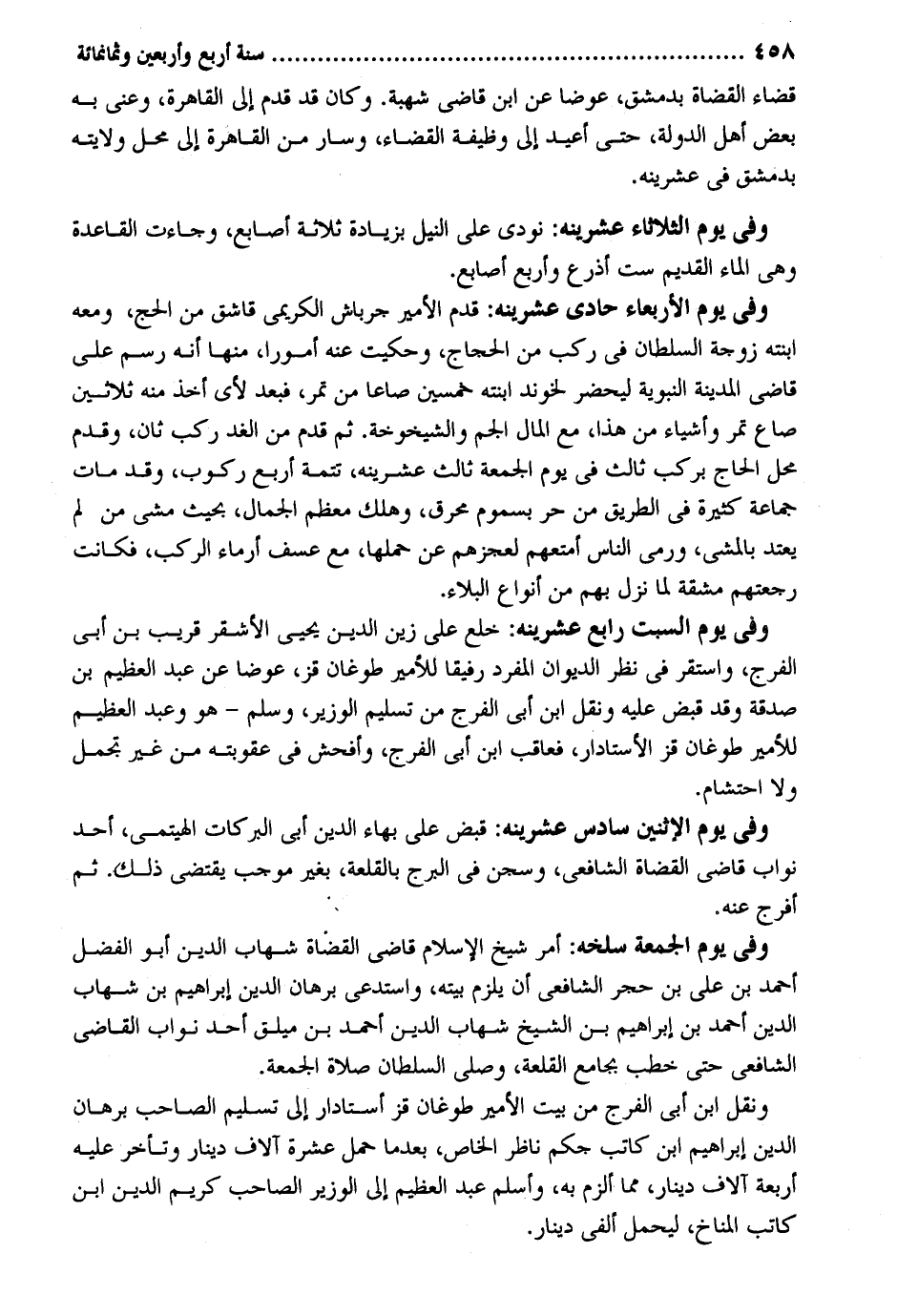 قَضَاء الْقُضَاة بِدِمَشْق عوضا عَن ابْن قَاضِي شُهْبَة. وَكَانَ قد قدم إِلَى الْقَاهِرَة وعني بِهِ بعض أهل الدولة حَتَّى أُعِيد إِلَى وَظِيفَة الْقَضَاء وَسَار من الْقَاهِرَة إِلَى مَحل ولَايَته بِدِمَشْق فِي عشرينه. وَفِي يَوْم الثُّلَاثَاء عشرينه: نُودي على النّيل بِزِيَادَة ثَلَاثَة أَصَابِع وَجَاءَت الْقَاعِدَة وَهِي المَاء الْقَدِيم سِتّ أَذْرع وَأَرْبع أَصَابِع. وَفِي يَوْم الْأَرْبَعَاء حادي عشرينه: قدم الْأَمِير جرباش الكريمي قاشق من الْحَج وَمَعَهُ إبنته زَوْجَة السُّلْطَان فِي ركب من الْحجَّاج وحكيت عَنهُ أمورًا مِنْهَا أَنه رسم على قَاضِي الْمَدِينَة النَّبَوِيَّة ليحضر لخوند إبنته خمسين صَاعا من تمر فَبعد لأي أَخذ مِنْهُ ثَلَاثِينَ صَاع تمر وَأَشْيَاء من هَذَا مَعَ المَال الجم والشيخوخة. ثمَّ قدم من الْغَد ركب ثَان وَقدم مَحل الْحَاج بركب ثَالِث فِي يَوْم الْجُمُعَة ثَالِث عشرينه تَتِمَّة أَربع ركُوب وَقد مَاتَ جمَاعَة كَثِيرَة فِي الطَّرِيق من حر بسموم محرق وَهلك مُعظم الْجمال بِحَيْثُ مشي من لم يعْتد بِالْمَشْيِ وَرمي النَّاس أمتعهم لعجزهم عَن حملهَا مَعَ عسف أرماء الركب فَكَانَت رجعتهم مشقة لما نزل بهم من أَنْوَاع الْبلَاء. وَفِي يَوْم السبت رَابِع عشرينه: خلع على زين الدّين يحيى الْأَشْقَر قريب بن أَبى الْفرج وإستقر فِي نظر الدِّيوَان الْمُفْرد رَفِيقًا للأمير طوغان قَز عوضا عَن عبد الْعَظِيم بن صَدَقَة وَقد قبض عَلَيْهِ وَنقل ابْن أبي الْفرج من تَسْلِيم الْوَزير وَسلم هُوَ وَعبد الْعَظِيم للأمير طوغان قَز الأستادار فعاقب ابْن أبي الْفرج وأفحش فِي عُقُوبَته من غير تجمل وَلَا إحتشام. وَفِي يَوْم الْإِثْنَيْنِ سادس عشرينه: قبض على بهاء الدّين أبي البركات الهيتمي أحد نواب قَاضِي الْقُضَاة الشَّافِعِي وسجن فِي البرج بالقلعة بِغَيْر مُوجب يَقْتَضِي ذَلِك ثمَّ أفرج عَنهُ. وَفِي يَوْم الْجُمُعَة سلخه: أَمر شيخ الْإِسْلَام قَاضِي الْقُضَاة شهَاب الدّين أَبُو الْفضل أَحْمد بن عَليّ بن حجو الشَّافِعِي أَن يلْزم بَيته واستدعي برهَان الدّين إِبْرَاهِيم بن شهَاب الدّين أَحْمد بن إِبْرَاهِيم بن الشَّيْخ شهَاب الدّين أَحْمد بن ميلق أحد نواب القَاضِي الشَّافِعِي حَتَّى خطب بِجَامِع القلعة وَصلى السُّلْطَان صَلَاة الْجُمُعَة. وَنقل ابْن أبي الْفرج من بَيت الْأَمِير طوغان قَز أستادار إِلَى تَسْلِيم الصاحب برهَان الدّين إِبْرَاهِيم ابْن كَاتب جكم نَاظر الْخَاص بَعْدَمَا حمل عشرَة آلَاف دِينَار وَتَأَخر عَلَيْهِ أَرْبَعَة آلَاف دِينَار مِمَّا ألزم بِهِ وَأسلم عبد الْعَظِيم إِلَى الْوَزير الصاحب كريم الدّين ابْن كَاتب المناخ ليحمل ألفي دِينَار.
