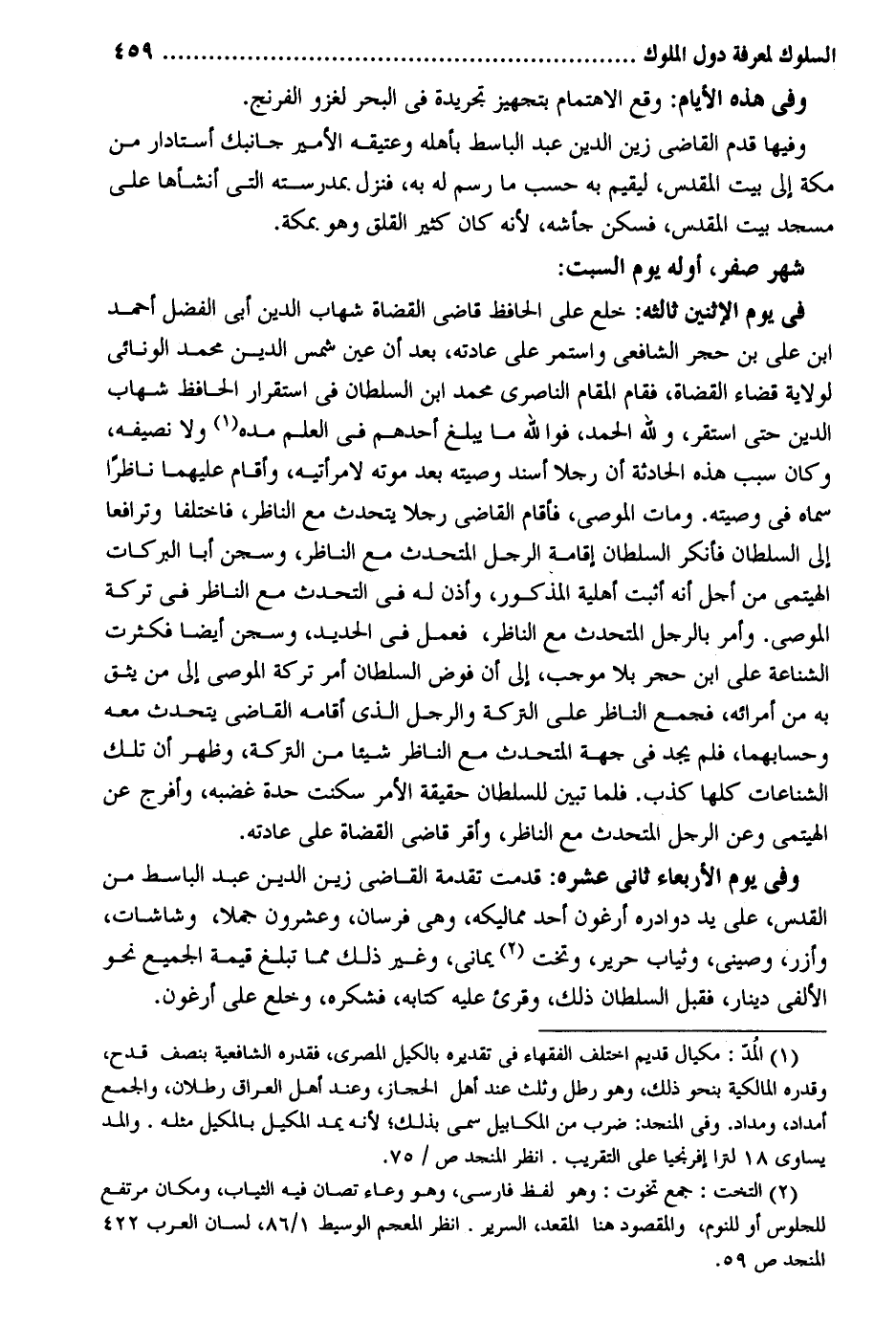وَفِي هَذِه الْأَيَّام: وَقع الإهتمام بتجهيز تجريدة فِي الْبَحْر لغزو الفرنج. وفيهَا قدم القَاضِي زين الدّين عبد الباسط بأَهْله وعتيقه الْأَمِير جَانِبك أستادار من مَكَّة إِلَى بَيت الْمُقَدّس ليقيم بِهِ حسب مَا رسم لَهُ بِهِ فَنزل بمدرسته الَّتِي أَنْشَأَهَا على مَسْجِد بَيت الْمُقَدّس فسكن جأشه لِأَنَّهُ كَانَ كثير القلق وَهُوَ بِمَكَّة. شهر صفر أَوله يَوْم السبت: فِي يَوْم الْإِثْنَيْنِ ثالثه: خلع على الْحَافِظ قَاضِي الْقُضَاة شهَاب الدّين أبي الْفضل أَحْمد ابْن على بن حجر الشَّافِعِي وإستمر على عَادَته بعد أَن عين شمس الدّين مُحَمَّد الونائي لولاية قَضَاء الْقُضَاة فَقَامَ الْمقَام الناصري مُحَمَّد ابْن السُّلْطَان فِي إستقرار الْحَافِظ شهَاب الدّين حَتَّى إستقر وَللَّه الْحَمد فو الله مَا يبلغ أحدهم فِي الْعلم مده وَلَا نصيفه وَكَانَ سَبَب هَذِه الْحَادِثَة أَن رجلا أسْند وَصيته بعد مَوته لإمرأتيه وَأقَام عَلَيْهِمَا نَاظرا سَمَّاهُ فِي وَصيته. وَمَات الْمُوصي فَأَقَامَ القَاضِي رجلا يتحدث مَعَ النَّاظر فإختلفا وترافعا إِلَى السُّلْطَان فَأنْكر السُّلْطَان إِقَامَة الرجل المتحدث مَعَ النَّاظر وسجن أَبَا البركات الهيتمي من أجل أَنه أثبت أَهْلِيَّة الْمَذْكُور وَأذن لَهُ فِي التحدث مَعَ النَّاظر فِي تَرِكَة الْمُوصي. وَأمر بِالرجلِ المتحدث مَعَ النَّاظر فَعمل فِي الْحَدِيد وسجن أَيْضا فكثرت الشناعة على ابْن حجر بِلَا مُوجب إِلَى أَن فوض السُّلْطَان أَمر تَرِكَة الْمُوصي إِلَى من يَثِق بِهِ من أمرائه فَجمع النَّاظر على التَّرِكَة وَالرجل الَّذِي أَقَامَهُ القَاضِي يتحدث مَعَه وحسابهما فَلم يجد فِي جِهَة المتحدث مَعَ النَّاظر شَيْئا من التَّرِكَة وَظهر أَن تِلْكَ الشناعات كلهَا كذب. فَلَمَّا تبين للسُّلْطَان حَقِيقَة الْأَمر سكنت حِدة غَضَبه وَأَفْرج عَن الهيتمي وَعَن الرجل المتحدث مَعَ النَّاظر وَأقر قَاضِي الْقُضَاة على عَادَته. وَفِي يَوْم الْأَرْبَعَاء ثَانِي عشره: قدمت تقدمة القَاضِي زين الدّين عبد الباسط من الْقُدس على يَد دوادره أرغون أحد مماليكه وَهِي فرسَان وَعِشْرُونَ جملا وشاشات وأزر وصيني وَثيَاب حَرِير وتخت يماني وَغير ذَلِك مِمَّا تبلغ قيمَة الْجَمِيع نَحْو الألفي دِينَار فَقبل السُّلْطَان ذَلِك، وَقُرِئَ عَلَيْهِ كِتَابه، فشكره، وخلع على أرغون.