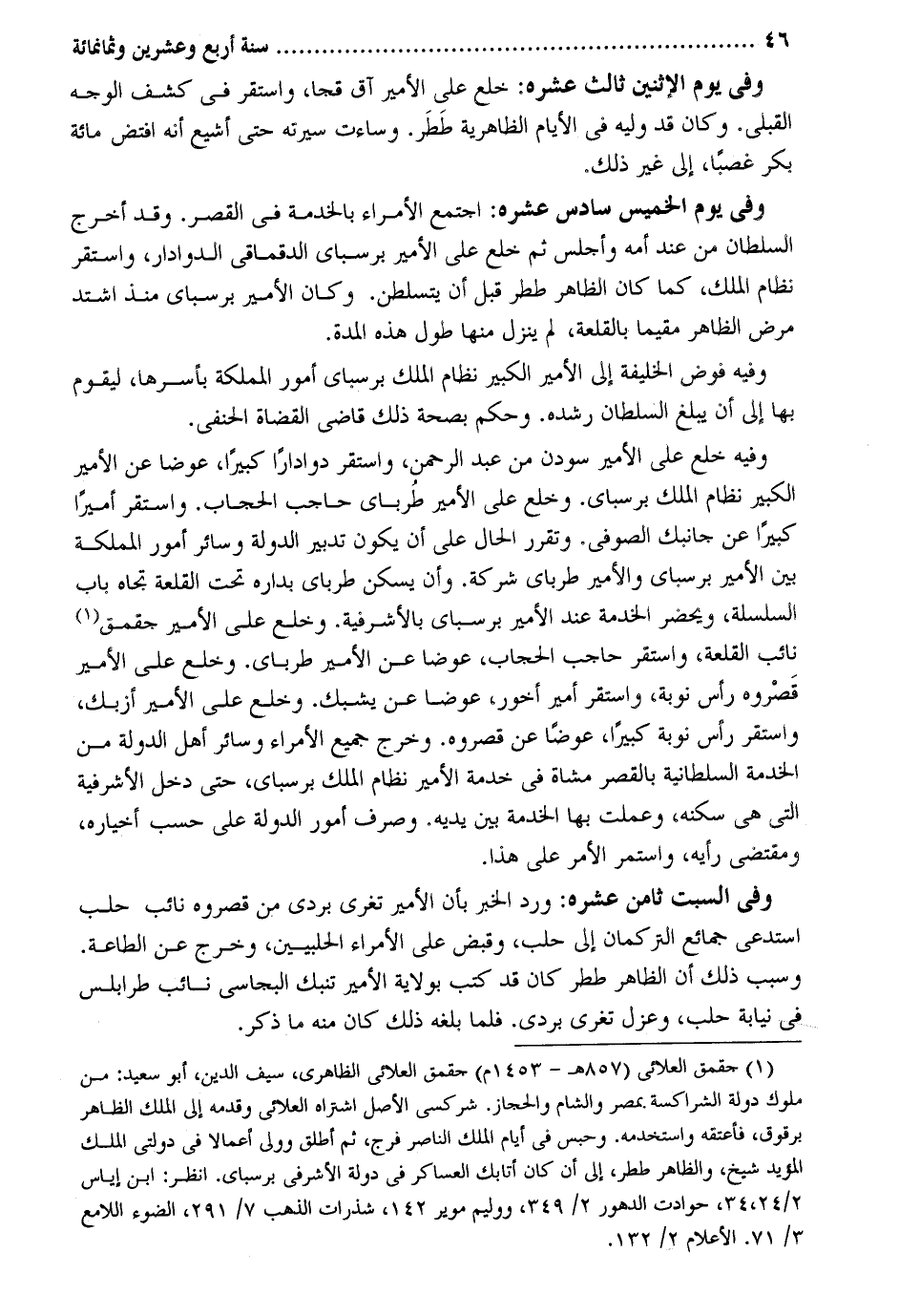 وَفِي يَوْم الِاثْنَيْنِ ثَالِث عشره: خلع على الْأَمِير آق قجا وَاسْتقر فِي كشف الْوَجْه القبلي وَكَانَ قد وليه فِي الْأَيَّام الظَّاهِرِيَّة ططر. وَسَاءَتْ سيرته حَتَّى أشيع أَنه افتض مائَة بكر غصبا إِلَى غير ذَلِك. وَفِي يَوْم الْخَمِيس سادس عشره: اجْتمع الْأُمَرَاء بِالْخدمَةِ فِي الْقصر. وَقد أخرج السُّلْطَان من عِنْد أمه وأجلس ثمَّ خلع على الْأَمِير برسباي الدقماقي الدوادار وَاسْتقر نظام الْملك كَمَا كَانَ الظَّاهِر ططر قبل أَن يتسلطن. وَكَانَ الْأَمِير برسباي مُنْذُ اشْتَدَّ مرض الظَّاهِر مُقيما بالقلعة لم ينزل مِنْهَا طول هَذِه الْمدَّة. وَفِيه فوض الْخَلِيفَة إِلَى الْأَمِير الْكَبِير نظام الْملك برسباي أُمُور المملكة بأسرها ليقوم بهَا إِلَى أَن يبلغ السُّلْطَان رشده. وَحكم بِصِحَّة ذَلِك قَاضِي الْقُضَاة الْحَنَفِيّ. وَفِيه خلع على الْأَمِير سودن من عبد الرَّحْمَن وَاسْتقر دوادارا كَبِيرا عوضا عَن الْأَمِير الْكَبِير نظام الْملك برسباي. وخلع على الْأَمِير طرباي حَاجِب الْحجاب. وَاسْتقر أَمِيرا كَبِيرا عَن جَانِبك الصُّوفِي. وتقرر الْحَال على أَن يكون تَدْبِير الدولة وَسَائِر أُمُور المملكة بيد الْأَمِير برسباي والأمير طرباي شركَة. وَأَن يسكن طرباي بداره تَحت القلعة تجاه بَاب السلسلة ويحضر الْخدمَة عِنْد الْأَمِير برسباي بالأشرفية. وخلع على الْأَمِير جقمق نَائِب القلعة وَاسْتقر حَاجِب الْحجاب عوضا عَن الْأَمِير طرباي. وخلع على الْأَمِير قصروه رَأس نوبَة وَاسْتقر أَمِير أخور عوضا عَن يشبك. وخلع على الْأَمِير أزبك وَاسْتمرّ رَأس نوبَة كَبِيرا عوضا عَن قصروه. وَخرج جَمِيع الْأُمَرَاء وَسَائِر أهل الدولة من الْخدمَة السُّلْطَانِيَّة بِالْقصرِ مشَاة فِي خدمَة الْأَمِير نظام الْملك برسباي حَتَّى دخل الأشرفية الَّتِي هِيَ سكنه وعملت بهَا الْخدمَة بَين يَدَيْهِ. وَصرف أُمُور وَفِي السبت ثامن عشره: ورد الْخَبَر بِأَن الْأَمِير تغري بردي من قصروه نَائِب حلب استدعى جمائع التركمان إِلَى حلب وَقبض على الْأُمَرَاء الحلبيين وَخرج عَن الطَّاعَة. وَسبب ذَلِك أَن الظَّاهِر ططر كَانَ قد كتب بِولَايَة الْأَمِير تنبك البجاسي نَائِب طرابلس فِي نِيَابَة حلب وعزل تغري بردي. فَلَمَّا بلغه ذَلِك كَانَ مِنْهُ مَا ذكر.