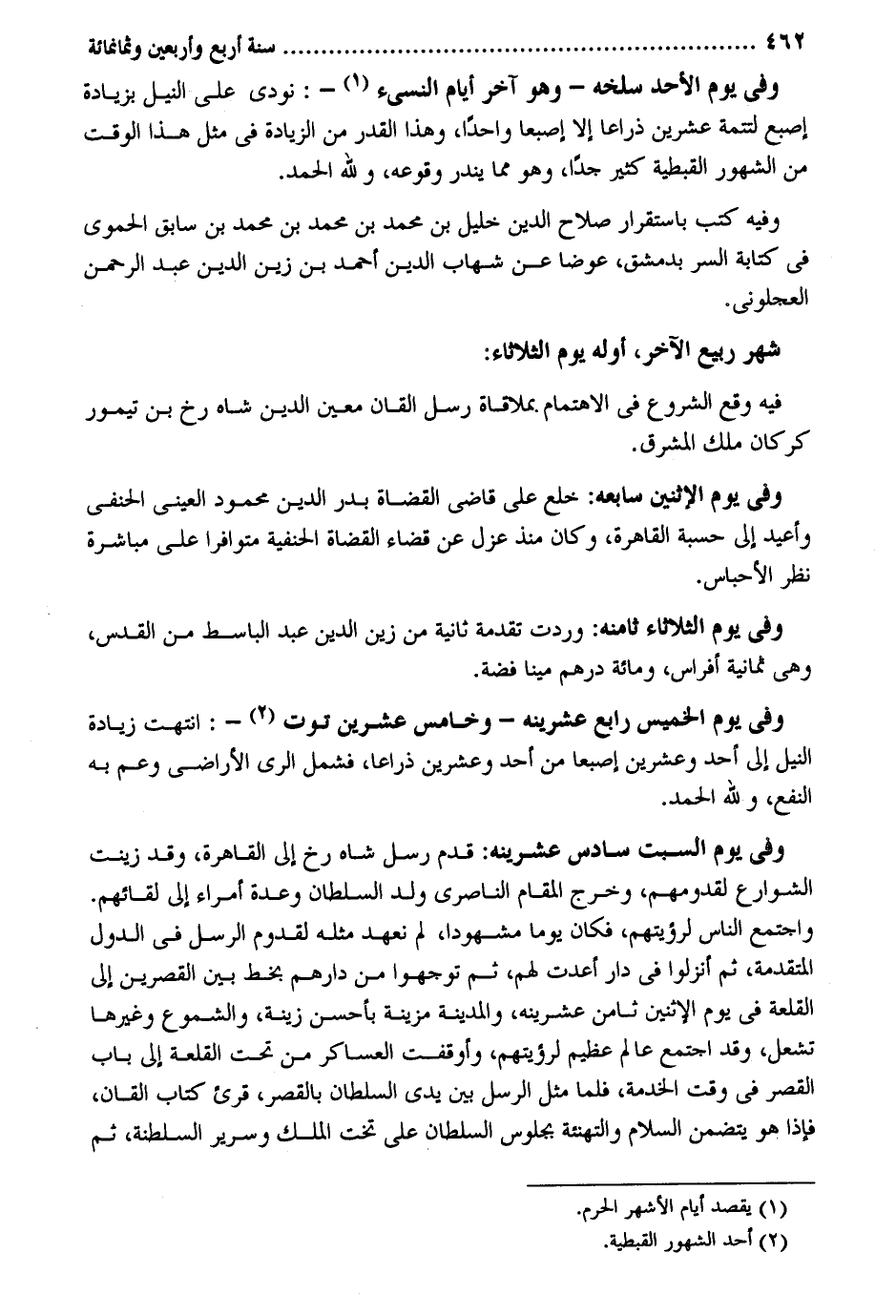 وَفِي يَوْم الْأَحَد سلخه وَهُوَ آخر أَيَّام النسيء: نُودي على النّيل بِزِيَادَة إِصْبَع لتتمة عشْرين ذِرَاعا إِلَّا إصبعًا وَاحِدًا وَهَذَا الْقدر من الزِّيَادَة فِي مثل هَذَا الْوَقْت من الشُّهُور القبطة كثير جدا وَهُوَ مِمَّا ينْدر وُقُوعه وَللَّه الْحَمد. وَفِيه كتب بإستقرار صَلَاح الدّين خَلِيل بن مُحَمَّد بن مُحَمَّد بن مُحَمَّد بن سَابق الْحَمَوِيّ فِي كِتَابَة السِّرّ بِدِمَشْق عوضا عَن شهَاب الدّين أَحْمد بن زين الدّين عبد الرَّحْمَن العجلوني. شهر ربيع الآخر أَوله يَوْم الثُّلَاثَاء: فِيهِ وَقع الشُّرُوع فِي الاهتمام بملاقاة رسل القان معِين الدّين شاه رخ بن تيمور كركان ملك الْمشرق. وَفِي يَوْم الْإِثْنَيْنِ سابعه: خلع على قَاضِي الْقُضَاة بدر الدّين مَحْمُود الْعَيْنِيّ الْحَنَفِيّ وأعيد إِلَى حسبَة الْقَاهِرَة وَكَانَ مُنْذُ عزل عَن قَضَاء الْقُضَاة الْحَنَفِيَّة متوافرًا على مُبَاشرَة نظر الأحباس. وَفِي يَوْم الثُّلَاثَاء ثامنه: وَردت تقدمة ثَانِيَة من زين الدّين عبد الباسط من الْقُدس وَهِي ثَمَانِيَة أَفْرَاس وَمِائَة دِرْهَم مينًا فضَّة. وَفِي يَوْم الْخَمِيس رَابِع عشرينه وخامس عشْرين توت: إنتهت زِيَادَة النّيل إِلَى أحد وَعشْرين إصبعًا من أحد وَعشْرين ذِرَاعا فَشَمَلَ الرّيّ الْأَرَاضِي وَعم بِهِ النَّفْع وَللَّه الْحَمد. وَفِي يَوْم السبت سادس عشرينه: قدم رسل شاه رخ إِلَى الْقَاهِرَة وَقد زينت الشوارع لقدومهم وَخرج الْمقَام الناصري ولد السُّلْطَان وعدة أُمَرَاء إِلَى لقائهم. وأجتمع النَّاس لرؤيتهم فَكَانَ يَوْمًا مشهودًا لم نعهد مثله لقدوم الرُّسُل فِي الدول الْمُتَقَدّمَة ثمَّ أنزلوا فِي دَار أعدت لَهُم ثمَّ توجهوا من دَارهم بِخَط بَين القصرين إِلَى القلعة فِي يَوْم الْإِثْنَيْنِ ثامن عشرينه وَالْمَدينَة مزينة بِأَحْسَن زِينَة والشموع وَغَيرهَا تشعل وَقد اجْتمع عَالم عَظِيم لرؤيتهم وأوقفت العساكر من تَحت القلعة إِلَى بَاب الْقصر فِي وَقت الْخدمَة فَلَمَّا مثل الرُّسُل بَين يَدي السُّلْطَان بِالْقصرِ قرئَ كتاب القان فَإِذا هُوَ يتَضَمَّن السَّلَام والتهنئة بجلوس السُّلْطَان على تخت الْملك وسرير السلطنة ثمَّ