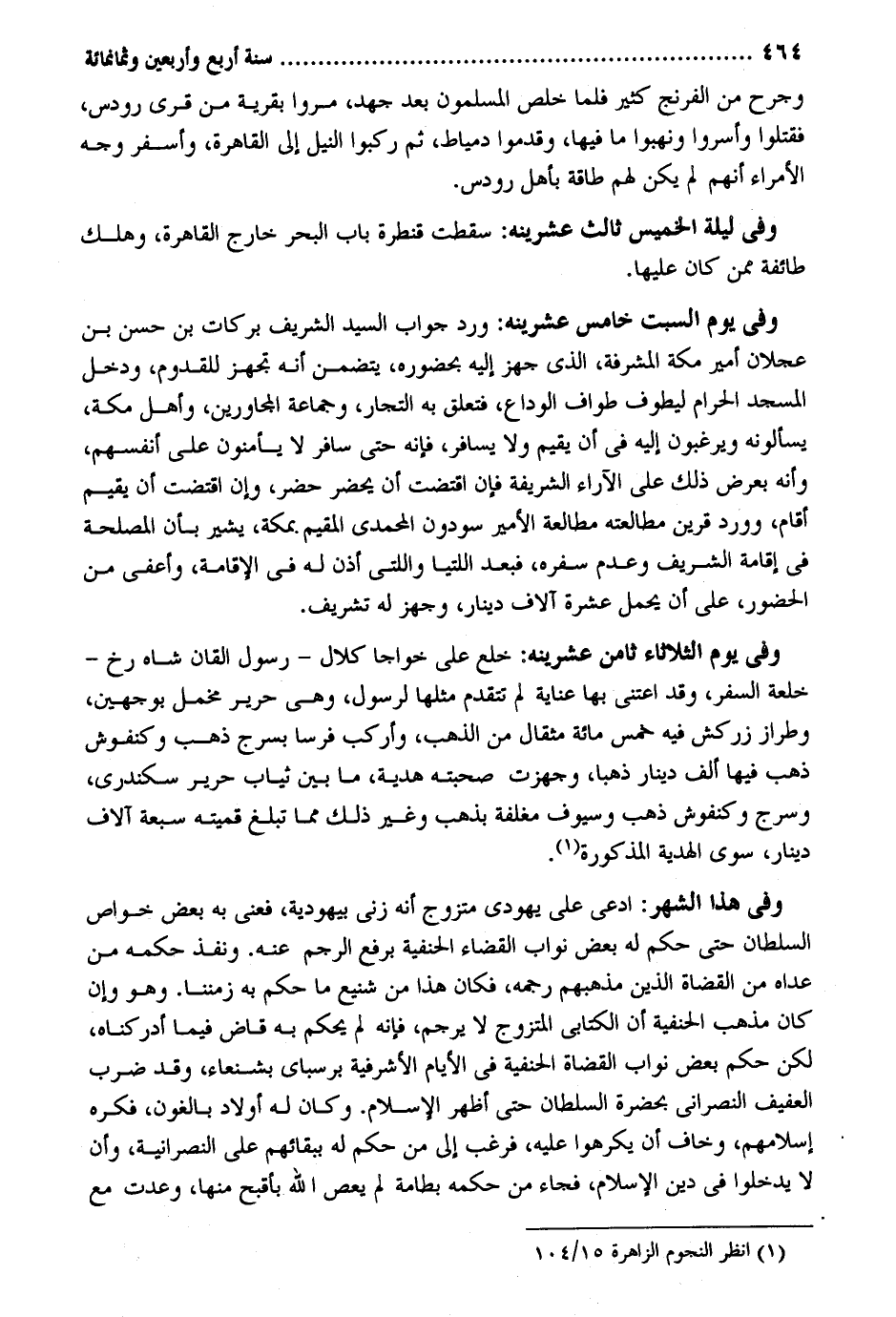 وجرح من الفرنج كثير فَلَمَّا خلص الْمُسلمُونَ بعد جهد مروا بقرية من قرى رودس فَقتلُوا وأسروا ونهبوا مَا فِيهَا وَقدمُوا دمياط ثمَّ ركبُوا النّيل الى الْقَاهِرَة وأسفر وَجه الْأُمَرَاء أَنهم لم يكن لَهُم طَاقَة بِأَهْل رودس. وَفِي لَيْلَة الْخَمِيس ثَالِث عشرينه: سَقَطت قنطرة بَاب الْبَحْر خَارج الْقَاهِرَة وَهلك طَائِفَة مِمَّن كَانَ عَلَيْهَا. وَفِي يَوْم السبت خَامِس عشرينه: ورد جَوَاب السَّيِّد الشريف بَرَكَات بن حسن بن عجلَان أَمِير مَكَّة المشرفة الَّذِي جهز إِلَيْهِ بِحُضُورِهِ يتَضَمَّن أَنه تجهز للقدوم وَدخل الْمَسْجِد الْحَرَام ليطوف طواف الْوَدَاع فَتعلق بِهِ التُّجَّار وَجَمَاعَة المجاورين وَأهل مَكَّة يسألونه ويرغبون إِلَيْهِ فِي أَن يُقيم وَلَا يُسَافر فَإِنَّهُ حَتَّى سَافر لَا يأمنون على أنفسهم وَأَنه بِعرْض ذَلِك على الآراء الشَّرِيفَة فَإِن إقتضت أَن يحضر حضر وَإِن إقتضت أَن يُقيم أَقَامَ وَورد قرين مطالعته مطالعة الْأَمِير سودون المحمدي الْمُقِيم بِمَكَّة يُشِير بِأَن الْمصلحَة فِي إِقَامَة الشريف وَعدم سَفَره فَبعد اللتيا واللتي أذن لَهُ فِي الْإِقَامَة وأعفي من الْحُضُور على أَن يحمل عشرَة آلَاف دِينَار وجهز لَهُ تشريف. وقِي يَوْم الثُّلَاثَاء ثامن عشرينه: خلع على خواجا كلال رَسُول القان شاه رخ خلعة السّفر وَقد إعتني بهَا عناية لم تتقدم مثلهَا لرَسُول وَهِي حَرِير مخمل بِوَجْهَيْنِ وطراز زركش فِيهِ خمس مائَة مِثْقَال من الذَّهَب وأركب فرسا بسرج ذهب وكنفوش ذهب فِيهَا ألف دِينَار ذَهَبا وجهزت صحبته هَدِيَّة مَا بَين ثِيَاب حَرِير سكندري وسرج وكنفوش ذهب وسيوف مغلفة بِذَهَب وَغير ذَلِك مِمَّا تبلغ قميته سَبْعَة آلَاف دِينَار سوى الْهَدِيَّة الْمَذْكُورَة. وَفِي هَذَا الشَّهْر: ادعِي على يَهُودِيّ متزوج أَنه زنى ليهودية فعني بِهِ بعض خَواص السُّلْطَان حَتَّى حكم لَهُ بعض نواب الْقَضَاء الْحَنَفِيَّة بِرَفْع الرَّجْم عَنهُ. وَنفذ حكمه من عداهُ من الْقُضَاة الَّذين مَذْهَبهم رجمه فَكَانَ هَذَا من شنيع مَا حكم بِهِ زَمنا. وَهُوَ وَإِن كَانَ مَذْهَب الْحَنَفِيَّة أَن الْكِتَابِيّ المتزوج لَا يرْجم فَإِنَّهُ لم يحكم بِهِ قَاض فِيمَا أدركناه لَكِن حكم بعض نواب الْقُضَاة الْحَنَفِيَّة فِي الْأَيَّام الأشرفية برسباى بشنعاء وَقد ضرب الْعَفِيف النَّصْرَانِي بِحَضْرَة السُّلْطَان حَتَّى أظهر الْإِسْلَام. وَكَانَ لَهُ أَوْلَاد بالغون فكره إسْلَامهمْ وَخَافَ أَن يكرهوا عَلَيْهِ فَرغب إِلَى من حكم لَهُ ببقائهم على النَّصْرَانِيَّة وَأَن لَا يدخلُوا فِي دين الْإِسْلَام فجَاء من حكمه بطامة لم يعْص الله بأقبح مِنْهَا وعدت مَعَ