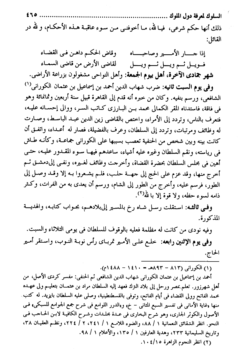 ذَلِك أَنَّهَا حكم شَرْعِي فيا لله مَا أخوفني من سوء عَاقِبَة هَذِه الْأَحْكَام وَللَّه در الْقَائِل: فويل ثمَّ ويل ثمَّ ويل لقَاضِي الأَرْض من قَاضِي السَّمَاء شهر جمادي الْآخِرَة أهل بِيَوْم الْجُمُعَة: وَأهل النواحي مشغولون بزراعة الْأَرَاضِي. وَفِي يَوْم السبت ثَانِيه: ضرب شهَاب الدّين أَحْمد بن إِسْمَاعِيل بن عُثْمَان الكوراني الشَّافِعِي ورسم بنفيه. وَكَانَ من خَبره أَنه قدم إِلَى الْقَاهِرَة قبيل سنة أَرْبَعِينَ وَثَمَانمِائَة وَهُوَ فِي فاقة فاستدناه الْمقر الكمالي مُحَمَّد بن الْبَارِزِيّ كَاتب السِّرّ ووالي إحسانه عَلَيْهِ فتعرف بِالنَّاسِ وَتردد إِلَى الْأُمَرَاء وإختص بِالْقَاضِي زين الدّين عبد الباسط وَصَارَت لَهُ وظائف ومرتبات وَتردد إِلَى السُّلْطَان وَعرف بالفضيلة فَصَارَ لَهُ أَعدَاء وإتفق أَن كَانَت بَينه وَبَين شخص من الْحَنَفِيَّة تعصب بِسَبَبِهَا على الكوراني جمَاعَة وَكَأَنَّهُ طاش فِي رياسته ونقم السُّلْطَان وَغَيره عَلَيْهِ أَشْيَاء ساعدهم فِيهَا سوء الْمَقْدُور عَلَيْهِ حَتَّى أهين فِي مجْلِس السُّلْطَان بِحَضْرَة الْقُضَاة وأخرجت وظائف لغيره وَنفي إِلَى دمشق ثمَّ أخرج مِنْهَا وَقد عزم على الْحَج إِلَى جِهَة حلب فَلم يشعروا بِهِ إِلَّا وَقد وصل إِلَى الطّور فرسم عَلَيْهِ وَأخرج من الطّور إِلَى الشَّام ورسم أَن يعدى بِهِ من الْفُرَات وَكثر ذامه لسوء حَظه وَلَا قُوَّة إِلَّا بِاللَّه. وَفِي ثالثه: إستقلت رسل شاه رخ بِالْمَسِيرِ إِلَى بِلَادهمْ بِجَوَاب كِتَابه والهدية الْمَذْكُورَة. وَفِيه نُودي من كَانَت لَهُ مظْلمَة فَعَلَيهِ بِالْوُقُوفِ للسُّلْطَان فِي يومي الثُّلَاثَاء والسبت. وَفِي يَوْم الْإِثْنَيْنِ رابعه: خلع الْأَمِير تمرباي رَأس نوبَة النوب، وَاسْتقر أَمِير الْحَاج.