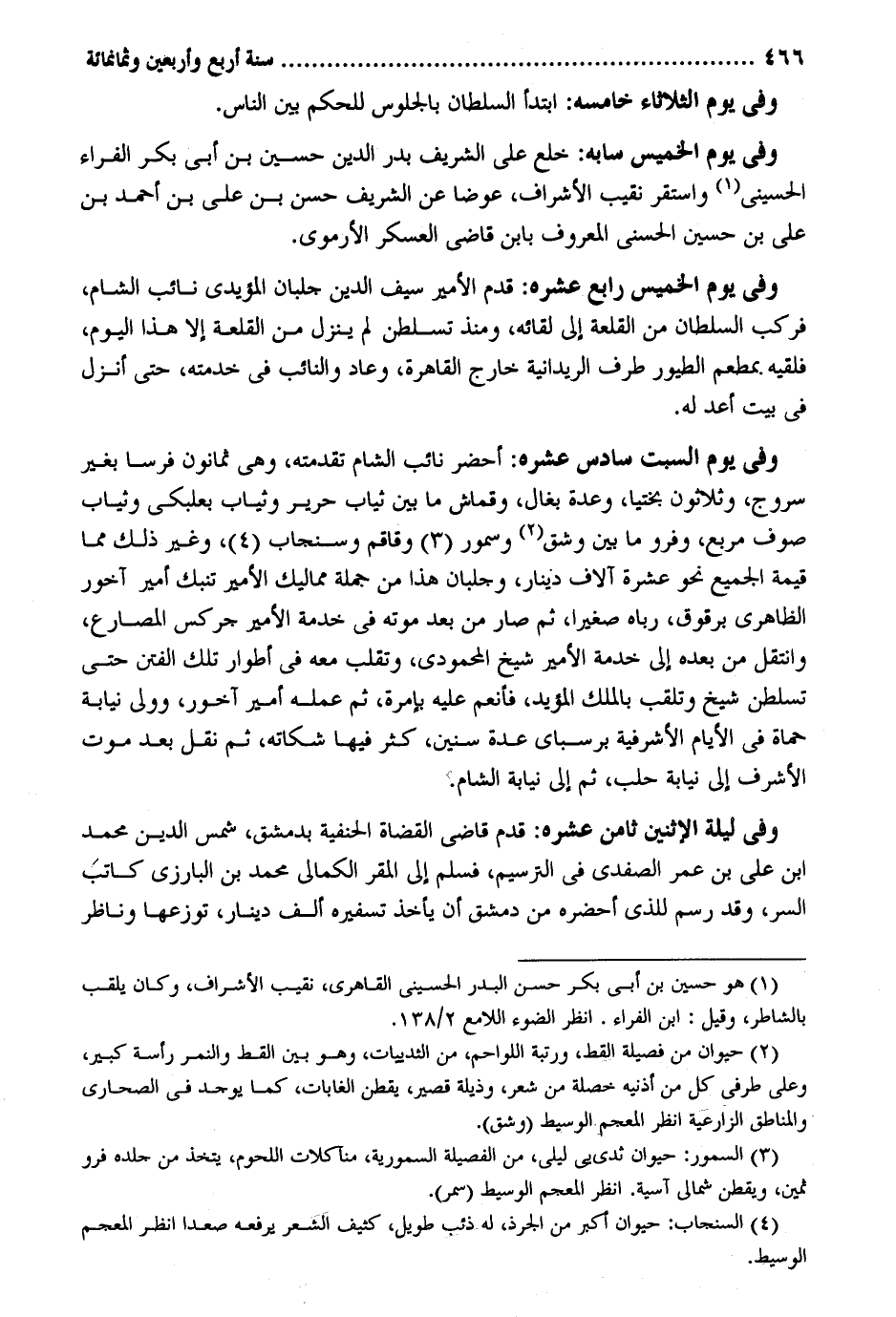 وَفِي يَوْم الثُّلَاثَاء خامسه: إبتدأ السُّلْطَان بِالْجُلُوسِ للْحكم بَين النَّاس. وَفِي يَوْم الْخَمِيس سابعه: خلع على الشريف بدر الدّين حُسَيْن بن أبي بكر الْفراء الْحُسَيْنِي وإستقر نقيب الْأَشْرَاف عوضا عَن الشريف حسن بن عَليّ بن أَحْمد بن عَليّ بن حُسَيْن الحسني الْمَعْرُوف بإبن قَاضِي الْعَسْكَر الأرموي. وَفِي يَوْم الْخَمِيس رَابِع عشره: قدم الْأَمِير سيف الدّين جلبان المؤيدي نَائِب الشَّام فَركب السُّلْطَان من القلعة إِلَى لِقَائِه ومنذ تسلطن لم ينزل من القلعة إِلَّا هَذَا الْيَوْم فَلَقِيَهُ بمطعم الطّور طرف الريدانية خَارج الْقَاهِرَة وَعَاد والنائب فِي خدمته حَتَّى أنزل فِي بَيت أعد لَهُ. وَفِي يَوْم السبت سادس عشره: أحضر نَائِب الشَّام تقدمته وَهِي ثَمَانُون فرسا بِغَيْر سروج وَثَلَاثُونَ بختيًا وعدة بغال وقماش مَا بَين ثِيَاب حَرِير وَثيَاب بعلبكي وَثيَاب صوف مربع وفرو مَا بَين وشق وسمور وقاقم وسنجاب وَغير ذَلِك مِمَّا قيمَة الْجَمِيع نَحْو عشرَة آلَاف دِينَار وجلبان هَذَا من جملَة مماليك الْأَمِير تنبك أَمِير أخور الظَّاهِرِيّ برقوق رباه صَغِيرا ثمَّ صَار من بعد مَوته فِي خدمَة الْأَمِير جركس المصارع وإنتقل من بعده إِلَى خدمَة الْأَمِير شيخ المحمودي وتقلب مَعَه فِي أطوار تِلْكَ الْفِتَن حَتَّى تسلطن شيخ وتلقب بِالْملكِ الْمُؤَيد فأنعم عَلَيْهِ بإمرة ثمَّ عمله أَمِير آخور وَولى نِيَابَة حماة فِي الْأَيَّام الأشرفية برسباى عدَّة سِنِين كثر فِيهَا شكاته ثمَّ نقل بعد موت وَفِي لَيْلَة الْإِثْنَيْنِ ثامن عشره: قدم قَاضِي الْقُضَاة الْحَنَفِيَّة بِدِمَشْق شمس الدّين مُحَمَّد ابْن عَليّ بن عمر الصَّفَدِي فِي الترسيم فَسلم إِلَى الْمقر الكمالي مُحَمَّد بن الْبَارِزِيّ كَاتب السِّرّ وَقد رسم للَّذي أحضرهُ من دمشق أَن يَأْخُذ تسفيره ألف دِينَار توزعها وناظر
