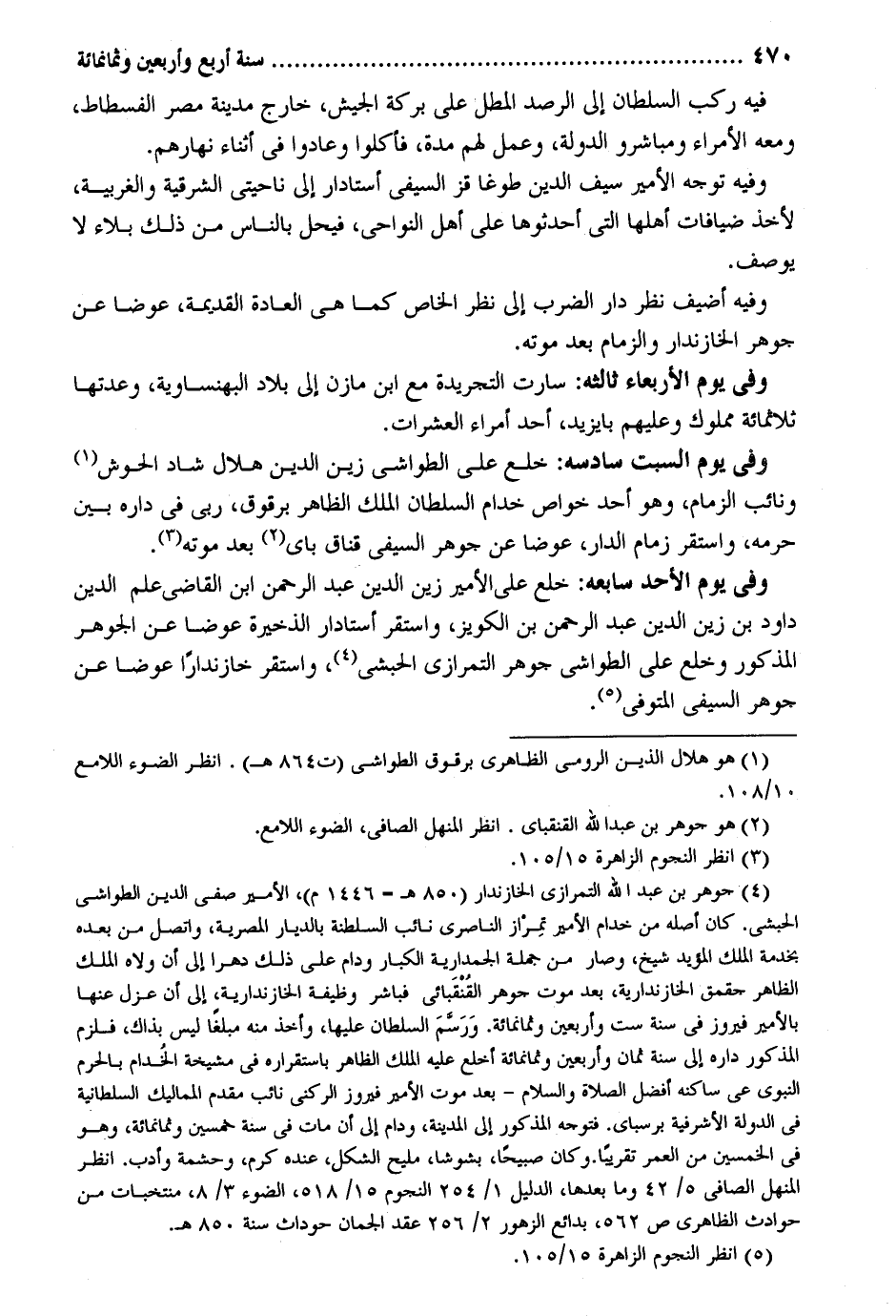 فِيهِ ركب السُّلْطَان إِلَى الرصد المطل على بركَة الْجَيْش خَارج مَدِينَة مصر الْفسْطَاط وَمَعَهُ الْأُمَرَاء ومباشرو الدولة وَعمل لَهُم مُدَّة فَأَكَلُوا وعادوا فِي أثْنَاء نهارهم. وَفِيه توجه الْأَمِير سيف الدّين طوغا قَز السيفي أستادار إِلَى ناحيتي الشرقية والغربية لأخذ ضيافات أَهلهَا الَّتِي أحدثوها على أهل النواحي فَيحل بِالنَّاسِ من ذَلِك بلَاء لَا يُوصف. وَفِيه أضيف نظر دَار الضَّرْب إِلَى نظر الْخَاص كَمَا هِيَ الْعَادة الْقَدِيمَة عوضا عَن جَوْهَر الخازندار والزمام بعد مَوته. وَفِي يَوْم الْأَرْبَعَاء ثالثه: سَارَتْ التجريدة مَعَ ابْن مَازِن إِلَى بِلَاد البهنساوية وعدتها ثَلَاثمِائَة مَمْلُوك وَعَلَيْهِم بايزيد أحد أُمَرَاء العشرات. وَفِي يَوْم السبت سادسه: خلع على الطواشي زين الدّين هِلَال شاد الحوش ونائب الزِّمَام وَهُوَ أحد خَواص خدام السُّلْطَان الْملك الظَّاهِر برقوق رَبِّي فِي دَاره بَين حرمه وإستقر زِمَام الدَّار عوضا عَن جَوْهَر السيفي قناق باى بعد مَوته. وَفِي يَوْم الْأَحَد سابعه: خلع على الْأَمِير زين الدّين عبد الرَّحْمَن ابْن القَاضِي علم الدّين دَاوُد بن زين الدّين عبد الرَّحْمَن بن الكويز وإستقر أستادار الذَّخِيرَة عوضا عَن الْجَوْهَر الْمَذْكُور وخلع على الطواشي جَوْهَر التمرازي الحبشي وإستقر خازندارا عوضا عَن جَوْهَر السيفي المتوفي
