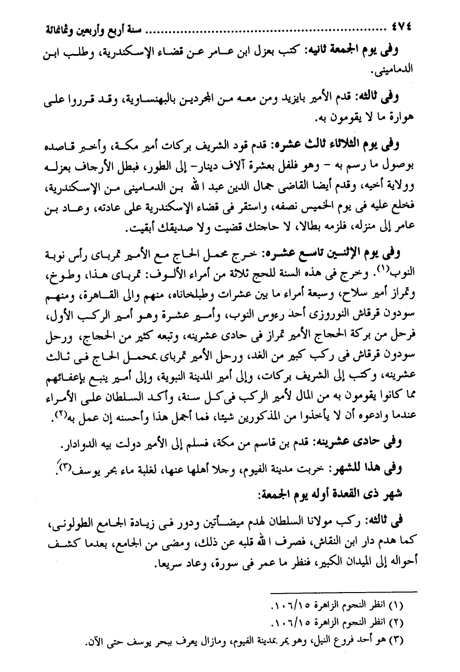 وَفِي يَوْم الْجُمُعَة ثَانِيه: كتب بعزل ابْن عَامر عَن فضاء الْإسْكَنْدَريَّة، وَطلب ابْن الدماميني. وَفِي ثالثه: قدم الْأَمِير بايزيد وَمن مَعَه من المجردين بالبهنساوية وَقد قرروا على هوارة مَا لَا يقومُونَ بِهِ. وَفِي يَوْم الثُّلَاثَاء ثَالِث عشره: قدم قَود الشريف بَرَكَات أَمِير مَكَّة وَأخْبر قاصده بوصول مَا رسم بِهِ وَهُوَ فلفل بِعشْرَة آلَاف دِينَار إِلَى الطّور فَبَطل الأرجاف بعزله وَولَايَة أَخِيه وَقدم أَيْضا القَاضِي جمال الدّين عبد الله بن الدماميني من الْإسْكَنْدَريَّة فَخلع عَلَيْهِ فِي يَوْم الْخَمِيس نصفه وإستقر فِي قَضَاء الْإسْكَنْدَريَّة على عَادَته وَعَاد بن عَامر إِلَى منزله فَلَزِمَهُ بطالاً لَا حَاجَتك قضيت وَلَا صديقك أبقيت. وَفِي يَوْم الْإِثْنَيْنِ تَاسِع عشره: خرج محمل الْحَاج مَعَ الْأَمِير تمرباى رَأس نوبَة النوب. وَخرج فِي هَذِه السّنة لِلْحَجِّ ثَلَاثَة من أُمَرَاء الألوف: تمرباى هَذَا وطوخ وتمراز أَمِير سلَاح وَسَبْعَة أُمَرَاء مَا بَين عشرات وطبلخاناه مِنْهُم وَالِي الْقَاهِرَة وَمِنْهُم سودون قرقاش النوروزي أحد رُؤُوس النوب وأمير عشرَة وَهُوَ أَمِير الركب الأول فَرَحل من بركَة الْحجَّاج الْأَمِير تمراز فِي حادي عشرينه وَتَبعهُ كثير من الْحجَّاج ورحل سودون قرقاش فِي ركب كَبِير من الْغَد ورحل الْأَمِير تمرباى بمحمل الْحَاج فِي ثَالِث عشرينه وَكتب إِلَى الشريف بَرَكَات وَإِلَى أَمِير الْمَدِينَة النَّبَوِيَّة وَإِلَى أَمِير يَنْبع بإعفائهم مِمَّا كَانُوا يقومُونَ بِهِ من المَال لأمير الركب فِي كل سنة وأكد السُّلْطَان على الْأُمَرَاء عِنْدَمَا وَفِي حادي عشرينه: قدم بن قَاسم من مَكَّة فَسلم إِلَى الْأَمِير دولت بيه الدوادار. وَفِي هَذَا للشهر: خربَتْ مَدِينَة الفيوم وجلا أَهلهَا عَنْهَا لغَلَبَة مَاء بَحر يُوسُف. شهر ذِي الْقعدَة أَوله يَوْم الْجُمُعَة: فِي ثالثه: ركب مَوْلَانَا السُّلْطَان لهدم ميضأتين ودور فِي زِيَادَة الْجَامِع الطولوني كَمَا هدم دَار ابْن النقاش فصرف الله قلبه عَن ذَلِك ومضي من الْجَامِع بَعْدَمَا كشف أَحْوَاله إِلَى الميدان الْكَبِير فَنظر مَا عمر فِي سُورَة وَعَاد سَرِيعا.