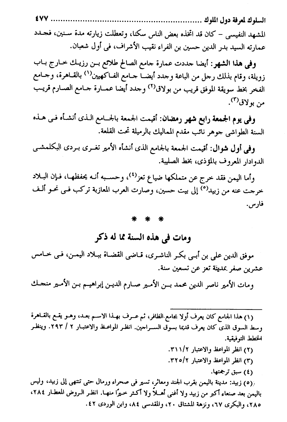 المشهد النفيسي كَانَ قد إتخذه بعض النَّاس سكنًا وتعطلت زيارته مُدَّة سِنِين فجدد عِمَارَته السَّيِّد بدر الدّين حُسَيْن بن الْفراء نقيب الْأَشْرَاف فِي أول شعْبَان. وَفِي هَذَا الشَّهْر: أَيْضا جددت عمَارَة جَامع الصَّالح طلائع بن رزيك خَارج بَاب زويلة وَقَامَ بذلك رجل من الباعة وجدد أَيْضا جَامع الفاكهيين بِالْقَاهِرَةِ وجامع الْفَخر بِخَط سويقة الْمُوفق قريب من بولاق وجدد أَيْضا عمَارَة جَامع الصارم قريب من بولاق. وَفِي يَوْم الْجُمُعَة رَابِع شهر رَمَضَان: أُقِيمَت الْجُمُعَة بالجامع الَّذِي أنشأه فِي هَذِه السّنة الطواشي جَوْهَر نَائِب مقدم المماليك بالرميلة تَحت القلعة. وَفِي أول شَوَّال: أُقِيمَت الْجُمُعَة بالجامع الَّذِي أنشأه الْأَمِير تغري بردي البكلمشي الدوادار الْمَعْرُوف بالمؤذي بِخَط الصليبة. وَأما الْيمن فقد خرج عَن متملكها ضيَاع تعز وحسبه أَنه يحفظها فَإِن الْبِلَاد خرجت عَنهُ من زبيد إِلَى بَيت حُسَيْن وَصَارَت الْعَرَب المعازبة تركب فِي نَحْو ألف فَارس. وَمَات فِي هَذِه السّنة مِمَّا لَهُ ذكر موفق الدّين عَليّ بن أبي بكر النَّاشِرِيّ قَاضِي الْقُضَاة بِبِلَاد الْيمن فِي خَامِس عشْرين صفر بِمَدِينَة تعز عَن تسعين سنة. وَمَات الْأَمِير نَاصِر الدّين مُحَمَّد بن الْأَمِير صارم الدّين إِبْرَاهِيم بن الْأَمِير منجك