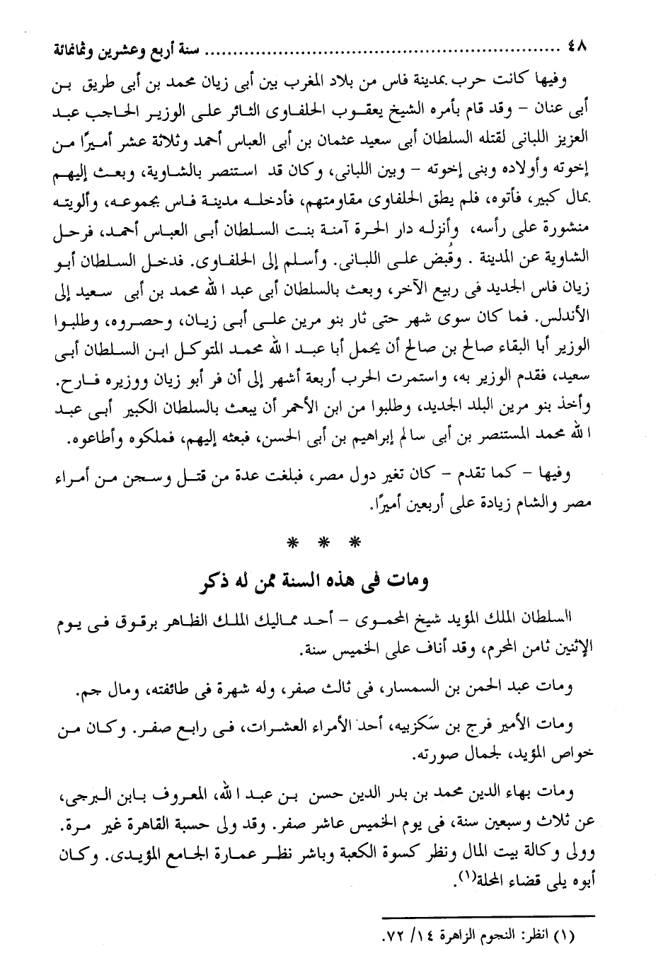 وفيهَا كَانَت حَرْب بِمَدِينَة فاس من بِلَاد الْمغرب بَين أبي زيان مُحَمَّد بن أبي طَرِيق بن أبي عنان - وَقد قَامَ بأَمْره الشَّيْخ يَعْقُوب الحلفاوي الثائر على الْوَزير الْحَاجِب عبد الْعَزِيز اللباني لقَتله السُّلْطَان أبي سعيد عُثْمَان بن أبي الْعَبَّاس أَحْمد وَثَلَاثَة عشر أَمِيرا من إخْوَته وَأَوْلَاده وَبني أخوته - وَبَين اللباني وَكَانَ قد استنصر بالشاوية وَبعث إِلَيْهِم بِمَال كَبِير فَأتوهُ فَلم يطق الحلفاوي مقاومتهم فَأدْخلهُ مَدِينَة فاس بجموعه وألويته منشورة على رَأسه وأنزله دَار الْحرَّة آمِنَة بنت السُّلْطَان أبي الْعَبَّاس أَحْمد فَرَحل الشاوية عَن الْمَدِينَة. وَقبض على اللباني. وَأسلم إِلَى الحلفاوي. فَدخل السُّلْطَان أَبُو زيان فاس الْجَدِيد فِي ربيع الآخر وَبعث بالسلطان أبي عبد الله مُحَمَّد بن أبي سعيد إِلَى الأندلس. فَمَا كَانَ سوى شهر حَتَّى ثار بَنو مرين على أبي زيان وحصروه وطلبوا الْوَزير أَبَا الْبَقَاء صَالح بن صَالح أَن يحمل أَبَا عبد الله مُحَمَّد المتَوَكل ابْن السُّلْطَان أبي سعيد فَقدم الْوَزير بِهِ واستمرت الْحَرْب أَرْبَعَة أشهر إِلَى أَن فر أَبُو زيان ووزيره فارح. وَأخذ بَنو مرين الْبَلَد الْجَدِيد وطلبوا من ابْن الْأَحْمَر أَن يبْعَث بالسلطان الْكَبِير أبي عبد الله مُحَمَّد الْمُسْتَنْصر بن أبي سَالم إِبْرَاهِيم بن أبي الْحسن فَبَعثه إِلَيْهِم فملكوه وأطاعوه. وفيهَا - كَمَا تقدم - كَانَ تغير دوَل مصر فبلغت عدَّة من قتل وسجن من أُمَرَاء مصر وَالشَّام زِيَادَة على أَرْبَعِينَ أَمِيرا. وَمَات فِي هَذِه السّنة مِمَّن لَهُ ذكر السُّلْطَان الْملك الْمُؤَيد شيخ الْحَمَوِيّ - أحد مماليك الْملك الظَّاهِر برقوق فِي يَوْم الِاثْنَيْنِ ثامن الْمحرم وَقد أناف على الْخَمِيس سنة. وَمَات عبد الرَّحْمَن بن السمسار فِي ثَالِث صفر وَله شهرة فِي طائفته وَمَال جم. وَمَات الْأَمِير مرج بن سكربيه أحد الْأُمَرَاء العشرات فِي رَابِع صفر. وَكَانَ من خَواص الْمُؤَيد الْجمال صورته. وَمَات بهاء الدّين مُحَمَّد بن بدر الدّين حسن بن عبد الله الْمَعْرُوف بِابْن الْبُرْجِي عَن ثَلَاث وَسبعين سنة فِي يَوْم الْخَمِيس عَاشر صفر. وَقد ولي حسبَة الْقَاهِرَة غير مرّة. وَولى وكَالَة بَيت المَال وَنظر كسْوَة الْكَعْبَة وباشر نظر عمَارَة الْجَامِع المؤيدي. وَكَانَ أَبوهُ يَلِي قَضَاء الْمحلة.
