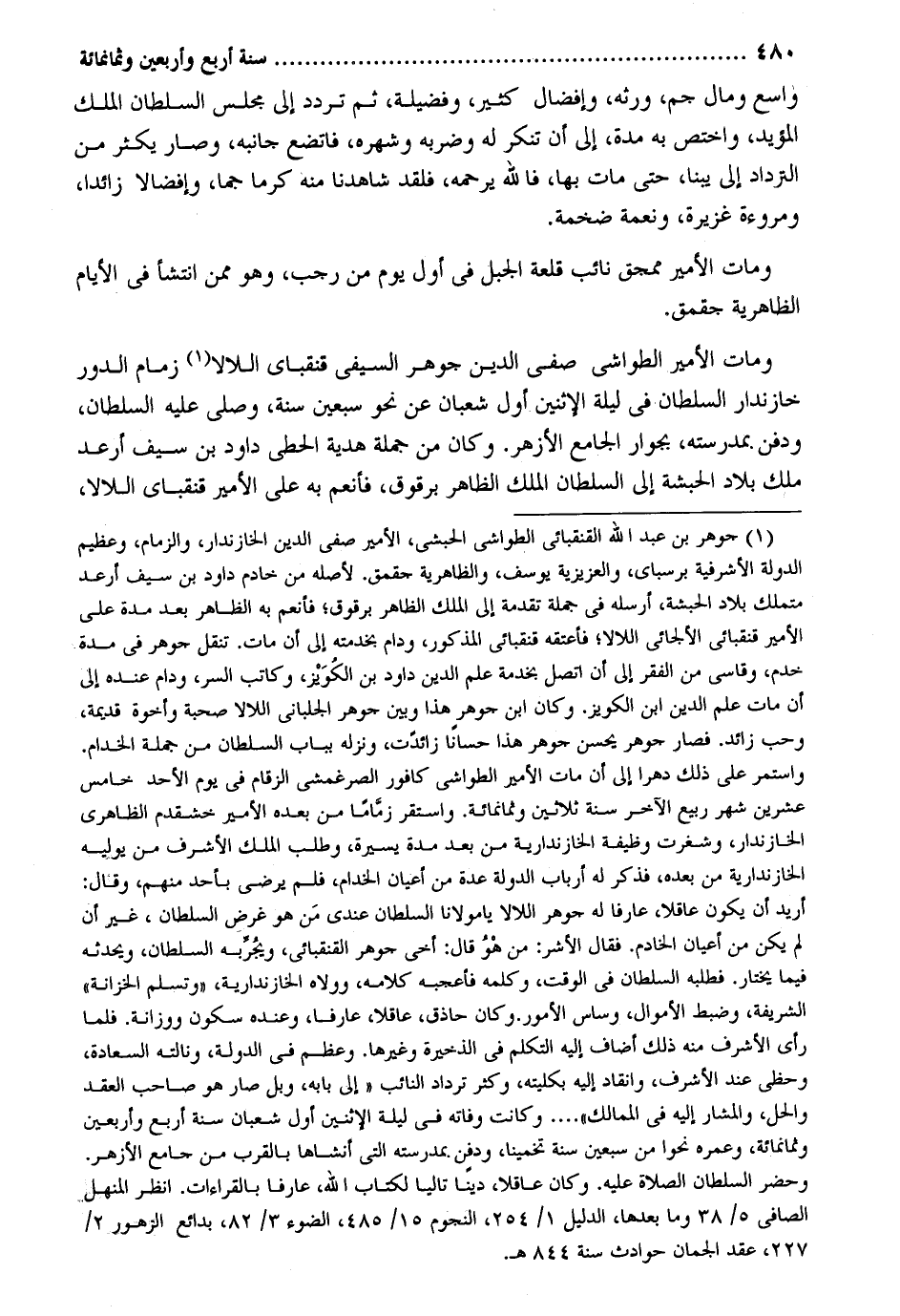 وَاسع وَمَال جم وَرثهُ وأفضال كثير وفضيلة ثمَّ تردد إِلَى مجْلِس السُّلْطَان الْملك الْمُؤَيد واختص بِهِ مُدَّة إِلَى أَن تنكر لَهُ وضربه وشهره فاتضع جَانِبه وَصَارَ يكثر من الترداد إِلَى يبنا حَتَّى مَاتَ بهَا فَالله يرحمه فَلَقَد شاهدنا مِنْهُ كرمًا جمًا وإفضالاً زَائِدا ومروءة غزيرة ونعمة ضخمة. وَمَات الْأَمِير ممجق نَائِب قلعة الْجَبَل فِي أول يَوْم من رَجَب وَهُوَ مِمَّن إنتشأ فِي الْأَيَّام الظَّاهِرِيَّة جقمق. وَمَات الْأَمِير الطواشي صفي الدّين جَوْهَر السيفي قنقباي اللالا زِمَام الدّور خازندار السُّلْطَان فِي لَيْلَة الْإِثْنَيْنِ أول شعْبَان عَن نَحْو سبعين سنة وَصلى عَلَيْهِ السُّلْطَان وَدفن بمدرسته بجوار الْجَامِع الْأَزْهَر. وَكَانَ من جملَة هَدِيَّة الحطي دَاوُد بن سيف أرعد ملك بِلَاد الْحَبَشَة إِلَى السُّلْطَان الْملك الظَّاهِر برقوق فأنعم بِهِ على الْأَمِير قنقباى اللالا