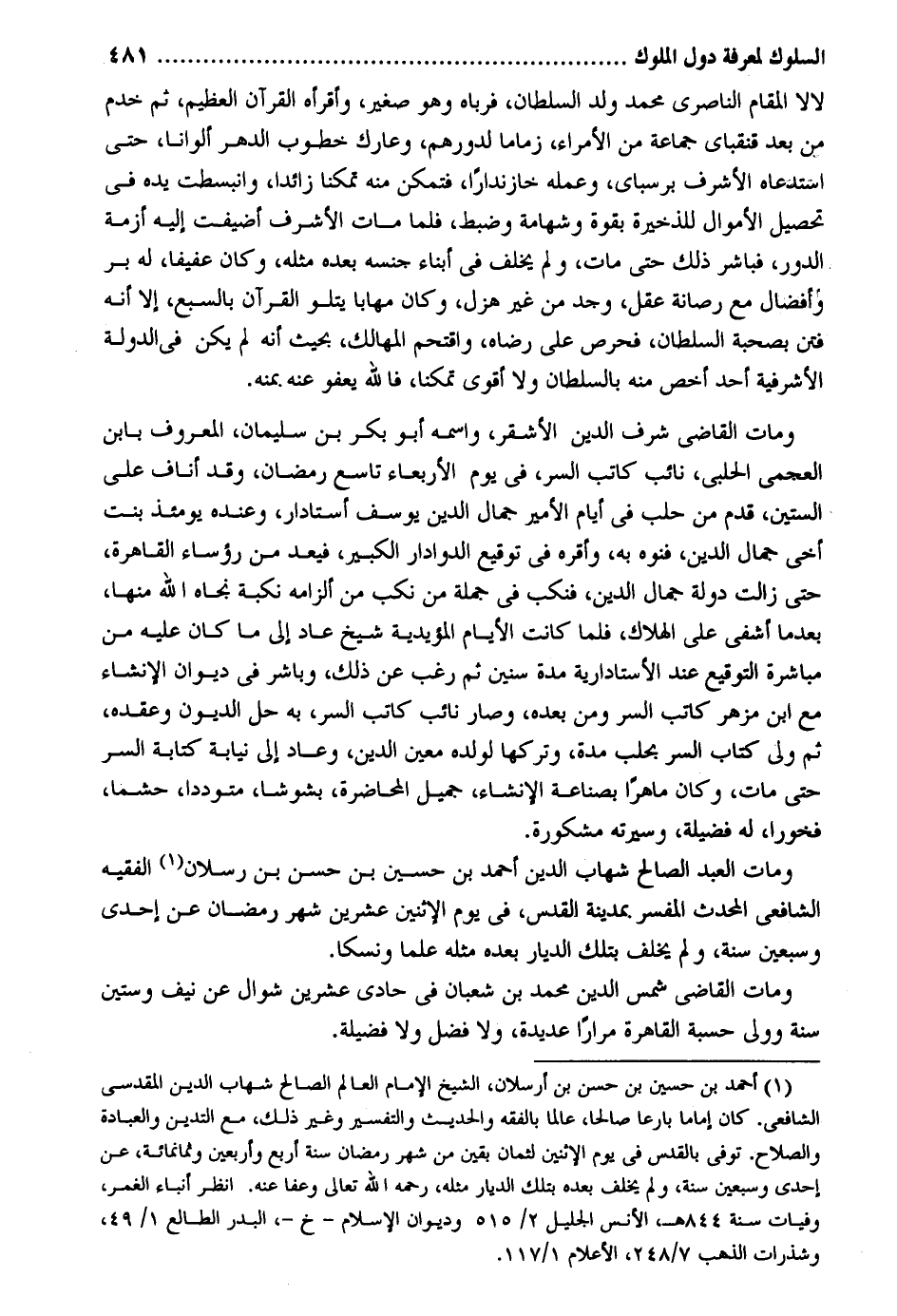 لالا الْمقَام الناصري مُحَمَّد ولد السُّلْطَان فرباه وَهُوَ صَغِير وأقرأه الْقُرْآن الْعَظِيم ثمَّ خدم من بعد قنقباي جمَاعَة من الْأُمَرَاء زمامًا لدورهم وعارك خطوب الدَّهْر ألوانًا حَتَّى إستدعاه الْأَشْرَف برسباى وَعَمله خازندارَا فَتمكن مِنْهُ مُمكنا زَائِدا وإنبسطت يَده فِي تَحْصِيل الْأَمْوَال للذخيرة بِقُوَّة وشهامة وَضبط فَلَمَّا مَاتَ الْأَشْرَف أضيفت إِلَيْهِ أزمة الدّور فباشر ذَلِك حَتَّى مَاتَ وَلم يخلف فِي أَبنَاء جنسه بعده مثله وَكَانَ عفيفًا لَهُ بر وأفضال مَعَ رصانة عقل وجد من غير هزل وَكَانَ مهابًا يَتْلُو الْقُرْآن بالسبع إِلَّا أَنه فتن بِصُحْبَة السُّلْطَان فحرص على رِضَاهُ وإقتحم المهالك بِحَيْثُ أَنه لم يكن فِي الدولة الأشرفية أحد أخص مِنْهُ بالسلطان وَلَا أقوى تمَكنا فَالله يعْفُو عَنهُ. بمنه. وَمَات القَاضِي شرف الدّين الْأَشْقَر وإسمه أَبُو بكر بن سُلَيْمَان الْمَعْرُوف بِابْن العجمي الْحلَبِي نَائِب كَاتب السِّرّ فِي يَوْم الْأَرْبَعَاء تَاسِع رَمَضَان وَقد أناف على السِّتين قدم من حلب فِي أَيَّام الْأَمِير جمال الدّين يُوسُف أستادار وَعِنْده يَوْمئِذٍ بنت أخي جمال الدّين فَنَوَّهَ بِهِ وَأقرهُ فِي توقيع الدوادار الْكَبِير فيعد من رُؤَسَاء الْقَاهِرَة حَتَّى زَالَت دولة جمال الدّين فنكب فِي جملَة من نكب من ألزامه نكبة نجاه الله مِنْهَا بَعْدَمَا أشفى على الْهَلَاك فَلَمَّا كَانَت الْأَيَّام المؤيدية شيخ عَاد إِلَى مَا كَانَ عَلَيْهِ من مُبَاشرَة الترقيع عِنْد الأستادارية مُدَّة سِنِين ثمَّ رغب عَن ذَلِك وباشر فِي ديوَان الْإِنْشَاء مَعَ ابْن مزهر كَاتب السِّرّ وَمن بعده وَصَارَ نَائِب كَاتب السِّرّ بِهِ حل الدُّيُون وعقده ثمَّ ولي كتاب السِّرّ بحلب مُدَّة وَتركهَا لوَلَده معِين الدّين وَعَاد إِلَى نِيَابَة كِتَابَة السِّرّ حَتَّى مَاتَ وَكَانَ ماهرًا بصناعة الْإِنْشَاء جميل المحاضرة بشوشًا متوددًا حشمًا فخورًا لَهُ فَضِيلَة وَسيرَته مشكورة. وَمَات العَبْد الصَّالح شهَاب الدّين أَحْمد بن حُسَيْن بن حسن بن رسْلَان الْفَقِيه الشَّافِعِي الْمُحدث الْمُفَسّر بِمَدِينَة الْقُدس فِي يَوْم الْإِثْنَيْنِ عشْرين شهر رَمَضَان عَن إِحْدَى وَسبعين سنة وَلم يخلف بِتِلْكَ الديار بعده مثله علما ونسكًا. وَمَات القَاضِي شمس الدّين مُحَمَّد بن شعْبَان فِي حادي عشْرين شَوَّال عَن نَيف وَسِتِّينَ سنة وَولي حسبَة الْقَاهِرَة مرَارًا عديدة وَلَا فضل وَلَا فَضِيلَة.