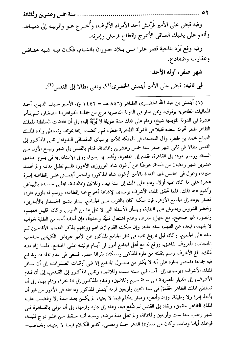 وَفِيه قبض على الْأَمِير قرمش أحد الْأُمَرَاء الألوف وَأخرج هُوَ وتمربيه إِلَى دمياط. وأنعم على يشبك الساقي الْأَعْرَج بإقطاع قرمش وإمرته. وَفِيه وَقع برد بِنَاحِيَة قصر عفرا من بِلَاد حوران بِالشَّام فَكَانَ فِيهِ شبه خنافس وعقارب وضفادع. شهر صفر أَوله الْأَحَد: فِي ثَانِيه: قبض على الْأَمِير أيتمش الخضري، وَنفى بطالا إِلَى الْقُدس.