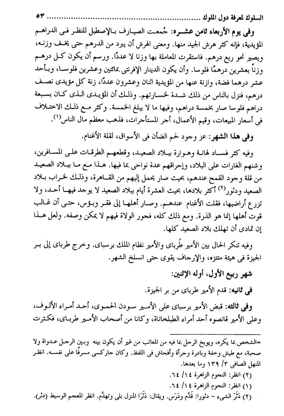 وَفِي يَوْم الْأَرْبَعَاء ثامن عشره: جمعت الصيارف بالاصطبل للنَّظَر فِي الدَّرَاهِم المؤيدية فَإِنَّهُ كثر هرش الْجيد مِنْهَا. وَمعنى الهرش أَن يبرد من الدِّرْهَم حَتَّى يجِف وَزنه وَيصير نَحْو ربع دِرْهَم. فاستقرت الْمُعَامَلَة بهَا وزنا لَا عددا. ورسم أَن يكون كل دِرْهَم وزنا بِعشْرين درهما فُلُوسًا. وَأَن يكون الدِّينَار الإفرنتي بمائتين وَعشْرين فُلُوسًا وبأحد عشر درهما فضَّة وازنة عَنْهَا من المؤيدية اثْنَان وَعِشْرُونَ عددا زنة كل مؤيدي نصف دِرْهَم فَنزل بِالنَّاسِ من ذَلِك شدَّة لخسارتهم. وَذَلِكَ أَن المؤيدي الَّذِي كَانَ بسبعة دَرَاهِم فُلُوسًا صَار بِخَمْسَة دَرَاهِم وفيهَا مَا لَا يبلغ الْخَمْسَة. وَكثر مَعَ ذَلِك الِاخْتِلَاف فِي أسعار المبيعات وقيم الْأَعْمَال أجر المستأجرات فَذهب مُعظم مَال النَّاس. وَفِي هدا الشَّهْر: عز وجود لحم الضان فِي الْأَسْوَاق لقلَّة الأغنام. وَفِيه كثر فَسَاد لهانة وهوارة بِبِلَاد الصَّعِيد وقطعهم الطرقات على الْمُسَافِرين وشنهم الغارات على الْبِلَاد وإحراقهم عدَّة نواحي بِمَا فِيهَا. هَذَا مَعَ مَا بِبِلَاد الصَّعِيد من قلَّة وجود الْقَمْح عِنْدهم بِحَيْثُ صَار يحمل إِلَيْهِم من الْقَاهِرَة وَذَلِكَ لخراب بِلَاد الصَّعِيد ودثور أَكثر بلادها بِحَيْثُ الْعشْرَة أَيَّام بِبِلَاد الصَّعِيد لَا يُوجد فِيهَا أحد وَلَا تزع أراضيها فَقلت الأغنام عِنْدهم. وَصَارَ أَهلهَا إِلَى فقر وبؤس حَتَّى أَن غَالب قوت أَهلهَا إِنَّمَا هُوَ الذّرة. وَمَعَ ذَلِك كُله فجور وَفِيه تنكر الْحَال بَين الْأَمِير طرباي والأمير نظام الْملك برسباي. وَخرج طرباي إِلَى بر الجيزة فِي هَيْئَة متنزه والإرجاف يقوى حَتَّى انْسَلَخَ الشَّهْر. شهر ربيع الأول أَوله الِاثْنَيْنِ: فِي ثَانِيه: قدم الْأَمِير طرباي من بر الجيزة. وَفِي ثالثه: قبض الْأَمِير برسباي على الْأَمِير سودن الْحَمَوِيّ أحد أُمَرَاء الألوف وعَلى الْأَمِير قانصوه أحد أُمَرَاء الطبلخاناة وَكَانَا من أَصْحَاب الْأَمِير طرباي فكثرت