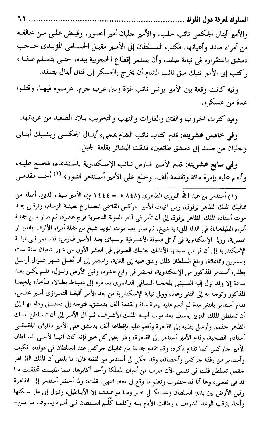 والأمير أينال الجكمي نَائِب حلب والأمير جلبان أَمِير أخور. وَقبض على من خَالفه من أُمَرَاء صفد وأعيانها. فَكتب السُّلْطَان إِلَى الْأَمِير مقبل الحسامي المؤيدي حَاجِب دمشق باستقراره فِي نِيَابَة صفد وَأَن يسْتَمر إقطاع الحجوبية بِيَدِهِ حَتَّى يتسلم صفد وَكتب إِلَى الْأَمِير تنبك ميق نَائِب الشَّام أَن يخرج بالعسكر إِلَى قتال أينال بصفد. وَفِيه كَانَت وقْعَة بَين الْأَمِير يُونُس نَائِب غَزَّة وَبَين عرب جرم هزموه فِيهَا وَقتلُوا عدَّة من عسكره. وَفِيه كثرت الحروب والفتن والغارات والنهب والتخريب بِبِلَاد الصَّعِيد من عربانها. وَفِي خَامِس عشرينه: قدم كتاب نَائِب الشَّام بمجيء أينال الجكمي ويشبك أينالي وجلبان من صفد إِلَى دمشق طائعين فدقت البشائر بقلعة الْجَبَل. وَفِي سَابِع عشرينه: قدم الْأَمِير فَارس نَائِب الْإسْكَنْدَريَّة باستدعاء فَخلع عَلَيْهِ وأنعم عَلَيْهِ بإمرة مائَة وتقدمة ألفا. وخلع على الْأَمِير أسندمر النوري أحد مقدمي