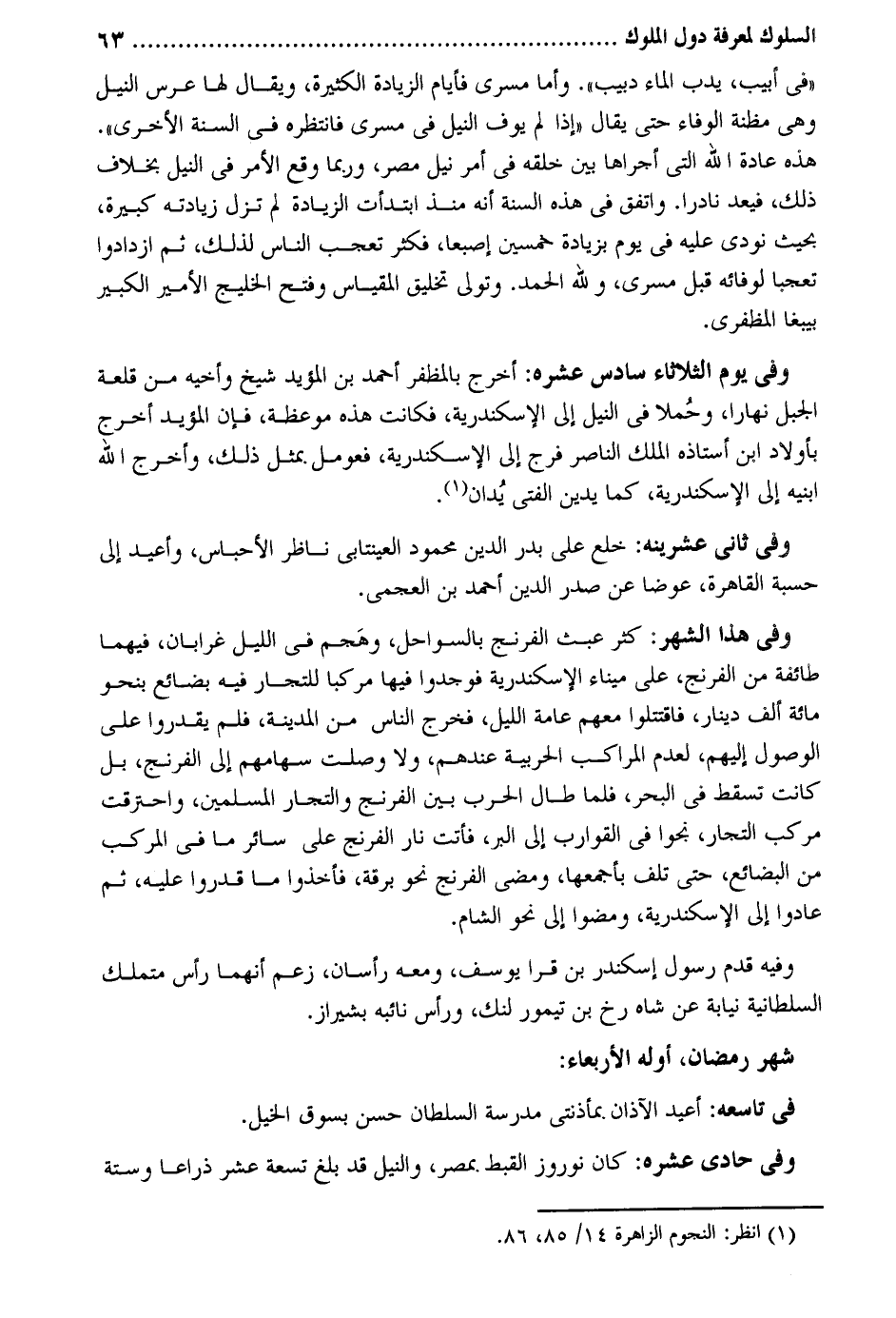 فِي أبيب يدب المَاء دَبِيب. وَأما مسرى فأيام الزِّيَادَة الْكَثِيرَة وَيُقَال لَهَا عرس النّيل وَهِي مَظَنَّة الْوَفَاء حَتَّى يُقَال إِذا لم يوف النّيل فِي مسرى فانتظره فِي السّنة الْأُخْرَى هَذِه عَادَة الله الَّتِي أجراها بَين خلقه فِي أَمر نيل مصر وَرُبمَا وَقع الْأَمر فِي النّيل بِخِلَاف ذَلِك فيعد نَادرا. وَاتفقَ فِي هَذِه السّنة أَنه مُنْذُ ابتدأت الزِّيَادَة لم تزل زِيَادَته كَبِيرَة بِحَيْثُ نُودي عَلَيْهِ فِي يَوْم بِزِيَادَة خمسين إصبعاً فَكثر تعجب النَّاس لذَلِك ثمَّ ازدادوا تَعَجبا لوفائه قبل مسرى وَللَّه الْحَمد. وَتَوَلَّى تخليق المقياس وَفتح الخليج الْأَمِير الْكَبِير بيبغا المظفري. وَفِي يَوْم الثُّلَاثَاء سادس عشره: أخرج بالمظفر أَحْمد بن الْمُؤَيد شيح وأخيه من ظ قلمة الْجَبَل نَهَارا وحملا فِي النّيل إِلَى الْإسْكَنْدَريَّة فَكَانَت هَذِه موعظة فَإِن الْمُؤَيد أخرج بأولاد ابْن أستاذه الْملك النَّاصِر فرج إِلَى الْإسْكَنْدَريَّة فعومل بِمثل ذَلِك وَأخرج ابنيه إِلَى الْإسْكَنْدَريَّة كَمَا يدين الْفَتى يدان. وَفِي ثَانِي عشرينه: خلع على بدر الدّين مَحْمُود العينتابي نَاظر الأحباس وأعيد حسبَة الْقَاهِرَة عوضا عَن صدر الدّين أَحْمد بن العجمي. وَفِي هَذَا الشَّهْر: كثر عَبث الفرنج بالسواحل وهجم فِي اللَّيْل غرابان فيهمَا طَائِفَة من الفرنج على ميناء الْإسْكَنْدَريَّة فوجدوا فِيهَا مركبا للتجار فِيهِ بضائع بِنَحْوِ مائَة ألف دِينَار فَاقْتَتلُوا مَعَهم عَامَّة اللَّيْل فَخرج النَّاس من الْمَدِينَة فَلم يقدروا على الْوُصُول إِلَيْهِم لعدم المراكب الحربية عِنْدهم وَلَا وصلت سِهَامهمْ إِلَى الفرفج بل كَانَت تسْقط فِي الْبَحْر فَلَمَّا طَال الْحَرْب بَين الفرنج والتجار الْمُسلمين واحترقت مركب التُّجَّار نَجوا فِي القوارب إِلَى الْبر فَأَتَت نَار الفرنج على سَائِر مَا فِي الْمركب من البضائع حَتَّى تلف بأجمعها وَمضى الفرنج نَحْو برقة فَأخذُوا مَا قدرُوا عَلَيْهِ ثمَّ عَادوا إِلَى الْإسْكَنْدَريَّة ومضوا إِلَى نَحْو الشَّام. وَفِيه قدم رَسُول اسكندر بن قرا يُوسُف وَمَعَهُ رأسان زعم أَنَّهُمَا رَأس متملك السُّلْطَانِيَّة نِيَابَة عَن شاه رخ بن تيمور لنك وَرَأس نَائِبه بشيراز. شهر رَمَضَان أَوله الْأَرْبَعَاء: فِي تاسعه: أُعِيد الآذان بمأذنتي مدرسة السُّلْطَان حسن بسوق الْخَيل. وَفِي حادي عشره: كَانَ نوروز القبط بِمصْر والنيل قد بلغ تِسْعَة عشر ذِرَاعا وَسِتَّة