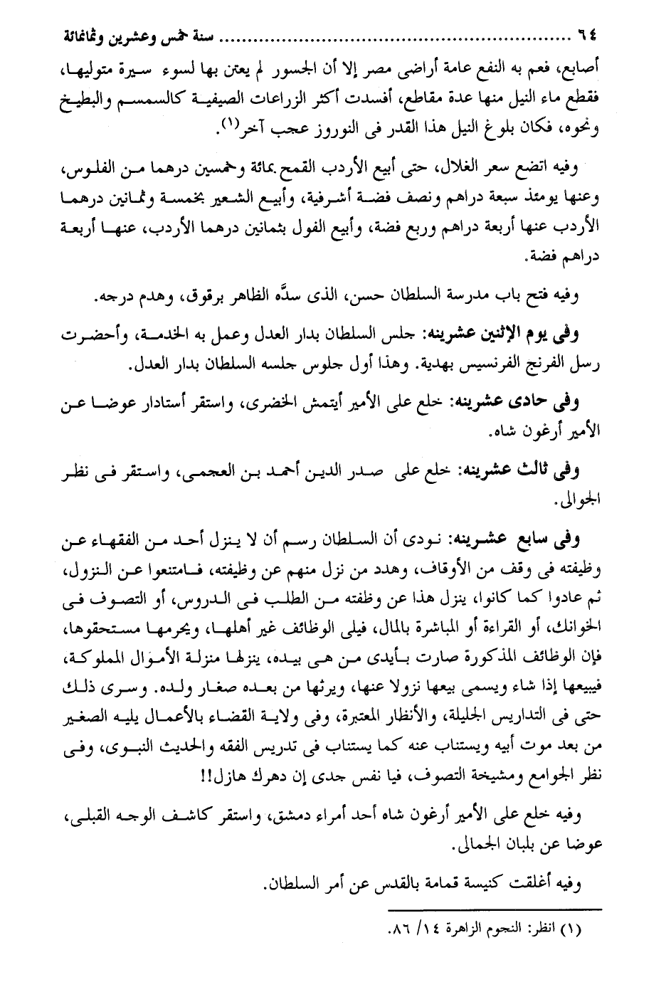 أَصَابِع فَعم بِهِ النَّفْع عَامَّة أَرَاضِي مصر إِلَّا أَن الجسور لم يعتن بهَا لسوء سيرة متوليها فَقطع مَاء النّيل مِنْهَا عدَّة مقاطع أفسدت أَكثر الزراعات الصيفية كالسمسم والبطيخ وَنَحْوه فَكَانَ بُلُوغ النّيل هَذَا الْقدر فِي النوروز عجب آخر. وَفِيه اتضع سعر الغلال حَتَّى أبيع الأردب الْقَمْح بِمِائَة وَخمسين درهما من الْفُلُوس وعنها يَوْمئِذٍ سَبْعَة دَرَاهِم وَربع فضَّة أشرفية وأبيع الشّعير بِخَمْسَة وَثَمَانِينَ درهما الأردب عَنْهَا أَرْبَعَة دَرَاهِم وَربع فضَّة وأبيع الفول بِثَمَانِينَ درهما الأردب عَنْهَا أَرْبَعَة دَرَاهِم فضَّة. وَفِيه فتح بَاب مدرسة السُّلْطَان حسن الَّذِي سَده الظَّاهِر برقوق وَهدم دَرَجه. وَفِي يَوْم الِاثْنَيْنِ عشرينه: جلس السُّلْطَان بدار الْعدْل وَعمل بِهِ الْخدمَة وأحضرت رسل الفرنج الفرنسيس بهدية. وَهَذَا أول جُلُوس جلسه السُّلْطَان بدار الْعدْل. وَفِي حادي عشرينه: خلع على الْأَمِير أيتمش الخضري وَاسْتقر أستادار عوضا عَن الْأَمِير أرغون شاه. وَفِي ثَالِث عشرينه: خلع على صدر الدّين أَحْمد بن العجمي وَاسْتقر فِي نظر الجوالي. وَفِي سَابِع عشرينه: نُودي أَن السُّلْطَان رسم أَن لَا ينزل أحد من الْفُقَهَاء عَن وظيفته فِي وقف من الْأَوْقَاف وهددمن نزل مِنْهُم عَن وظيفته فامتنعوا عَن النُّزُول ثمَّ عَادوا كَمَا كَانُوا ينزل هَذَا عَن وظيفته من الطّلب فِي الدُّرُوس أَو التصوف فِي الخوانك أَو الْقِرَاءَة أَو الْمُبَاشرَة بِالْمَالِ فيلي الْوَظَائِف غير أَهلهَا ويحرمها مستحقوها فَإِن الْوَظَائِف الْمَذْكُورَة صَارَت بأيدي من هِيَ بِيَدِهِ ينزلها منزلَة الْأَمْوَال الْمَمْلُوكَة فيبيعها إِذا شَاءَ وَيُسمى بيعهَا نزولا عَنْهَا ويرثها من بعده صغَار وَلَده. وسرى ذَلِك حَتَّى فِي التداريس الجليلة والأنظار الْمُعْتَبرَة وَفِي ولَايَة الْقَضَاء بِالْأَعْمَالِ يَلِيهِ الصَّغِير من بعد موت أَبِيه ويستناب عَنهُ كَمَا يستناب فِي تدريس الْفِقْه والْحَدِيث النَّبَوِيّ وَفِي نظر الْجَوَامِع ومشيخة التصوف فيا نفس جدي إِن دهرك هازل {} . وَفِيه خلع على الْأَمِير أرغون شاه أحد أُمَرَاء دمشق وَاسْتقر كاشف الْوَجْه القبلي عوضا عَن وَفِيه أغلقت كَنِيسَة قمامة بالقدس عَن أَمر السُّلْطَان.