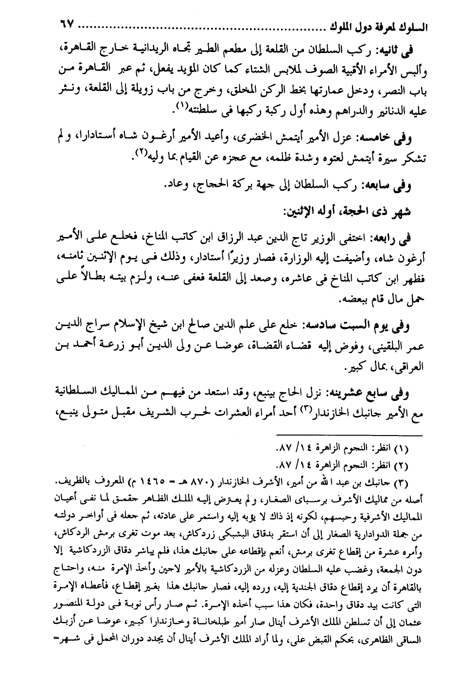 فِي ثَانِيه: ركب السُّلْطَان من القلعة إِلَى مطعم الطير تجاه الريدانية خَارج الْقَاهِرَة وألبس الْأُمَرَاء الأقبية الصُّوف لملابس الشتَاء كَمَا كَانَ الْمُؤَيد يفعل ثمَّ عبر الْقَاهِرَة من بَاب النَّصْر وَدخل عمارتها بِخَط الرُّكْن المخلق وَخرج من بَاب زويلة إِلَى القلعة ونثر عَلَيْهِ الدَّنَانِير وَالدَّرَاهِم وَهَذِه أول ركبة ركبهَا فِي سلطته وَفِي خامسه: عزل الْأَمِير أيتمش الخضري وأعيد الْأَمِير أرغون شاه أستادارا وَلم تشكر سيرة أيتمش لعتوه وَشدَّة ظلمه مَعَ عَجزه عَن الْقيام بِمَا وليه. وَفِي سابعه: ركب السُّلْطَان إِلَى جِهَة بركَة الْحجَّاج وَعَاد. شهر ذِي الْحجَّة أَوله الِاثْنَيْنِ. فِي رابعه: اختفي الْوَزير تَاج الدّين عبد الرَّزَّاق ابْن كَاتب المناخ فَخلع على الْأَمِير أرغون شاه وأضيفت إِلَيْهِ الوزارة فَصَارَ وزيراً أستادار وَذَلِكَ فِي يَوْم الِاثْنَيْنِ ثامنه فَظهر ابْن كلاب المناخ فِي عاشره وَصعد إِلَى القلعة فعفي عَنهُ وَلزِمَ بَيته بطالاً على حمل مَال قَامَ بِبَعْضِه. وَفِي يَوْم السبت سادسه: خلع على علم الدّين صَالح ابْن شيخ الْإِسْلَام سراج الدّين عمر البُلْقِينِيّ وفوض إِلَيْهِ قَضَاء الْقُضَاة عوضا عَن ولي الدّين أَبُو زرْعَة أَحْمد بن الْعِرَاقِيّ بِمَال كثير. وَفِي سَابِع عشرينه: نزل الْحَاج بينبع وَقد استعد من فيهم من المماليك السُّلْطَانِيَّة مَعَ الْأَمِير جَانِبك الخازندار أحد أُمَرَاء العشرات لِحَرْب الشريف مقبل مُتَوَلِّي يَنْبع