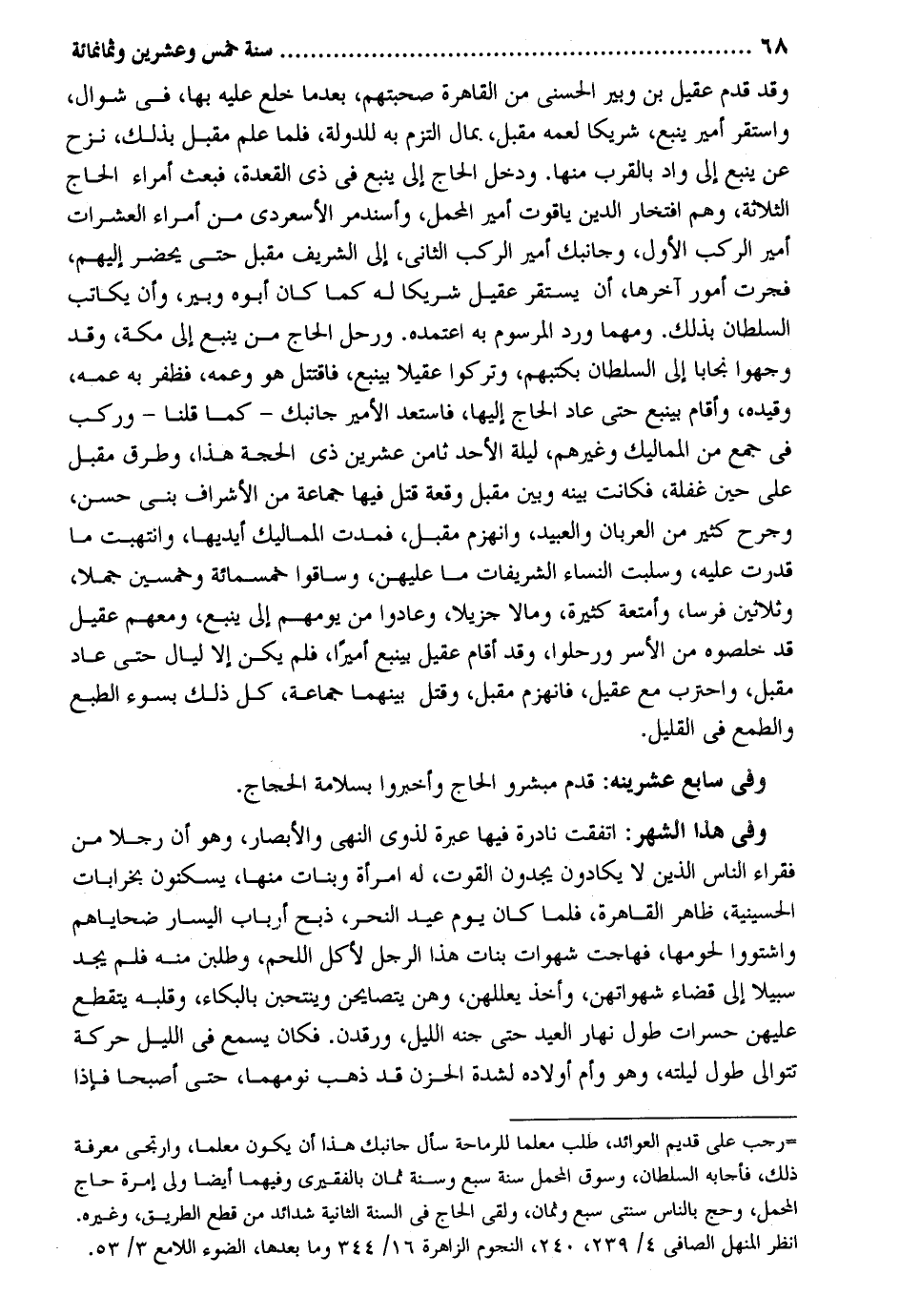 وَقد قدم عقيل بن وبير الحسني من الْقَاهِرَة صحبتهم بعد مَا خلع عَلَيْهِ بهَا فِي شَوَّال وَاسْتقر أَمِير يَنْبع شَرِيكا لِعَمِّهِ مقبل بِمَال الْتزم للدولة فَلَمَّا علم مقبل بذلك نزح عَن يَنْبع إِلَى وَاد بِالْقربِ مِنْهَا. وَدخل الْحَاج إِلَى يَنْبع فِي ذِي الْقعدَة فَبعث أُمَرَاء الْحَاج الثَّلَاثَة وهم افتخار الدّين ياقوت أَمِير الْمحمل وأسندمر الأسعردي من أُمَرَاء العشرات أَمِير الركب الأول وجانبك أَمِير الركب الثَّانِي إِلَى الشريف مقبل حَتَّى يحضر إِلَيْهِم فجرت أُمُور آخرهَا أَن يسْتَقرّ عقيل شَرِيكا لَهُ كَمَا كَانَ أَبوهُ وبير وَأَن يُكَاتب السُّلْطَان بذلك. وَمهما ورد المرسوم بِهِ اعْتَمدهُ. ورحل الْحَاج من يَنْبع إِلَى مَكَّة وَقد وجهوا نجابا إِلَى السُّلْطَان بكتبهم وَتركُوا عقيلاً بينبع فاقتتل هُوَ وَعَمه فظفر بِهِ عَمه وَقَيده وَأقَام بينبع حَتَّى عَاد الْحَاج إِلَيْهَا فاستعد الْأَمِير جَانِبك - كَمَا قُلْنَا - وَركب فِي جمع من المماليك وَغَيرهم لَيْلَة الْأَحَد ثامن عشْرين ذِي الْحجَّة هَذَا وطرق مقبل على حِين غَفلَة فَكَانَت بَينه وَبَين مقبل وقْعَة قتل فِيهَا جمَاعَة من الْأَشْرَاف بني حسن وجرح كثير من العربان وَالْعَبِيد وَانْهَزَمَ مقبل فمدت المماليك أيديها وانتهبت مَا قدرت عَلَيْهِ وسلبت النِّسَاء الشريفات مَا عَلَيْهِنَّ وَسَاقُوا خَمْسمِائَة وَخمسين رجلا وَثَلَاثِينَ فرسا وأمتعة كَثِيرَة ومالا جزيلا وعادوا من يومهم إِلَى يَنْبع وَمَعَهُمْ عقيل قد خلصوه من الْأسر ورحلوا وَقد أَقَامَ عقيل بينبع أَمِيرا فَلم يكن إِلَّا لَيَال حَتَّى عَاد مقبل واحترب مَعَ عقيل فَانْهَزَمَ مقبل وَقتل بَينهمَا جمَاعَة كل ذَلِك بِسوء الطَّبْع والطمع فِي الْقَلِيل. وَفِي سَابِع عشرينه: قدم مبشرو الْحَاج وأخبروا بسلامة الْحجَّاج. وَفِي هَذَا الشَّهْر: اتّفقت نادرة فِيهَا عِبْرَة لِذَوي النَّهْي والأبصار وَهُوَ أَن رجلا من فُقَرَاء النَّاس الَّذين لَا يكادون يَجدونَ الْقُوت لَهُ امْرَأَة وَبَنَات مِنْهَا يسكنون بخرابات الحسينية ظَاهر الْقَاهِرَة فَلَمَّا كَانَ يَوْم عيد النَّحْر ذبح أَرْبَاب الْيَسَار ضحاياهم واشتووا لحومها فهاجت شهوات بَنَات هَذَا الرجل لأكل اللَّحْم وطلبن مِنْهُ فَلم يجد سَبِيلا إِلَى قَضَاء شهواتهن وَأخذ يعللهن وَهن يتصايحن وينتحبن بالبكاء وَقَلبه يتقطع عَلَيْهِنَّ حسرات طول نَهَار الْعِيد حَتَّى جنَّة اللَّيْل ورقدن. فَكَانَ يسمع فِي اللَّيْل حَرَكَة تتوالى طول ليلته وَهُوَ وَأم أَوْلَاده لشدَّة الْحزن قد ذهب نومهما حَتَّى أصبحا فَإِذا