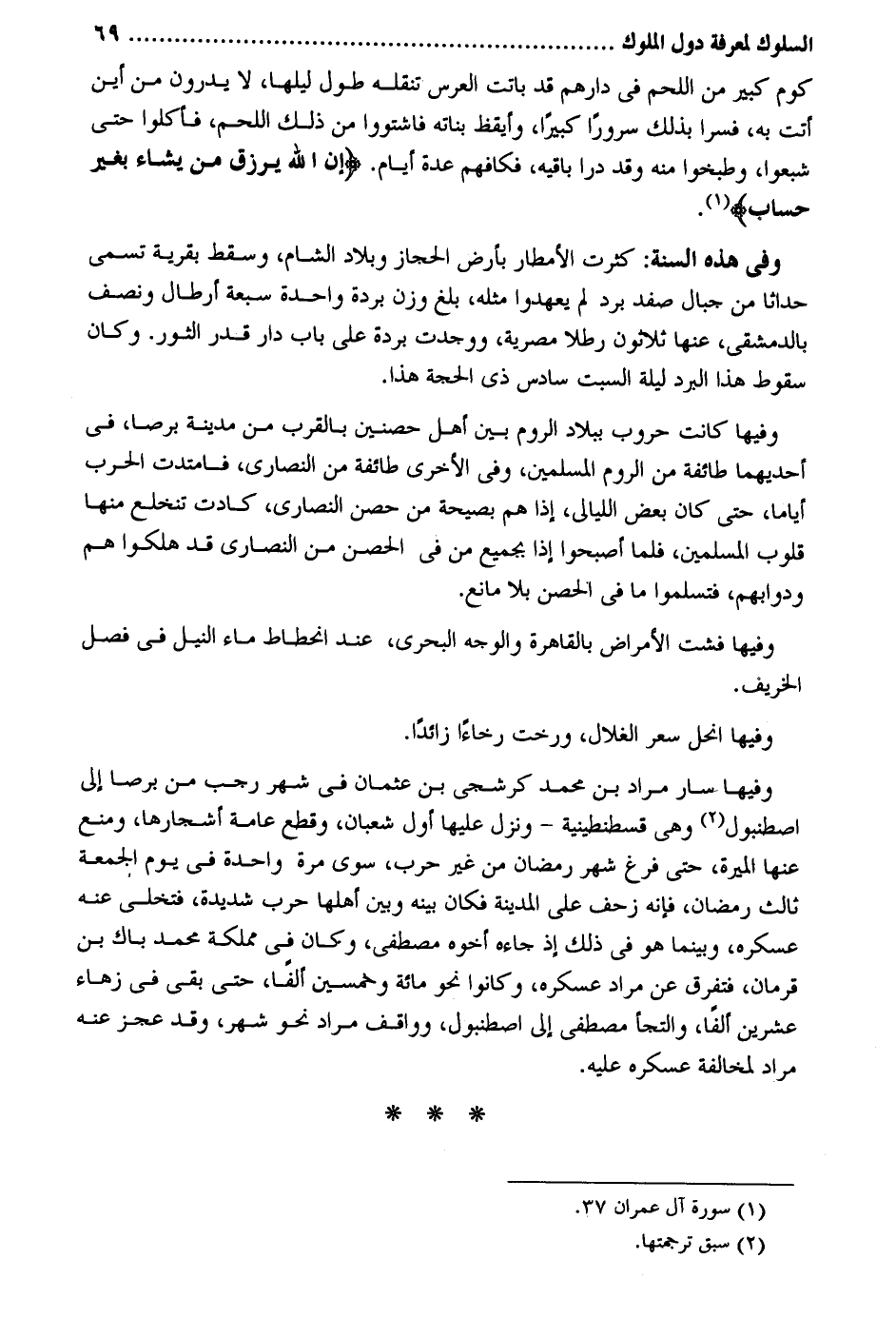 آل عمرَان 37. وَفِي هَذِه السّنة: كثرت الأمطار بِأَرْض الْحجاز وبلاد الشَّام وَسقط بقرية تسمى حداثا من جبال صفد برد لم يعهدوا مثله بلغ وزن بردة وَاحِدَة سَبْعَة أَرْطَال وَنصف بالدمشقي عَنْهَا ثَلَاثُونَ رطلا مصرية وَوجدت بردة على بَاب دَار قدر الثور. وَكَانَ سُقُوط هَذَا الْبرد لَيْلَة السبت سادس ذِي الْحجَّة هَذَا. وفيهَا كَانَت حروب بِبِلَاد الرّوم بَين أهل حصنين بِالْقربِ من مَدِينَة برصا فِي أَحدهمَا طَائِفَة من الرّوم الْمُسلمين وَفِي الْأُخْرَى طَائِفَة من النَّصَارَى فامتدت الْحَرْب عَاما حَتَّى كَانَ بعض اللَّيَالِي إِذا هم بصيحة من حصن النَّصَارَى كَادَت تنخلع مِنْهَا قُلُوب الْمُسلمين فَلَمَّا أَصْبحُوا إِذا بِجَمِيعِ من فِي الْحصن من النَّصَارَى قد هَلَكُوا هم ودوابهم فتسلموا مَا فِي الْحصن بِلَا مَانع. وفيهَا فَشَتْ الْأَمْرَاض بِالْقَاهِرَةِ وَالْوَجْه البحري عِنْد انحطاط مَاء النّيل فِي فصل الخريف. وفيهَا انحل سعر الغلال ورخت رخاءاً زَائِدا. وفيهَا سَار مُرَاد بن مُحَمَّد كوشجي بن عُثْمَان فِي شهر رَجَب من برصا إِلَى اسطنبول وَهِي قسطنطينية - وَنزل عَلَيْهَا أول شعْبَان وَقطع عَامَّة أشجارها وَمنع عَنْهَا الْميرَة حَتَّى فرغ شهر رَمَضَان من غير حَرْب سوى مرّة وَاحِدَة فِي يَوْم الْجُمُعَة ثَالِث رَمَضَان فَإِنَّهُ زحف على الْمَدِينَة فَكَانَ بَينه وَبَين أَهلهَا حَرْب شَدِيدَة فتخلى عَنهُ عسكره وبينما هُوَ فِي ذَلِك إِذْ جَاءَهُ أَخُوهُ مصطفى وَكَانَ فِي مملكة مُحَمَّد باك بن قرمان فَتفرق عَن مُرَاد عسكره وَكَانُوا نَحْو مائَة وَخمسين ألفا حَتَّى بَقِي فِي زهاء عشْرين ألفا والتجأ مصطفى إِلَى اسطنبول وواقف مُرَاد نَحْو شهر وَقد عجز عَنهُ مُرَاد لمُخَالفَة عسكره عَلَيْهِ.