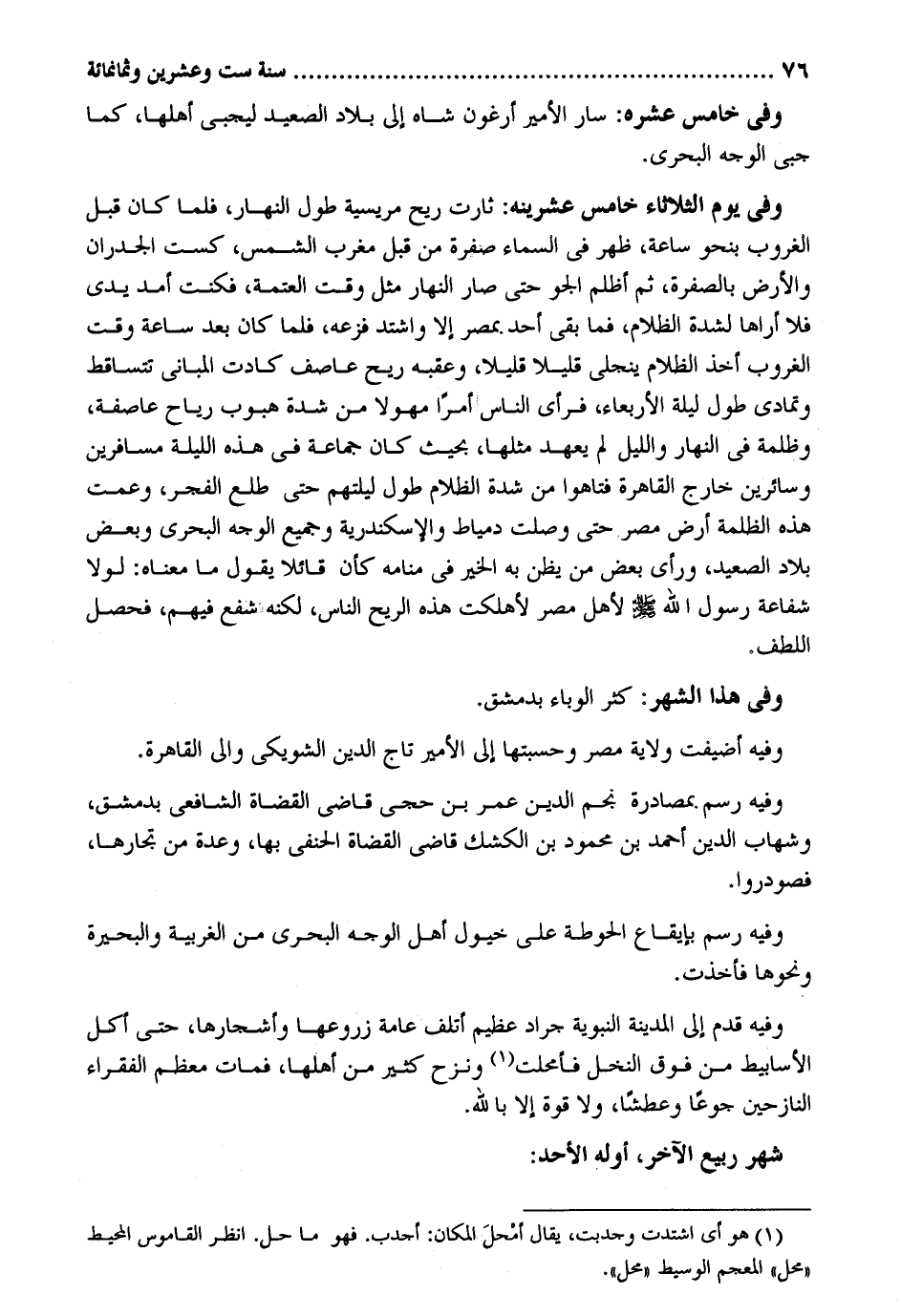 وَفِي خَامِس عشره: سَار الْأَمِير أرغون شاه إِلَى بِلَاد الصَّعِيد ليجبي أَهلهَا كَمَا جبى الْوَجْه البحري. وَفِي يَوْم الثُّلَاثَاء خَامِس عشرينه: ثارت ريح مريسية طول النَّهَار فَلَمَّا كَانَ قبل الْغُرُوب بِنَحْوِ سَاعَة ظهر فِي السَّمَاء صفرَة من قبل مغرب الشَّمْس كست الجدران وَالْأَرْض بالصفرة ثمَّ أظلم الجو حَتَّى صَار النَّهَار مثل وَقت الْعَتَمَة فَكنت أمد يَدي فَلَا أَرَاهَا لشدَّة الظلام فَمَا بَقِي أحد بِمصْر إِلَّا وَاشْتَدَّ فزعه فَلَمَّا كَانَ بعد سَاعَة وَقت الْغُرُوب أَخذ الظلام ينجلي قَلِيلا قَلِيلا وعقبه ريح عاصف كَادَت المباني تتساقط وتمادي طول لَيْلَة الْأَرْبَعَاء فَرَأى النَّاس أمرا مهولاً من شدَّة هبوب ريَاح عَاصِفَة وظلمة فِي النَّهَار وَاللَّيْل لم يعْهَد مثلهَا بِحَيْثُ كَانَ جمَاعَة فِي هَذِه اللَّيْلَة مسافرين وسائرين خَارج الْقَاهِرَة فتاهوا من شدَّة الظلام طول ليلتهم حَتَّى طلع الْفجْر وعمت هَذِه الظلمَة أَرض مصر حَتَّى وصلت دمياط والإسكندرية وَجَمِيع الْوَجْه البحري وَبَعض بِلَاد الصَّعِيد وَرَأى بعض من يظنّ بِهِ الْخَيْر فِي مَنَامه كَانَ قَائِلا يَقُول مَا مَعْنَاهُ: لَوْلَا شَفَاعَة رَسُول الله صلى الله عَلَيْهِ وَسلم لأهل مصر لأهلكت هَذِه الرّيح النَّاس لكنه شفع فيهم فَحصل اللطف. وَفِي هَذَا الشَّهْر: كثر الوباء بِدِمَشْق. وَفِيه أضيفت ولَايَة مصر وحسبتها إِلَى الْأَمِير تَاج الدّين الشويكي وَإِلَى الْقَاهِرَة. وَفِيه رسم بمصادرة نجم الدّين عمر بن حجي قَاضِي الْقُضَاة الشَّافِعِي بِدِمَشْق وشهاب الدّين أَحْمد بن مَحْمُود بن الكشك قَاضِي الْقُضَاة الْحَنَفِيّ بهَا وعدة من تجارها فصودروا. وَفِيه رسم بإيقاع الحوطة على خُيُول أهل الْوَجْه البحري من الغربية والبحيرة وَنَحْوهَا فَأخذت. وَفِيه قدم إِلَى الْمَدِينَة النَّبَوِيَّة جَراد عَظِيم أتلف عَامَّة زروعها وأشجارها حَتَّى أكل الأسابيط من فَوق النّخل فأمحلت ونزح كثير من أَهلهَا فَمَاتَ مُعظم الْفُقَرَاء النازحين جوعا وعطشاً وَلَا قُوَّة إِلَّا بِاللَّه. شهر ربيع الآخر أَوله الْأَحَد: