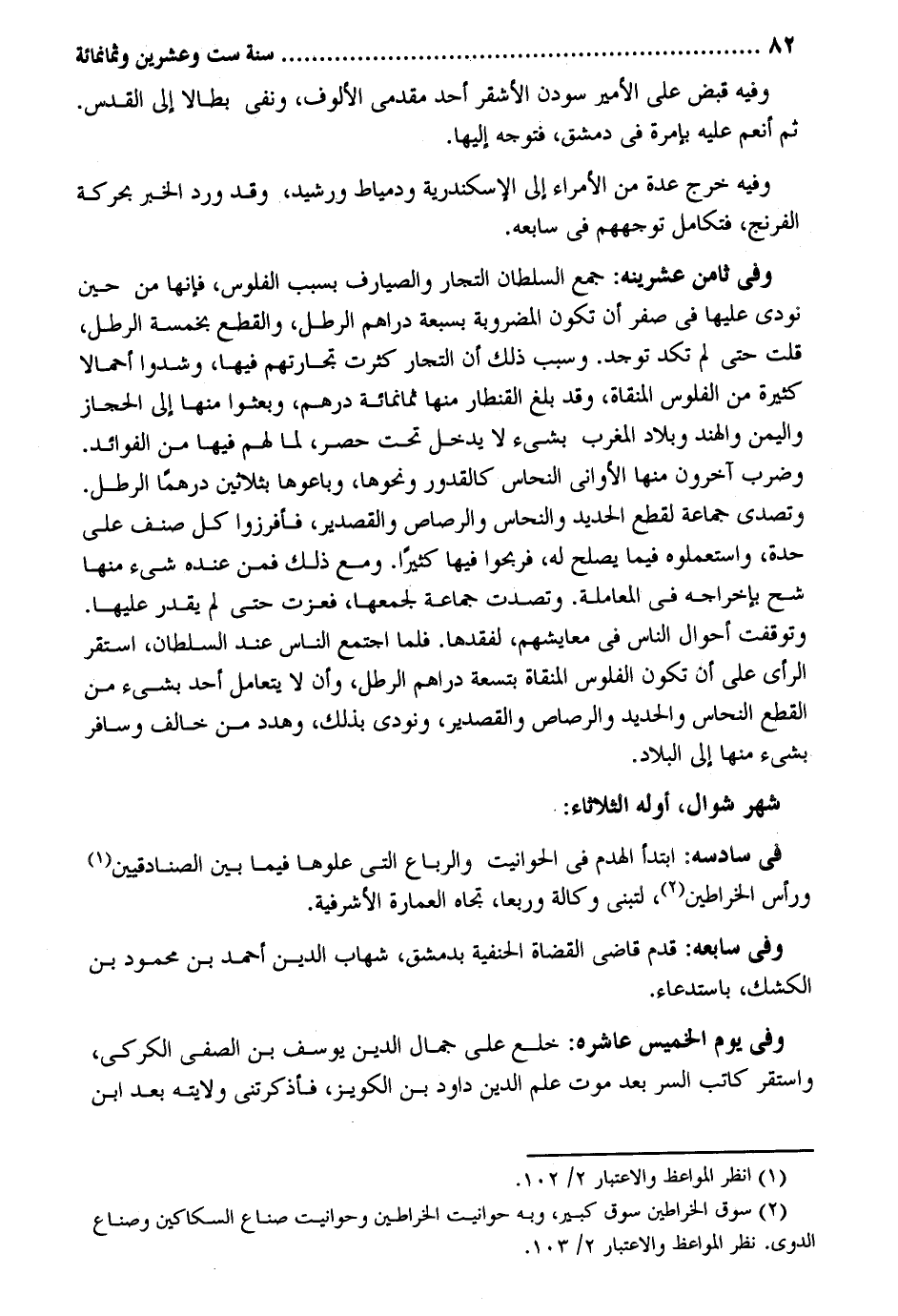 وَفِيه قبض على الْأَمِير سودن الْأَشْقَر أحد مقدمي الألوف وَنفي بطالاً إِلَى الْقُدس. ثمَّ أنعم عَلَيْهِ بإمرة فِي دمشق فَتوجه إِلَيْهَا. وَفِيه خرج عدَّة من الْأُمَرَاء إِلَى الْإسْكَنْدَريَّة ودمياط ورشيد وَقد ورد الْخَبَر بحركة الفرنج وَفِي ثامن عشرينه: جمع السُّلْطَان التُّجَّار والصيارف بِسَبَب الْفُلُوس فَإِنَّهَا من حِين نُودي عَلَيْهَا فِي صفر أَن تكون المضروبة بسبعة دَرَاهِم الرطل وَالْقطع بِخَمْسَة الرطل قلت حَتَّى لم تكد تُوجد. وَسبب ذَلِك أَن التُّجَّار كثرت تِجَارَتهمْ فِيهَا وشدوا أحمالاً كَثِيرَة من الْفُلُوس المنقاة وَقد بلغ القنطار مِنْهَا ثَمَانمِائَة دِرْهَم وبعثوا مِنْهَا إِلَى الْحجاز واليمن والهند وبلاد الْمغرب بِشَيْء لَا يدْخل تَحت حصر لما لَهُم فِيهَا من الْفَوَائِد. وَضرب آخَرُونَ مِنْهَا الْأَوَانِي النّحاس كالقدور وَنَحْوهَا وباعوها بِثَلَاثِينَ درهما الرطل. وتصدى جمَاعَة لقطع الْحَدِيد والنحاس والرصاص والقصدير فأفرزوا كل صنف على حِدة واستعملوه فِيمَا يصلح لَهُ فَرَبِحُوا فِيهَا كثيرا. وَمَعَ ذَلِك فَمن عِنْده شَيْء مِنْهَا شح بِإِخْرَاجِهِ فِي الْمُعَامَلَة. وتصدت جمَاعَة لجمعها فعزت حَتَّى لم يقدر عَلَيْهَا. وتوقفت أَحْوَال النَّاس فِي مَعَايشهمْ لفقدها. فَلَمَّا اجْتمع النَّاس عِنْد السُّلْطَان اسْتَقر الرَّأْي على أَن تكون الْفُلُوس المنقاة بِتِسْعَة دَرَاهِم الرطل وَأَن لَا يتعامل أحد بِشَيْء من الْقطع النّحاس وَالْحَدِيد والرصاص والقصدير وَنُودِيَ بذلك وهدد من خَالف وسافر بِشَيْء مِنْهَا إِلَى الْبِلَاد. شهر شَوَّال أَوله الثُّلَاثَاء: فِي سادسه: ابْتَدَأَ الْهدم فِي الحوانيت والرباع الَّتِي علوها فِيمَا بَين الصنادقيين وَرَأس الخراطين وَفِي سابعه: قدم قَاضِي الْقُضَاة الْحَنَفِيَّة بِدِمَشْق شهَاب الدّين أَحْمد بن مَحْمُود بن الكشك باستدعاء. وَفِي يَوْم الْخَمِيس عاشره: خلع على جمال الدّين يُوسُف بن الصفي الكركي وَاسْتقر كَاتب السِّرّ بعد موت علم الدّين دَاوُد بن الكويز فأذكرتني ولَايَته بعد ابْن