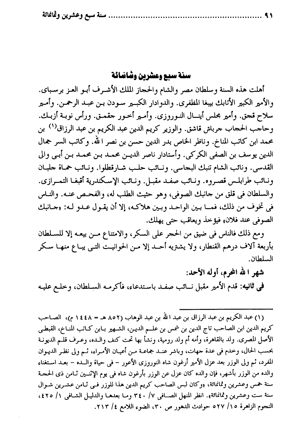 أهلت هَذِه السّنة وسلطان مصر وَالشَّام والحجاز الْملك الْأَشْرَف أَبُو الْعِزّ برسباي والأمير الْكَبِير الأتابك بيبغا المظفري. والدوادار الْكَبِير سودن بن عبد الرَّحْمَن. وأمير سلَاح قجق. وأمير مجْلِس أينال النوروزي. وأمير أخور جقمق. وَرَأس نوبَة أزبك. وحاجب الْحجاب جرباش قاشق. والوزير كريم الدّين عبد الْكَرِيم بن عبد الرَّزَّاق بن مُحَمَّد ابْن كَاتب المناخ. وناظر الْخَاص بدر الدّين حسن بن نصر الله. وَكَاتب السِّرّ جمال الدّين يُوسُف بن الصفي الكركي. وأستادار نَاصِر الدّين مُحَمَّد بن مُحَمَّد بن أبي وَالِي الْقُدسِي. ونائب الشَّام تنبك البجاسي. ونائب حلب شارقطلوا. ونائب حماة جلبان ونائب طرابلس قصروه. ونائب صفد مقبل. ونائب الْإسْكَنْدَريَّة أقبغا التمرازي. وَالسُّلْطَان فِي قلق من جَانِبك الصُّوفِي وَهُوَ حثيث الطّلب لَهُ والفحص عَنهُ. وَالنَّاس فِي تخوف من ذَلِك فَمَا بَين الْوَاحِد وَبَين هَلَاكه إِلَّا أَن يَقُول عَدو لَهُ: جَانِبك الصُّوفِي عِنْد فلَان فَيُؤْخَذ ويعاقب حَتَّى يهْلك. وَمَعَ ذَلِك فَالنَّاس فِي ضيق من الْحجر على السكر والامتناع من بَيْعه إِلَّا للسُّلْطَان بأَرْبعَة آلَاف دِرْهَم القنطار وَلَا يَشْتَرِيهِ أحد إِلَّا من الحوانيت الَّتِي يُبَاع مِنْهَا سكر السُّلْطَان. فِي ثَانِيه: قدم الْأَمِير مقبل نَائِب صفد باستدعاء فَأكْرمه السُّلْطَان وخلع عَلَيْهِ