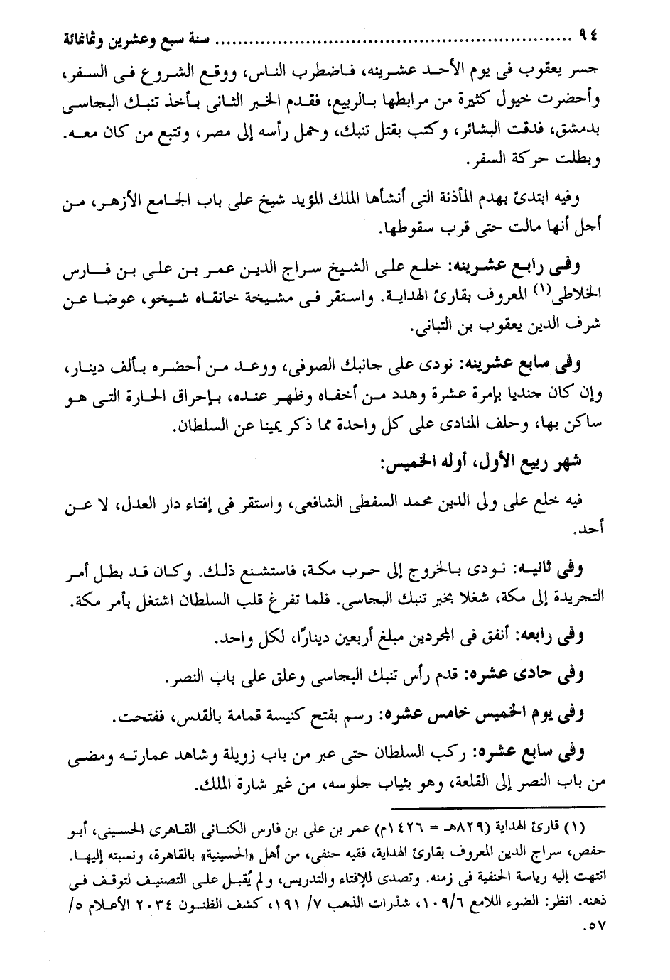 جسر يَعْقُوب فِي يَوْم الْأَحَد عشرينه فاضطرب النَّاس وَوَقع الشُّرُوع فِي السّفر وأحضرت خُيُول كَثِيرَة من مرابطها بِالربيعِ فَقدم الْخَبَر الثَّانِي بِأخذ تنبك البجاسي بِدِمَشْق فدقت البشائر وَكتب بقتل تنبك وَحمل رَأسه إِلَيّ مصر وتتبع من كَانَ مَعَه. وَبَطلَت حَرَكَة السّفر. وَفِيه ابتدئ بهدم المأذنة الَّتِي أَنْشَأَهَا الْملك الْمُؤَيد شيخ على بَاب الْجَامِع الْأَزْهَر من أجل أَنَّهَا مَالَتْ حَتَّى قرب سُقُوطهَا. وَفِي رَابِع عشرينه: خلع على الشَّيْخ سراج الدّين عمر بن عَليّ بن فَارس الخلاطي الْمَعْرُوف بقارئ الْهِدَايَة. وَاسْتقر فِي مشيخة خانقاه شيخو عوضا عَن شرف الدّين يَعْقُوب بن التباني. وَفِي سَابِع عشرينه: نُودي على جَانِبك الصُّوفِي ووعد من أحضرهُ بِأَلف دِينَار وَإِن كَانَ جندياً بإمرة عشرَة وهدد من أخفاه وَظهر عِنْده بإحراق الحارة الَّتِي هُوَ سَاكن بهَا وَحلف الْمُنَادِي على كل وَاحِدَة مِمَّا ذكر يَمِينا عَن السُّلْطَان. شهر ربيع الأول أَوله الْخَمِيس: فِيهِ خلع على ولي الدّين مُحَمَّد السفلي الشَّافِعِي وَاسْتقر فِي إِفْتَاء دَار الْعدْل لَا عَن أحد وَفِي ثَانِيه: نُودي بِالْخرُوجِ إِلَى حَرْب مَكَّة فاستشنع ذَلِك. وَكَانَ قد بَطل أَمر التجويده إِلَى مَكَّة شغلاً بِخَبَر تنبك البجاسي. فَلَمَّا تفرغ قلب السُّلْطَان اشْتغل بِأَمْر مَكَّة. وَفِي رابعه: أنْفق فِي المجردين مبلغ أَرْبَعِينَ دِينَارا لكل وَاحِد. وَفِي حادي عشره: قدم رَأس تنبك البجاسي وعلق على بَاب النَّصْر. وَفِي يَوْم الْخَمِيس خَامِس عشره: رسم بِفَتْح كَنِيسَة قمامة بالقدس ففتحت. وَفِي سَابِع عشره: ركب السُّلْطَان حَتَّى عبر من بَاب زويلة وَشَاهد عِمَارَته وَمضى من بَاب النَّصْر إِلَى القلعة وَهُوَ بِثِيَاب جُلُوسه من غير شارة الْملك.