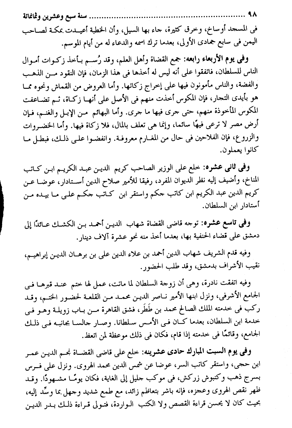 فِي الْمَسْجِد أوساخ وخرق كَثِيرَة جَاءَ بهَا السَّيْل وَأَن الْخطْبَة أُعِيدَت بِمَكَّة لصَاحب الْيمن فِي سَابِع جُمَادَى الأولى بعد مَا ترك اسْمه وَالدُّعَاء لَهُ من أَيَّام الْمَوْسِم. وَفِي يَوْم الْأَرْبَعَاء رابعه: جمع الْقُضَاة وَأهل الْعلم وَقد رسم بِأخذ زكوات أَمْوَال النَّاس للسُّلْطَان فاتفقوا على أَنه لَيْسَ لَهُ أَخذهَا فِي هَذَا الزَّمَان فَإِن النُّقُود من الذَّهَب وَالْفِضَّة وَالنَّاس مأمونون فِيهَا على إِخْرَاج زَكَاتهَا. وَأما الْعرُوض من القماش وَنَحْوه مِمَّا هُوَ بأيدي التُّجَّار فَإِن المكوس أخذت مِنْهُم فِي الأَصْل على أَنَّهَا زَكَاة ثمَّ تضاعفت المكوس الْمَأْخُوذَة مِنْهُم حَتَّى جرى فِيهَا مَا جرى. وَأما الْبَهَائِم من الْإِبِل وَالْغنم فَإِن أَرض مصر لَا ترعى فِيهَا سائماً وَإِنَّمَا هِيَ تعلف بِالْمَالِ فَلَا زَكَاة فِيهَا. وَأما الخضروات والزروع فَإِن الفلاحين فِي حَال من المغارم وَفِي ثَانِي عشره: خلع على الْوَزير الصاحب كريم الدّين عبد الْكَرِيم ابْن كَاتب المناخ وأضيف إِلَيْهِ نظر الدِّيوَان الْمُفْرد رَفِيقًا للأمير صَلَاح الدّين أستادار عوضا عَن كريم الدّين عبد الْكَرِيم ابْن كَاتب جكم وَاسْتقر ابْن كَاتب جكم على مَا بِيَدِهِ من أستادار ابْن السُّلْطَان. وَفِي تَاسِع عشره: توجه قَاضِي الْقُضَاة شهَاب الدّين أَحْمد بن الكشك عَائِدًا إِلَى دمشق على قَضَاء الْحَنَفِيَّة بهَا بعد مَا أَخذ مِنْهُ نَحْو عشرَة آلَاف دِينَار. وَفِيه قدم الشريف شهَاب الدّين أَحْمد بن عَلَاء الدّين عَليّ بن برهَان الدّين إِبْرَاهِيم نقيب الْأَشْرَاف بِدِمَشْق وَقد طلب الْحُضُور. وَفِيه اتّفقت نادرة وَهِي أَن زَوْجَة السُّلْطَان لما مَاتَت عمل لَهَا ختم عِنْد قبرها فِي الْجَامِع الأشرفي وَنزل ابْنهَا الْأَمِير نَاصِر الدّين مُحَمَّد من القلعة لحضور الْخَتْم وَقد ركب فِي خدمته الْملك الصَّالح مُحَمَّد بن ططر فشق الْقَاهِرَة من بَاب زويلة وَهُوَ فِي خدمَة ابْن السُّلْطَان بعد مَا كَانَ فِي الأمس سُلْطَانا. وَصَارَ جَالِسا بجانبه فِي ذَلِك الْجَامِع وَقَائِمًا فِي خدمته إِذا قَامَ فَكَانَ فِي ذَلِك موعظة لمن اتعظ. وَفِي يَوْم السبت الْمُبَارك حادي عشرينه: خلع على قَاضِي الْقُضَاة نجم الدّين عمر ابْن حجي وَاسْتقر كَاتب السِّرّ عوضا عَن شمس الدّين مُحَمَّد الْهَرَوِيّ. وَنزل على فرس بسرج ذهب وكنبوش زركش فِي موكب جليل إِلَى الْغَايَة فَكَانَ يَوْمًا مشهوداً. وَقد ظهر نقص الْهَرَوِيّ وعجزه فَإِنَّهُ بَاشر بتعاظم زَائِد مَعَ طمع شَدِيد وَجَهل. مِمَّا وسد إِلَيْهِ حَيْثُ كَانَ لَا يحسن قِرَاءَة الْقَصَص وَلَا الْكتب الْوَارِدَة فَتَوَلّى قِرَاءَة ذَلِك بدر الدّين
