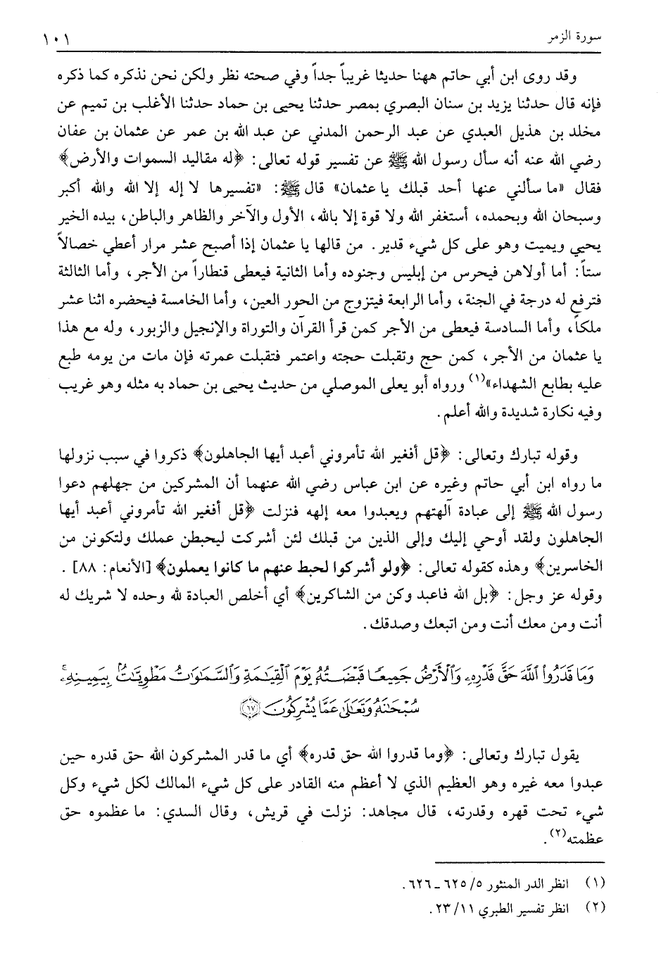 وَقَدْ رَوَى ابْنُ أَبِي حَاتِمٍ هَاهُنَا حَدِيثًا غَرِيبًا جِدًّا وفي صحته نظر ولكن نحن نَذْكُرُهُ كَمَا ذَكَرَهُ فَإِنَّهُ قَالَ حَدَّثَنَا يَزِيدُ بْنُ سِنَانٍ الْبَصْرِيُّ بِمِصْرَ حَدَّثَنَا يَحْيَى بْنُ حَمَّادٍ حَدَّثَنَا الْأَغْلَبُ بْنُ تَمِيمٍ عَنْ مُخَلَّدِ بْنِ هُذَيْلٍ الْعَبْدِيِّ عَنْ عَبْدِ الرَّحْمَنِ الْمَدَنِيِّ عَنْ عَبْدِ اللَّهِ بْنِ عُمَرَ عَنْ عُثْمَانَ بْنِ عَفَّانَ رَضِيَ اللَّهُ عَنْهُ أَنَّهُ سَأَلَ رَسُولَ اللَّهِ صَلَّى اللَّهُ عَلَيْهِ وَسَلَّمَ عن تفسير قوله تعالى: لَهُ مَقالِيدُ السَّماواتِ وَالْأَرْضِ فَقَالَ «مَا سَأَلَنِي عنها أحد قبلك يا عثمان» قال صلى الله عليه وسلم: «تَفْسِيرُهَا لَا إِلَهَ إِلَّا اللَّهُ وَاللَّهُ أَكْبَرُ وَسُبْحَانَ اللَّهِ وَبِحَمْدِهِ، أَسْتَغْفِرُ اللَّهَ وَلَا قُوَّةَ إِلَّا بِاللَّهِ، الْأَوَّلِ وَالْآخِرِ وَالظَّاهِرِ وَالْبَاطِنِ، بِيَدِهِ الْخَيْرُ يُحْيِي وَيُمِيتُ وَهُوَ عَلَى كُلِّ شَيْءٍ قَدِيرٌ. مَنْ قَالَهَا يَا عُثْمَانُ إِذَا أَصْبَحَ عَشْرَ مِرَارٍ أُعْطِيَ خِصَالًا سِتًّا: أَمَّا أُولَاهُنَّ فَيُحْرَسُ مِنْ إِبْلِيسَ وَجُنُودِهِ وَأَمَّا الثَّانِيَةُ فَيُعْطَى قِنْطَارًا مِنَ الْأَجْرِ، وَأَمَّا الثَّالِثَةُ فَتُرْفَعُ لَهُ دَرَجَةٌ فِي الْجَنَّةِ، وَأَمَّا الرَّابِعَةُ فَيَتَزَوَّجُ مِنَ الْحُورِ الْعِينِ، وَأَمَّا الْخَامِسَةُ فَيَحْضُرُهُ اثْنَا عَشَرَ مَلَكًا، وَأَمَّا السَّادِسَةُ فَيُعْطَى مِنَ الْأَجْرِ كَمَنْ قَرَأَ الْقُرْآنَ وَالتَّوْرَاةَ وَالْإِنْجِيلَ وَالزَّبُورَ، وَلَهُ مَعَ هَذَا يَا عُثْمَانُ مِنَ الْأَجْرِ، كَمَنْ حَجَّ وَتُقُبِّلَتْ حَجَّتُهُ وَاعْتَمَرَ فَتُقُبِّلَتْ عُمْرَتُهُ فَإِنْ مَاتَ من يومه طبع عليه بِطَابِعِ الشُّهَدَاءِ» «1» وَرَوَاهُ أَبُو يَعْلَى الْمُوصِلِيُّ مِنْ حَدِيثِ يَحْيَى بْنِ حَمَّادٍ بِهِ مِثْلَهُ وَهُوَ غَرِيبٌ وَفِيهِ نَكَارَةٌ شَدِيدَةٌ وَاللَّهُ أَعْلَمُ.