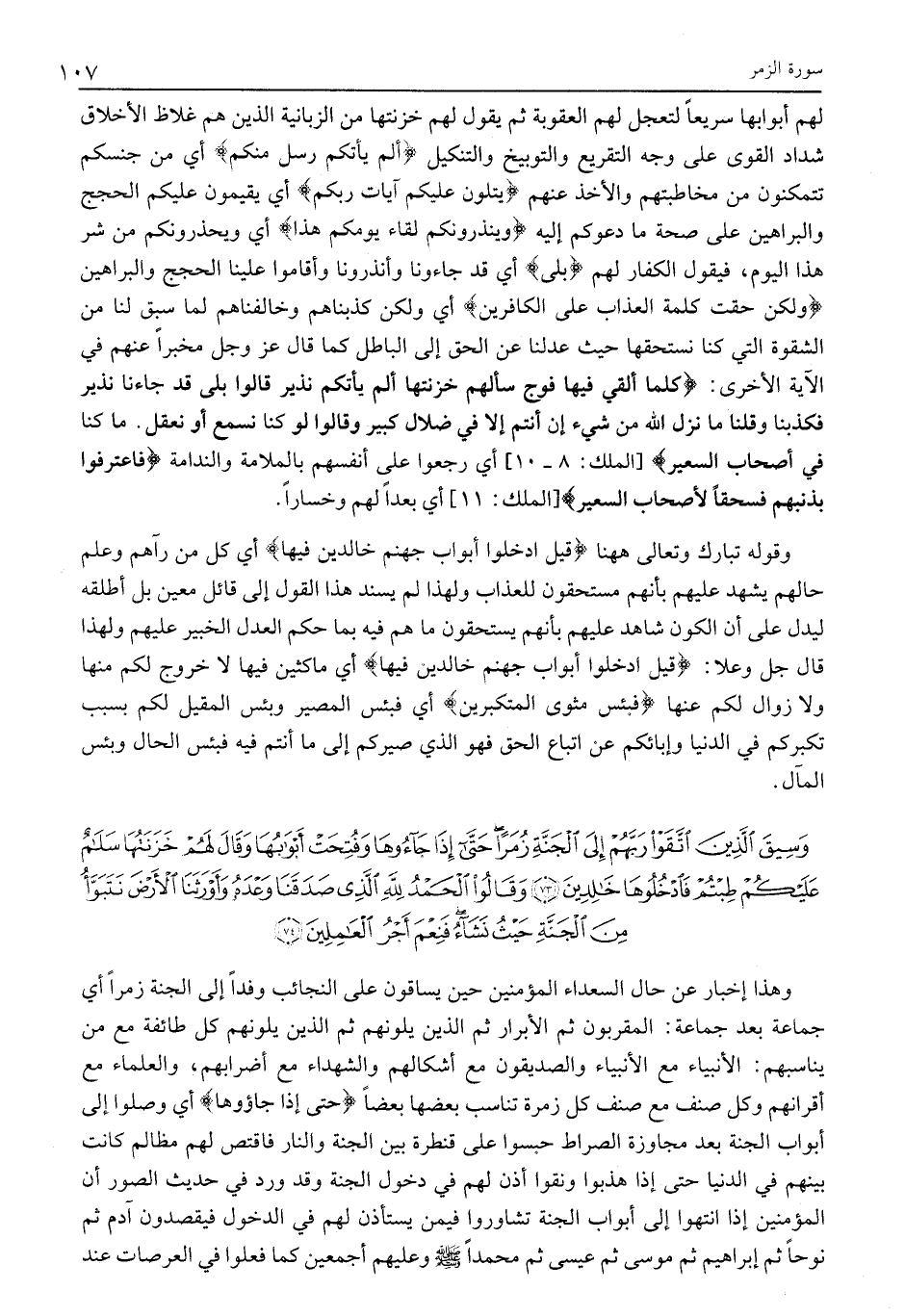 وَهَذَا إِخْبَارٌ عَنْ حَالِ السُّعَدَاءِ الْمُؤْمِنِينَ حِينَ يُسَاقُونَ عَلَى النَّجَائِبِ وَفْدًا إِلَى الْجَنَّةِ زُمَرًا أَيْ جَمَاعَةً بَعْدَ جَمَاعَةٍ: الْمُقَرَّبُونَ ثُمَّ الْأَبْرَارُ ثُمَّ الَّذِينَ يَلُونَهُمْ ثُمَّ الَّذِينَ يَلُونَهُمْ كُلُّ طَائِفَةٍ مَعَ مَنْ يُنَاسِبُهُمْ: الْأَنْبِيَاءُ مَعَ الْأَنْبِيَاءِ وَالصِّدِّيقُونَ مَعَ أَشْكَالِهِمْ وَالشُّهَدَاءُ مَعَ أَضَرَابِهِمْ، وَالْعُلَمَاءُ مَعَ أَقْرَانِهِمْ وَكُلُّ صِنْفٍ مَعَ صِنْفٍ كُلُّ زُمْرَةٍ تُنَاسِبُ بعضها بعضا حَتَّى إِذا جاؤُها أَيْ وَصَلُوا إِلَى أَبْوَابِ الْجَنَّةِ بَعْدَ مُجَاوَزَةِ الصِّرَاطِ حُبِسُوا عَلَى قَنْطَرَةٍ بَيْنَ الْجَنَّةِ وَالنَّارِ فَاقْتَصَّ لَهُمْ مَظَالِمُ كَانَتْ بَيْنَهُمْ فِي الدُّنْيَا حَتَّى إِذَا هُذِّبُوا وَنُقُّوا أُذِنَ لَهُمْ فِي دُخُولِ الْجَنَّةِ وَقَدْ وَرَدَ فِي حَدِيثِ الصُّوَرِ أَنَّ الْمُؤْمِنِينَ إِذَا انْتَهَوْا إِلَى أَبْوَابِ الْجَنَّةِ تشاوروا فيمن يستأذن لهم في الدخول فَيَقْصِدُونَ آدَمَ ثُمَّ نُوحًا ثُمَّ إِبْرَاهِيمَ ثُمَّ مُوسَى ثم عيسى ثم محمدا صلى الله عليه وسلم وعليهم أَجْمَعِينَ كَمَا فَعَلُوا فِي الْعَرَصَاتِ عِنْدَ