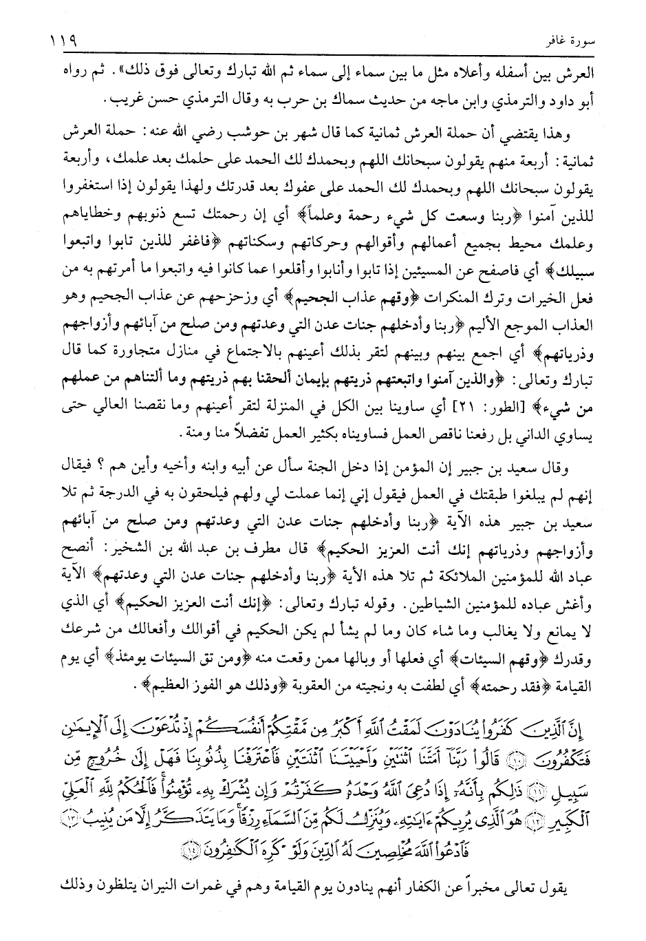 وَهَذَا يَقْتَضِي أَنَّ حَمَلَةَ الْعَرْشِ ثَمَانِيَةٌ كَمَا قَالَ شَهْرُ بن حوشب رضي الله عنه: حَمَلَةُ الْعَرْشِ ثَمَانِيَةٌ: أَرْبَعَةٌ مِنْهُمْ يَقُولُونَ سُبْحَانَكَ اللَّهُمَّ وَبِحَمْدِكَ لَكَ الْحَمْدُ عَلَى حِلْمِكَ بَعْدَ عِلْمِكَ، وَأَرْبَعَةٌ يَقُولُونَ سُبْحَانَكَ اللَّهُمَّ وَبِحَمْدِكَ لَكَ الْحَمْدُ عَلَى عَفْوِكَ بَعْدَ قُدْرَتِكَ وَلِهَذَا يَقُولُونَ إِذَا اسْتَغْفَرُوا لِلَّذِينِ آمَنُوا رَبَّنا وَسِعْتَ كُلَّ شَيْءٍ رَحْمَةً وَعِلْماً أَيْ إِنَّ رَحْمَتَكَ تَسَعُ ذُنُوبَهُمْ وَخَطَايَاهُمْ وَعِلْمُكَ مُحِيطٌ بِجَمِيعِ أَعْمَالِهِمْ وَأَقْوَالِهِمْ وَحَرَكَاتِهِمْ وَسَكَنَاتِهِمْ فَاغْفِرْ لِلَّذِينَ تابُوا وَاتَّبَعُوا سَبِيلَكَ أَيْ فَاصْفَحْ عَنِ الْمُسِيئِينَ إِذَا تَابُوا وَأَنَابُوا وَأَقْلَعُوا عَمَّا كَانُوا فِيهِ وَاتَّبَعُوا مَا أَمَرْتَهُمْ بِهِ مِنْ فِعْلِ الْخَيْرَاتِ وَتَرْكِ الْمُنْكَرَاتِ وَقِهِمْ عَذابَ الْجَحِيمِ أَيْ وَزَحْزِحْهُمْ عَنْ عَذَابِ الْجَحِيمِ وَهُوَ الْعَذَابُ الْمُوجِعُ الْأَلِيمُ رَبَّنا وَأَدْخِلْهُمْ جَنَّاتِ عَدْنٍ الَّتِي وَعَدْتَهُمْ وَمَنْ صَلَحَ مِنْ آبائِهِمْ وَأَزْواجِهِمْ وَذُرِّيَّاتِهِمْ أَيْ اجْمَعْ بَيْنَهُمْ وَبَيْنَهُمْ لِتَقَرَّ بِذَلِكَ أَعْيُنُهُمْ بِالِاجْتِمَاعِ فِي مَنَازِلَ متجاورة كما قال تبارك وتعالى: وَالَّذِينَ آمَنُوا وَاتَّبَعَتْهُمْ ذُرِّيَّتُهُمْ بِإِيمانٍ أَلْحَقْنا بِهِمْ ذُرِّيَّتَهُمْ وَما أَلَتْناهُمْ مِنْ عَمَلِهِمْ مِنْ شَيْءٍ [الطُّورِ: 21] أَيْ سَاوَيْنَا بَيْنَ الْكُلِّ فِي الْمَنْزِلَةِ لِتَقَرَّ أَعْيُنُهُمْ وَمَا نَقَصْنَا الْعَالِيَ حَتَّى يُسَاوِيَ الداني بل رفعنا ناقص الْعَمَلِ فَسَاوَيْنَاهُ بِكَثِيرِ الْعَمَلِ تُفَضُّلًا مِنَّا وَمِنَّةً.