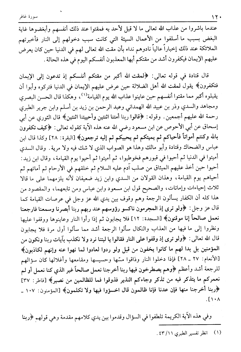 قَالَ قَتَادَةُ في قوله تعالى: لَمَقْتُ اللَّهِ أَكْبَرُ مِنْ مَقْتِكُمْ أَنْفُسَكُمْ إِذْ تُدْعَوْنَ إِلَى الْإِيمانِ فَتَكْفُرُونَ يَقُولُ لَمَقْتُ اللَّهِ أَهْلَ الضَّلَالَةِ حِينَ عُرِضَ عَلَيْهِمُ الْإِيمَانُ فِي الدُّنْيَا فَتَرَكُوهُ وَأَبَوْا أَنْ يَقْبَلُوهُ أَكْبَرُ مِمَّا مَقَتُوا أَنْفُسَهُمْ حِينَ عَايَنُوا عَذَابَ اللَّهِ يَوْمَ الْقِيَامَةِ «1» ، وَهَكَذَا قَالَ الْحَسَنُ الْبَصْرِيُّ وَمُجَاهِدٌ وَالسُّدِّيُّ وذر بن عبيد اللَّهِ الْهَمْدَانِيُّ وَعَبْدُ الرَّحْمَنِ بْنُ زَيْدِ بْنِ أسلم وابن جرير الطبري رحمة الله عليهم أجمعين. وَقَوْلِهِ: قالُوا رَبَّنا أَمَتَّنَا اثْنَتَيْنِ وَأَحْيَيْتَنَا اثْنَتَيْنِ قَالَ الثَّوْرِيُّ عَنْ أَبِي إِسْحَاقَ عَنْ أَبِي الْأَحْوَصِ عَنِ ابْنِ مَسْعُودٍ رَضِيَ اللَّهُ عَنْهُ هَذِهِ الْآيَةُ كَقَوْلِهِ تَعَالَى: كَيْفَ تَكْفُرُونَ بِاللَّهِ وَكُنْتُمْ أَمْواتاً فَأَحْياكُمْ ثُمَّ يُمِيتُكُمْ ثُمَّ يُحْيِيكُمْ ثُمَّ إِلَيْهِ تُرْجَعُونَ [الْبَقَرَةِ: 28] وَكَذَا قَالَ ابْنُ عَبَّاسٍ وَالضَّحَّاكُ وَقَتَادَةُ وَأَبُو مَالِكٍ وَهَذَا هُوَ الصَّوَابُ الَّذِي لَا شَكَّ فِيهِ وَلَا مِرْيَةَ. وَقَالَ السُّدِّيُّ أُمِيتُوا فِي الدُّنْيَا ثُمَّ أُحْيَوْا فِي قُبُورِهِمْ فَخُوطِبُوا، ثُمَّ أُمِيتُوا ثُمَّ أُحْيَوْا يَوْمَ الْقِيَامَةِ، وَقَالَ ابْنُ زَيْدٍ: